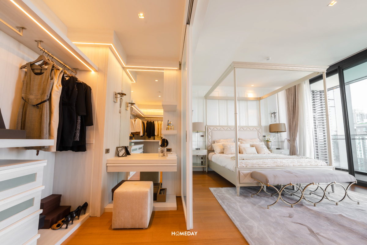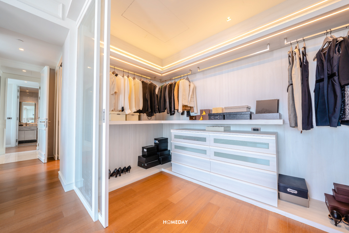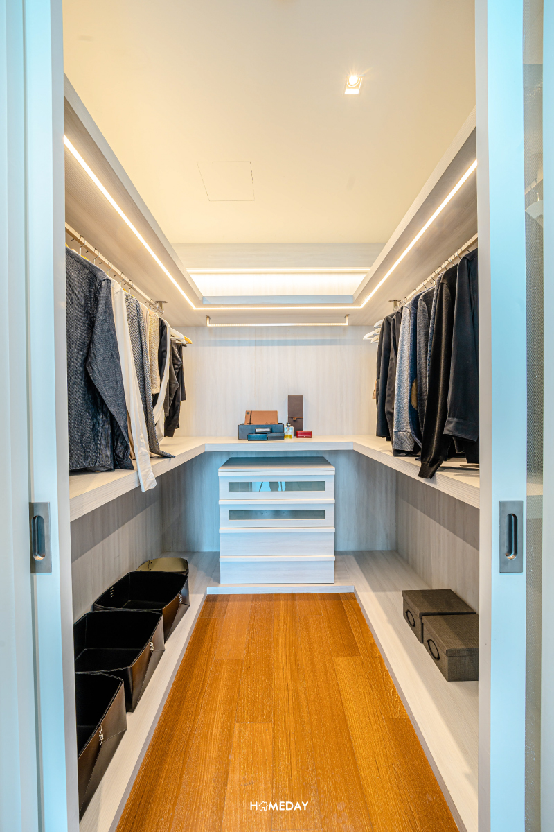 Walk-in Closet ทำให้อย่างใส่ใจ โดยแบ่งออกเป็น 2 พื้นที่ส่วนตัวแยกกัน คุณผู้ชายและคุณผู้หญิงสามารถแบ่งพื้นที่จัดเก็บแยกออกจากกันได้อย่างเป็นสัดส่วนเลยครับ
