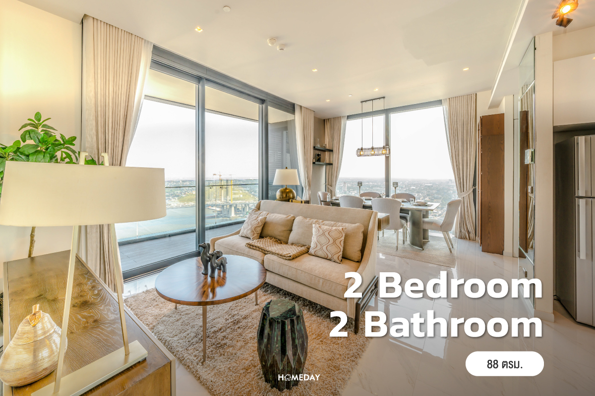 มาดูห้องขนาด 2 ห้องนอน 2 ห้องน้ำกันบ้างครับ จากทางเข้าจะเจอส่วนของมุมนั่งเล่น, มุมนั่งรับประทานอาหาร, ครัว และระเบียงของห้องก่อนเลยครับ พื้นที่ส่วนตัวอย่างห้องนอนจะอยู่ลึกเข้าไปทางด้านซ้ายของห้อง เพื่อความเป็นส่วนตัวนั่นเองครับ พื้นที่ส่วนกลางของห้องได้ช่องแสงขนาดใหญ่ 2 ฝั่ง รับวิวเต็มที่ สามารถวางชุดโซฟาขนาดใหญ่พร้อมโต๊ะกลางและชั้นทีวีได้สบาย ๆ ส่วนของชุดโต๊ะ เก้าอี้ สำหรับรับประทานอาหารก็วางได้อยู่ที่ประมาณ 4-6 ที่นั่ง ระเบียงของห้องมีขนาดกว้าง ใช้งานได้จริง จะเปิดรับลมหรือใช้เป็นพื้นที่นั่งชิลล์ Outdoor ก็ได้เช่นกันครับ