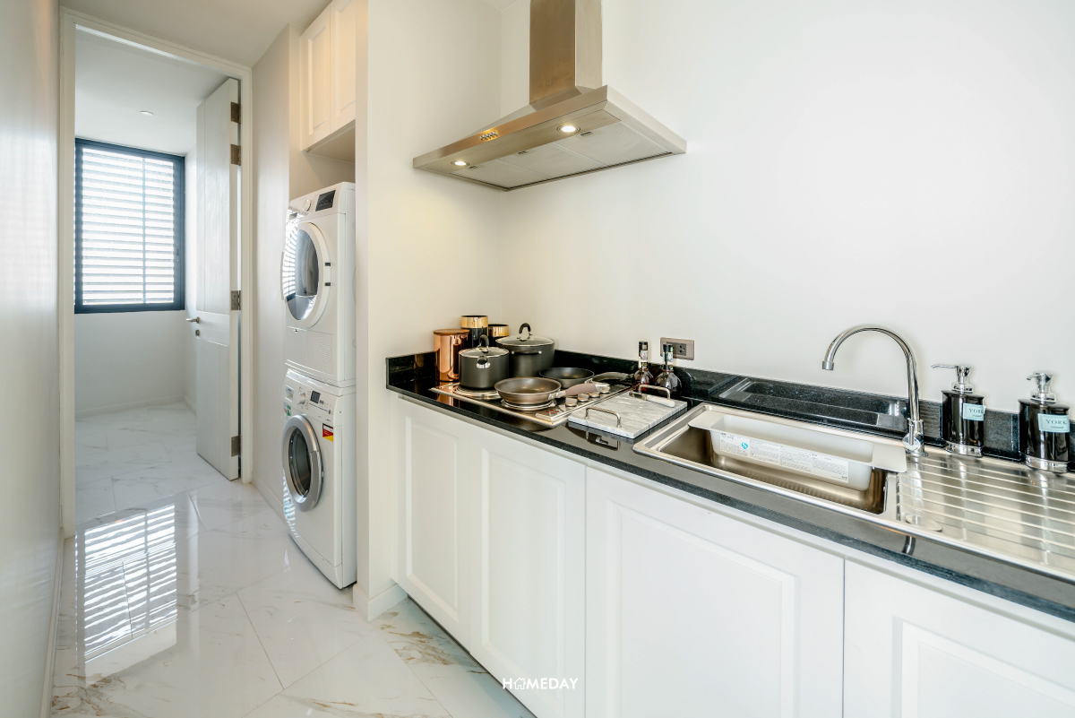 หากมื้อไหนอยากใช้งานครัวมากเป็นพิเศษ เช่น อาหารไทย ที่มีกลิ่นค่อนข้างแรง ด้านหลังครัวฝรั่งมีพื้นที่ปิดที่เป็นห้อง Maid อยู่ครับ ด้านในมีชุดครัวแยกอีกชุด มีพื้นที่สำหรับวางเครื่องซักและอบผ้า รวมไปถึงมีห้องขนาดเล็กที่สามารถทำเป็นห้องนอนของ Maid หรือจะใช้งานเป็นห้องเก็บของก็ได้เช่นกันครับ