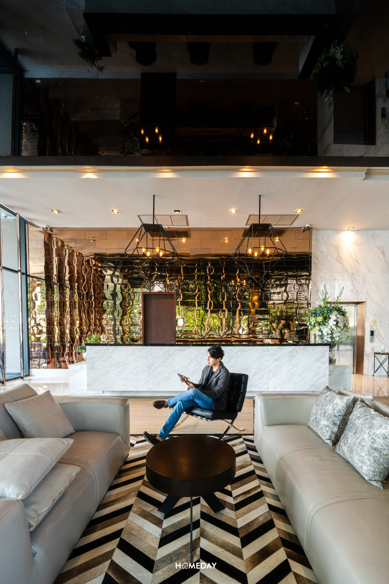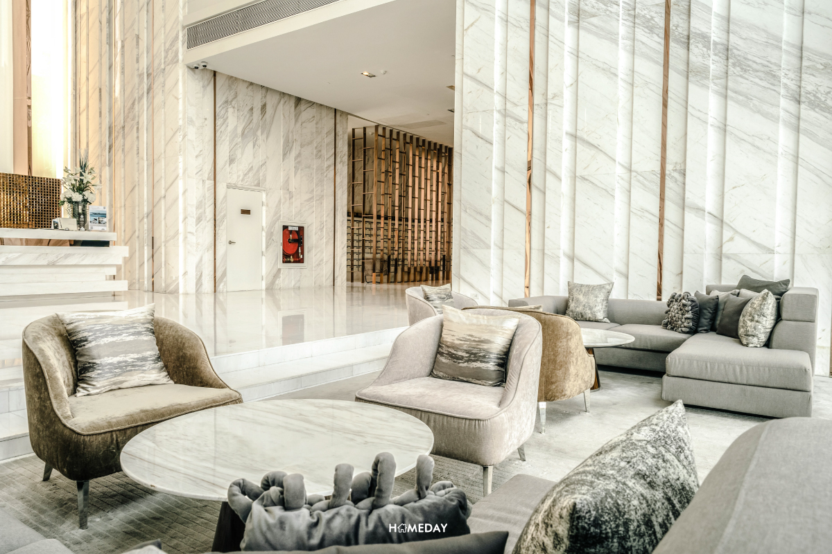 ล็อบบี้ต้อนรับ ทันสมัยและกว้างขวาง ให้ความรู้สึกเสมือนได้พักอาศัยในรีสอร์ต การตกแต่งสง่างาม ประณีต ด้วยงานดีไซน์ระดับมาสเตอร์พีซจากฝีมือของดีไซเนอร์ระดับโลกอย่าง Palmer and Turner และ PIA Interior ในขณะเดียวกันก็ให้ความรู้สึกสงบและให้ความรู้สึกสะดวกสบายเหมือนบ้าน ผนังตกแต่งประดับประดาด้วยหินอ่อนบริสุทธิ์นำเข้า เพดานสูงถึง 12 เมตร ให้ความรู้สึกโปร่ง โล่ง เปิดรับแสงแดดอ่อน ๆ และลมเย็น ๆ ได้ตลอดเวลาครับ