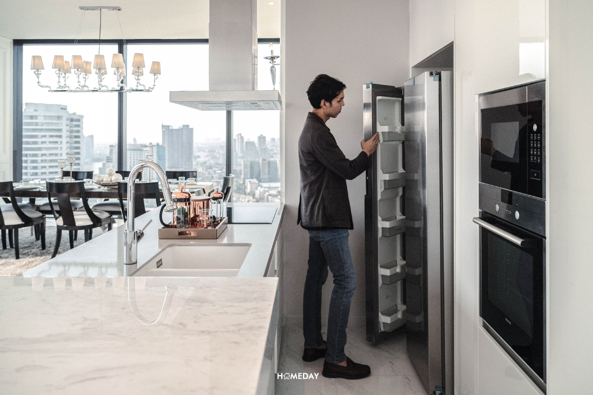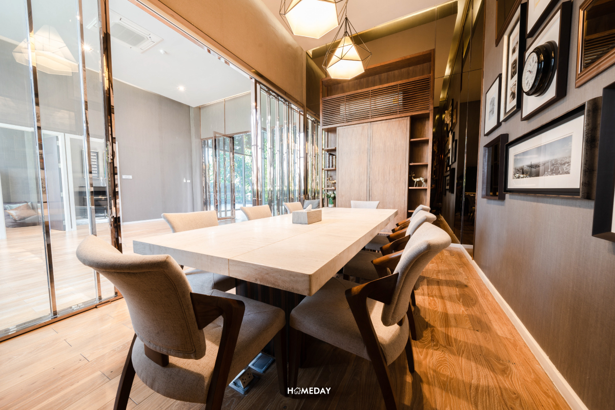 พื้นที่ครัวจะแบ่งเป็น 2 ส่วน โดยส่วนที่เปิดโล่งสไตล์ครัวฝรั่งจะอยู่กึ่งกลางระหว่างมุมนั่งเล่นและมุมนั่งรับประทานอาหาร ได้ชุดครัวแบบไอส์แลนด์ตามภาพเลยครับ ทำอาหารไป มองวิวไปได้แบบเพลิน ๆ ส่วนมุมวางชุดโต๊ะเก้าอี้สำหรับนั่งรับประทานอาหาร ไม่ว่าจะนั่งมุมไหน ก็มองเห็นวิวสวย ๆ ด้านนอกอาคารได้ทั้งหมด เพราะมุมนี้ได้บานกระจกมา 2 ฝั่งครับ