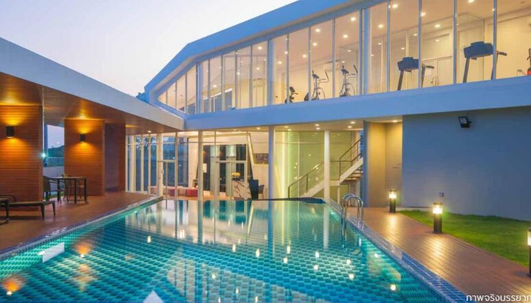 สระว่ายน้ำกลางแจ้งพร้อมที่นั่งริมสระ