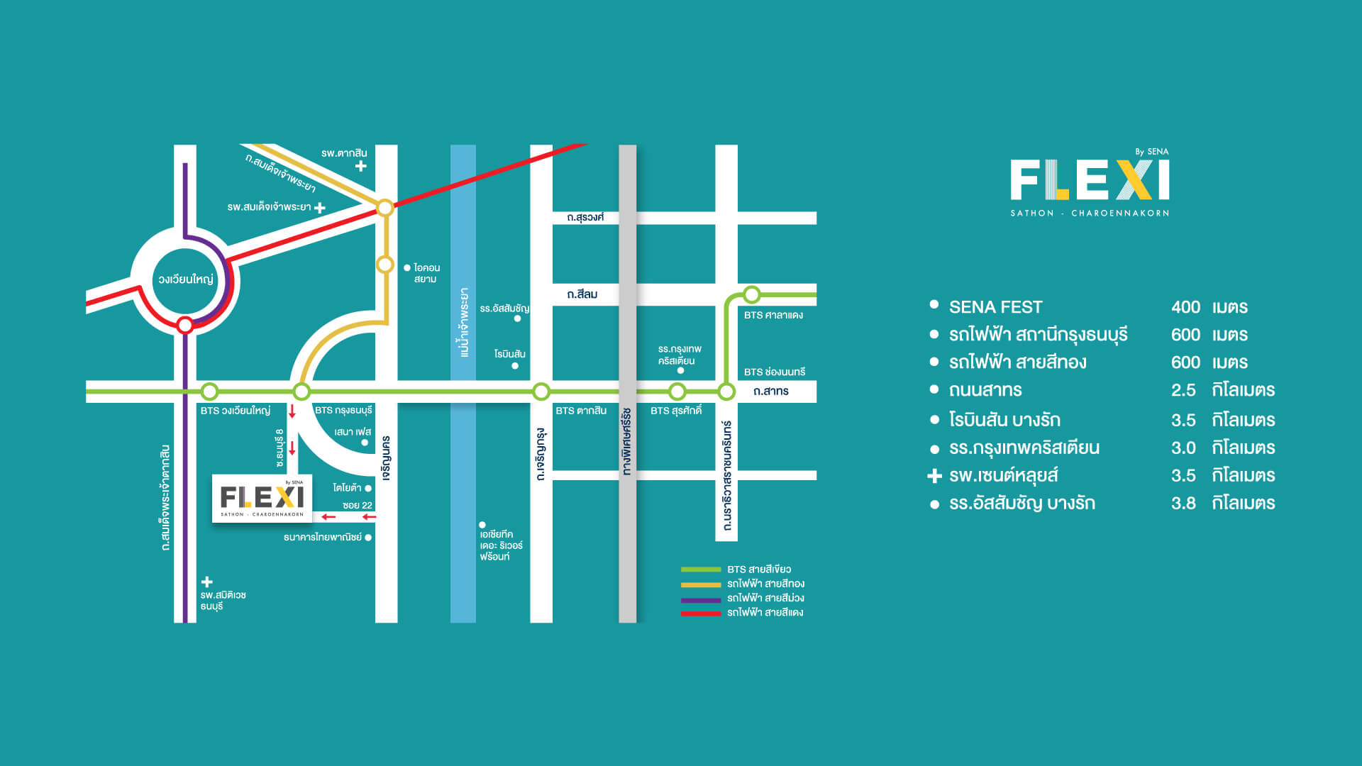 สถานศึกษามหาวิทยาลัยราชภัฏบ้านสมเด็จเจ้าพระยา 1.8 กม.โรงเรียนสวนกุหลาบวิทยาลัย 2.1 กม.โรงเรียนอัสสัมชัญคอนแวนต์สีลม 4 กม. ห้างสรรพสินค้าแพลตฟอร์ม วงเวียนใหญ่ 1.4 กม.บิ๊กซี อิสรภาพ 1.6 กม.