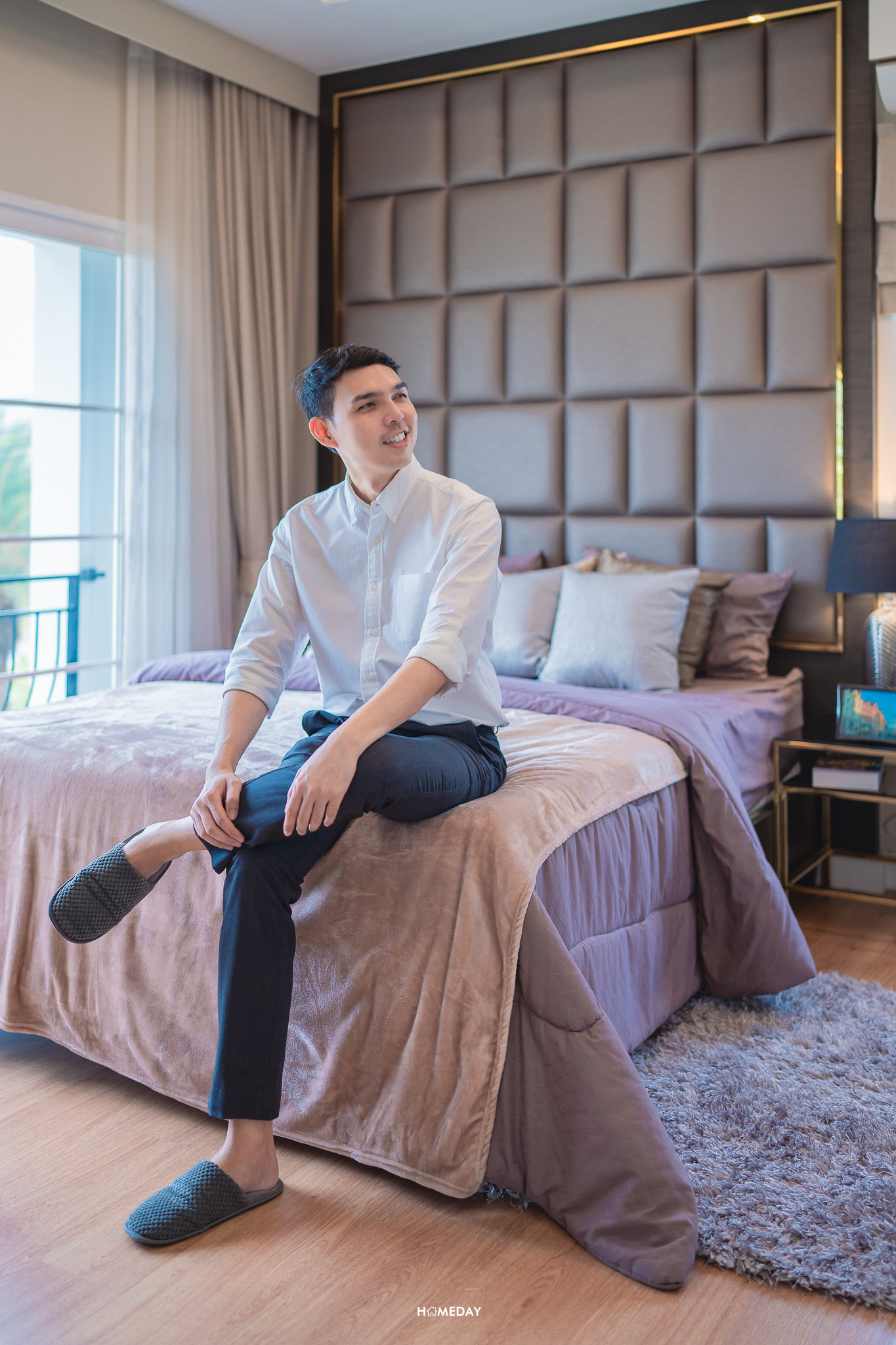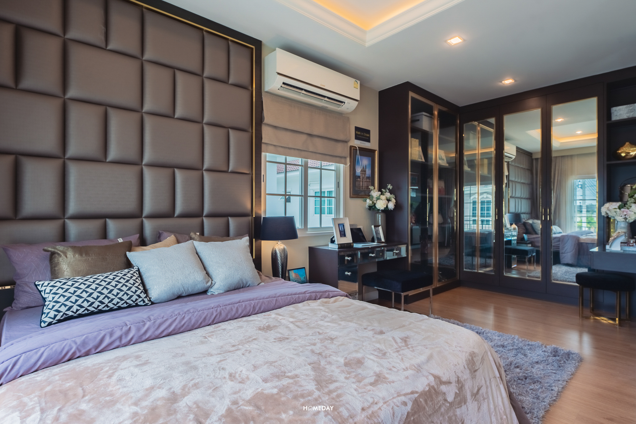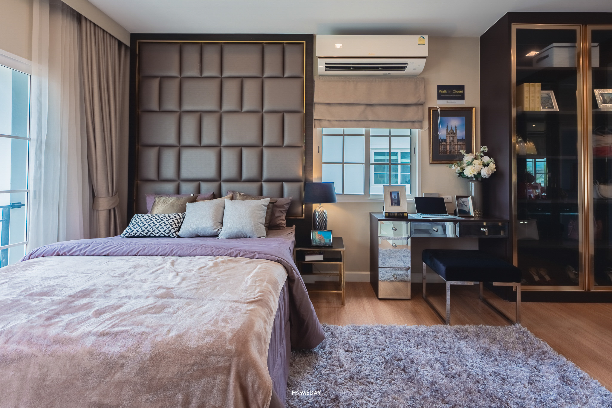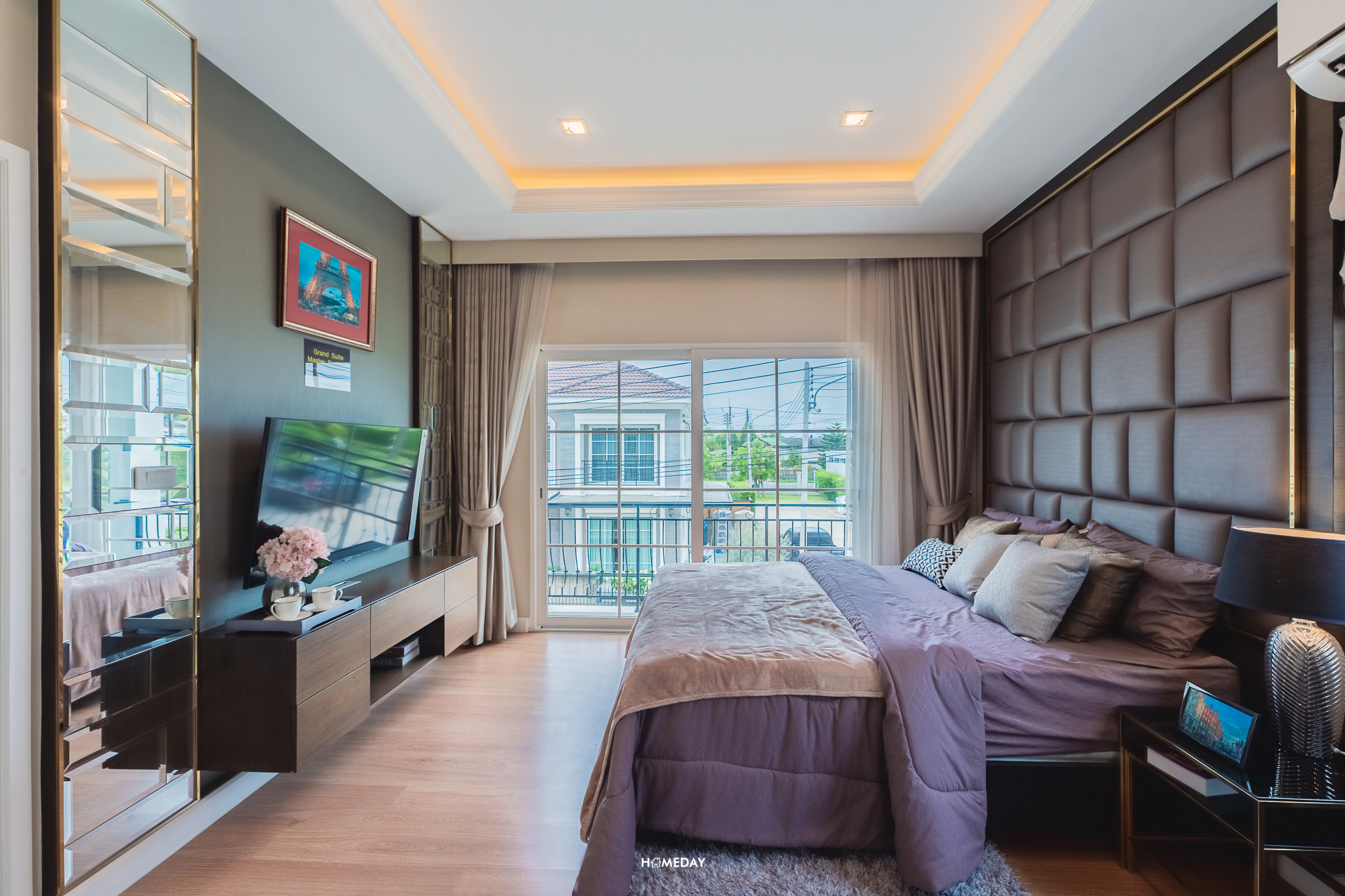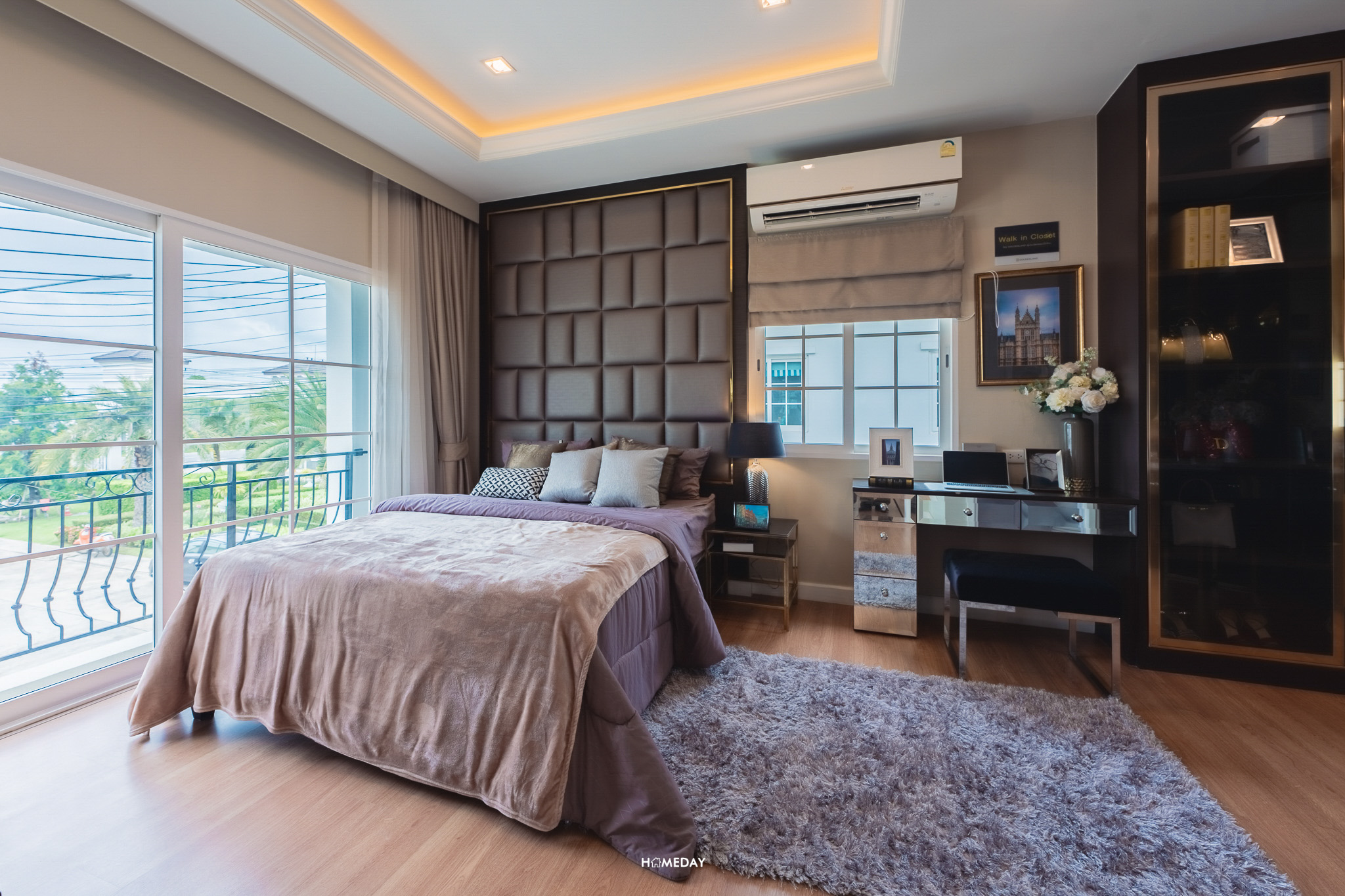 สำหรับ Master Bedroom ภายในห้องมีขนาดใหญ่ เปิดโล่งรับวิวสวย ๆ เต็มพื้นที่ด้านหน้าบ้าน เข้ามาซ้ายมือจะเป็นโซนพักผ่อน และโซน Walk-in Closet พร้อมห้องน้ำในตัว