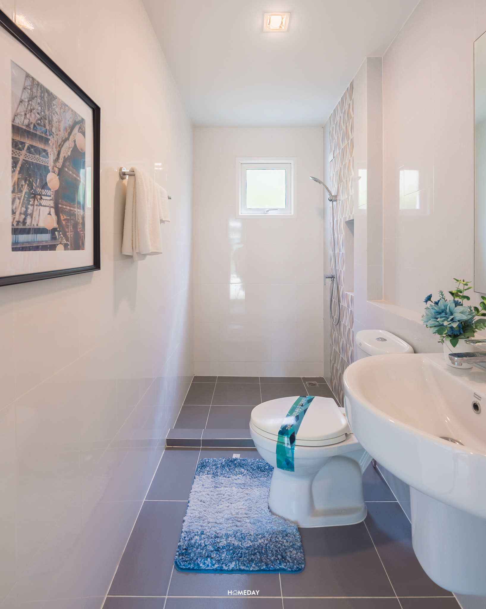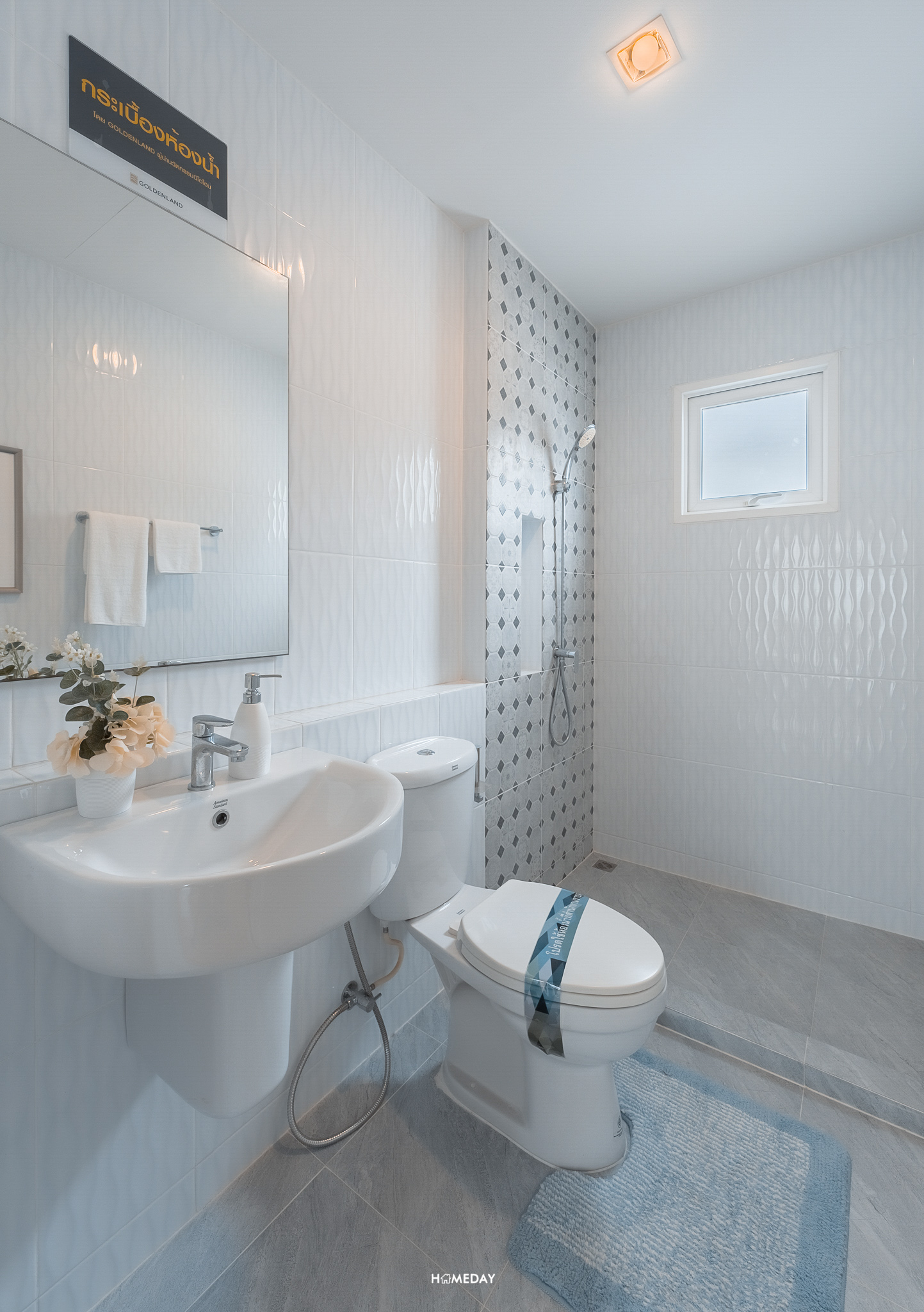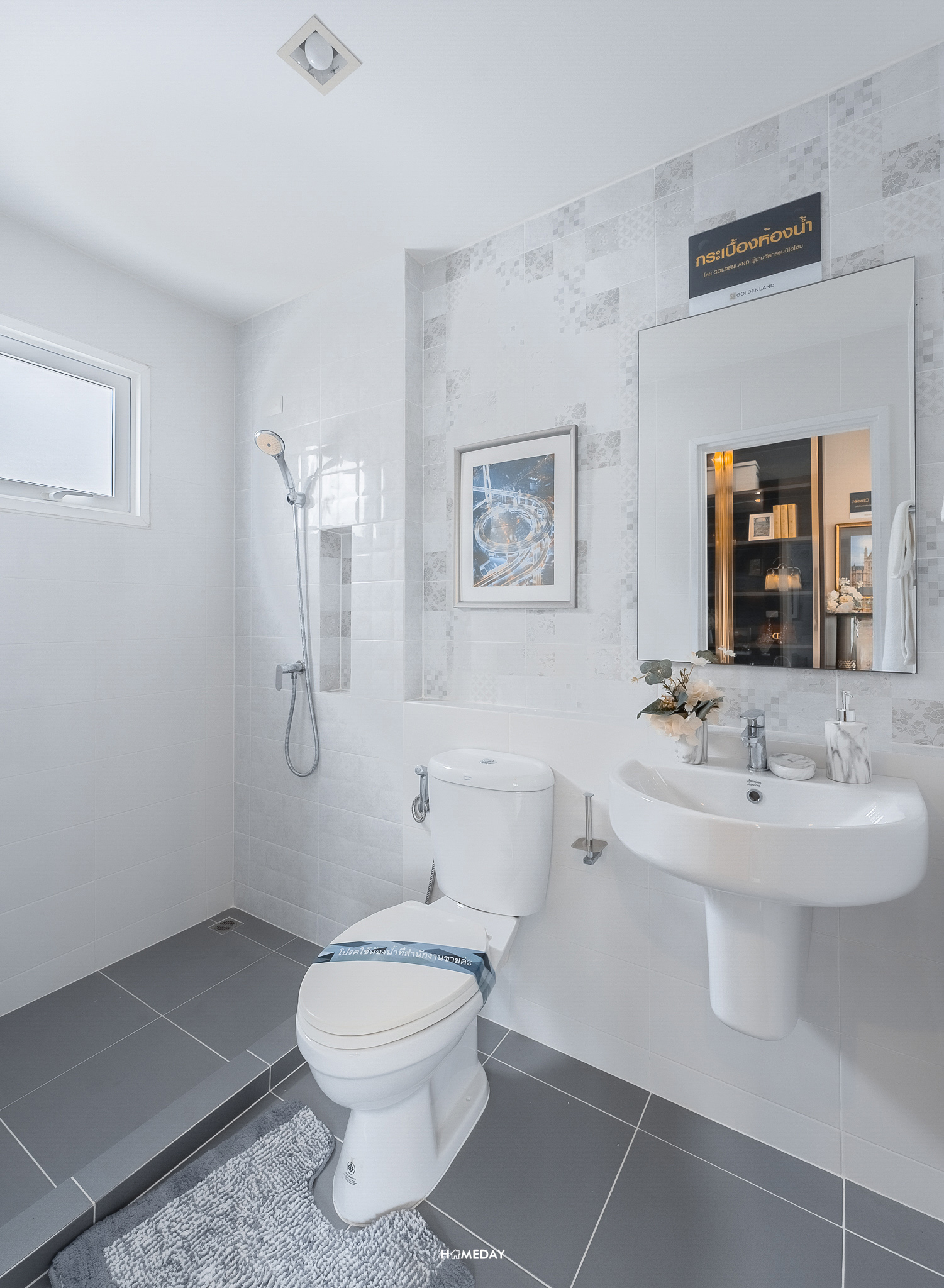 ติดกันจะเป็นห้องน้ำชั้นล่าง ภายในตกแต่งด้วยกระเบื้องโทนสีเทา-ขาว ดูสบายตา แบ่งโซนแห้งและเปียกอย่างชัดเจน ด้วยการกั้นพื้นส่วนอาบน้ำ สามารถติดตั้งฉากกั้นอาบน้ำเพิ่มเติมได้ ชุดสุขภัณฑ์เป็นของ American Standard ครบครันทั้งโถสุขภัณฑ์, ฝักบัวอาบน้ำ และอ่างล้างหน้าแบบแขวนผนัง พร้อม Low Wall & Drop Wall สำหรับวางของใช้ส่วนตัว และยังมีหน้าต่างบานกระทุ้ง ช่วยระบายอากาศและความชื้นได้เป็นอย่างดีครับ
