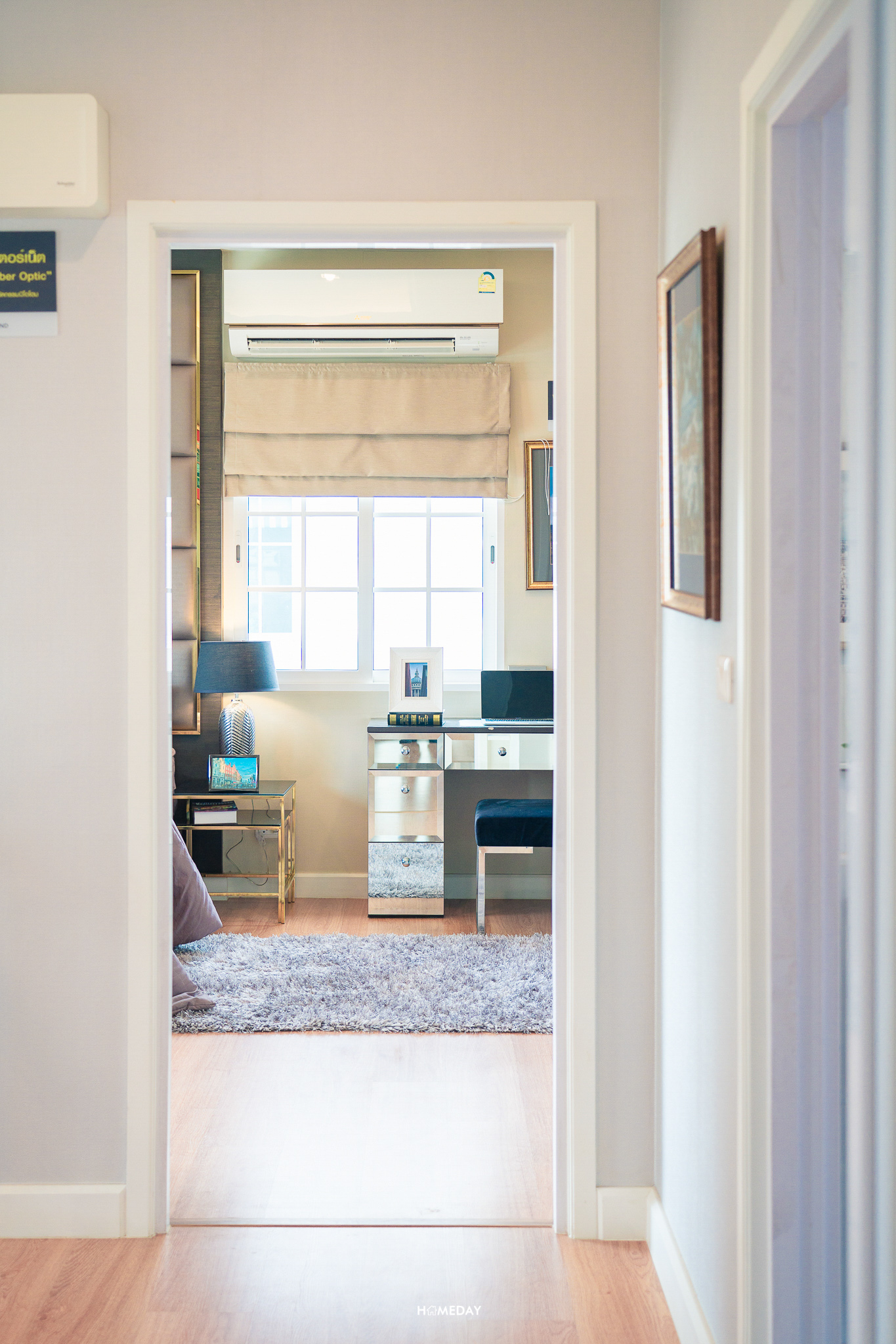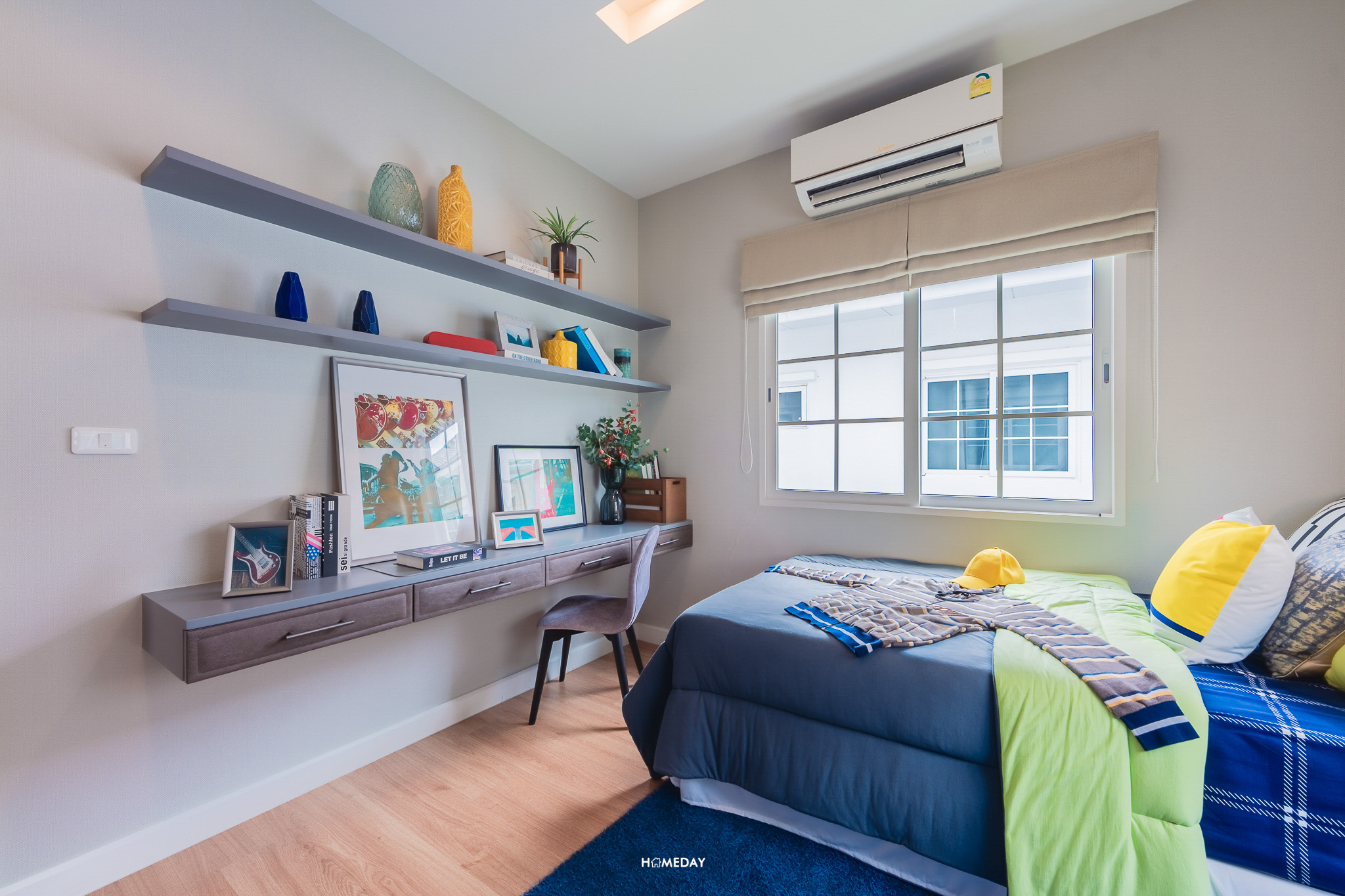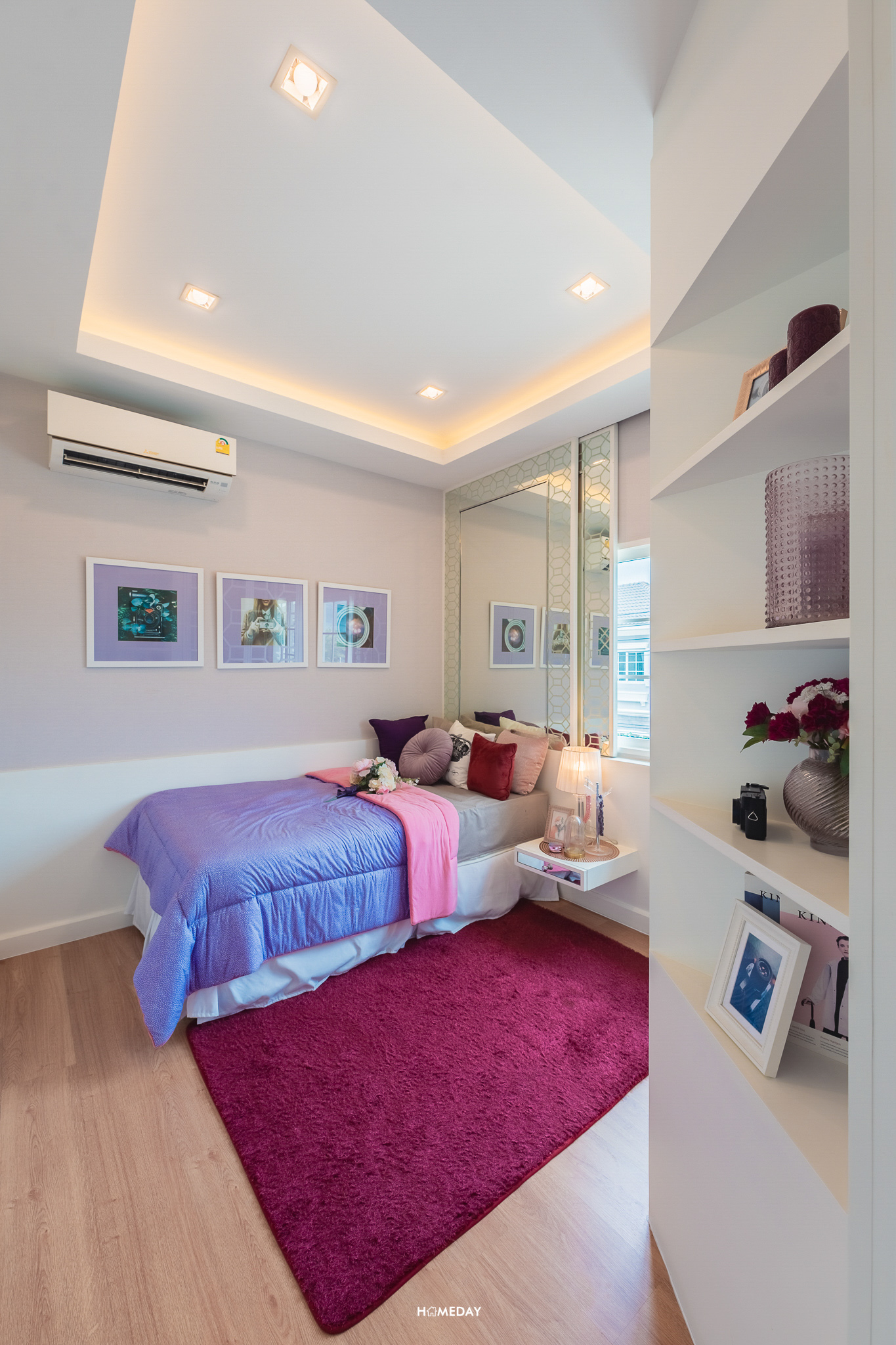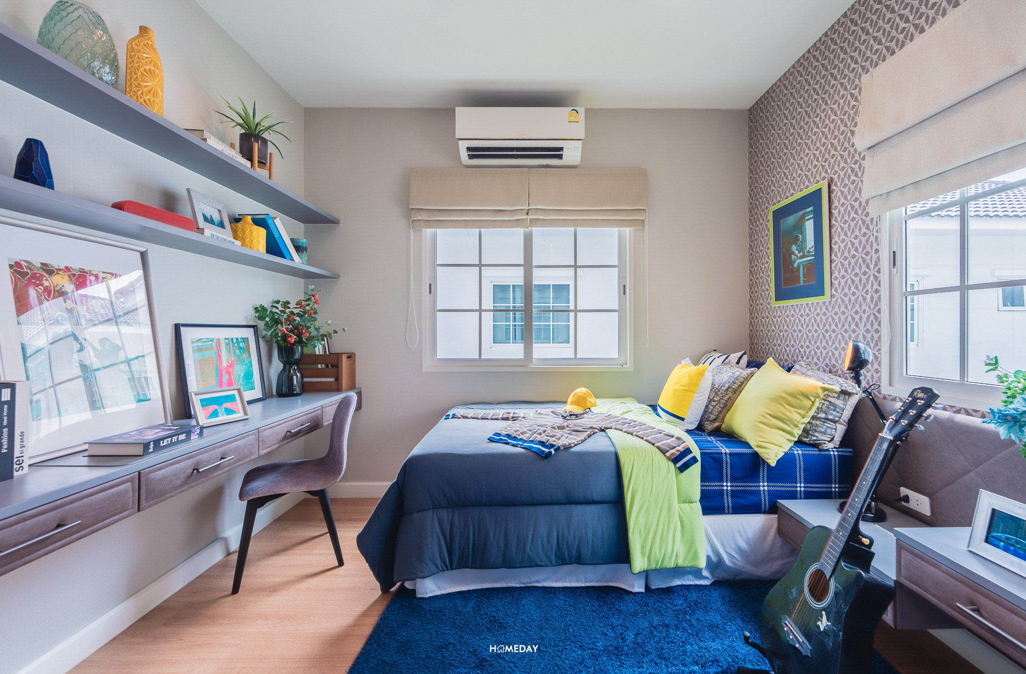 และห้องนอน 3 จะอยู่โซนหลังบ้านด้านในสุด ภายในบ้านตัวอย่างตกแต่งมาเป็นโทนสีน้ำเงิน ฟังก์ชันออกแบบมาเพื่อตอบสนองความต้องการของผู้อยู่อาศัยได้อย่างหลากหลาย ด้วยพื้นที่ใช้สอยที่กว้างขวาง สามารถจัดวางเฟอร์นิเจอร์พื้นฐานได้อย่างพอดี