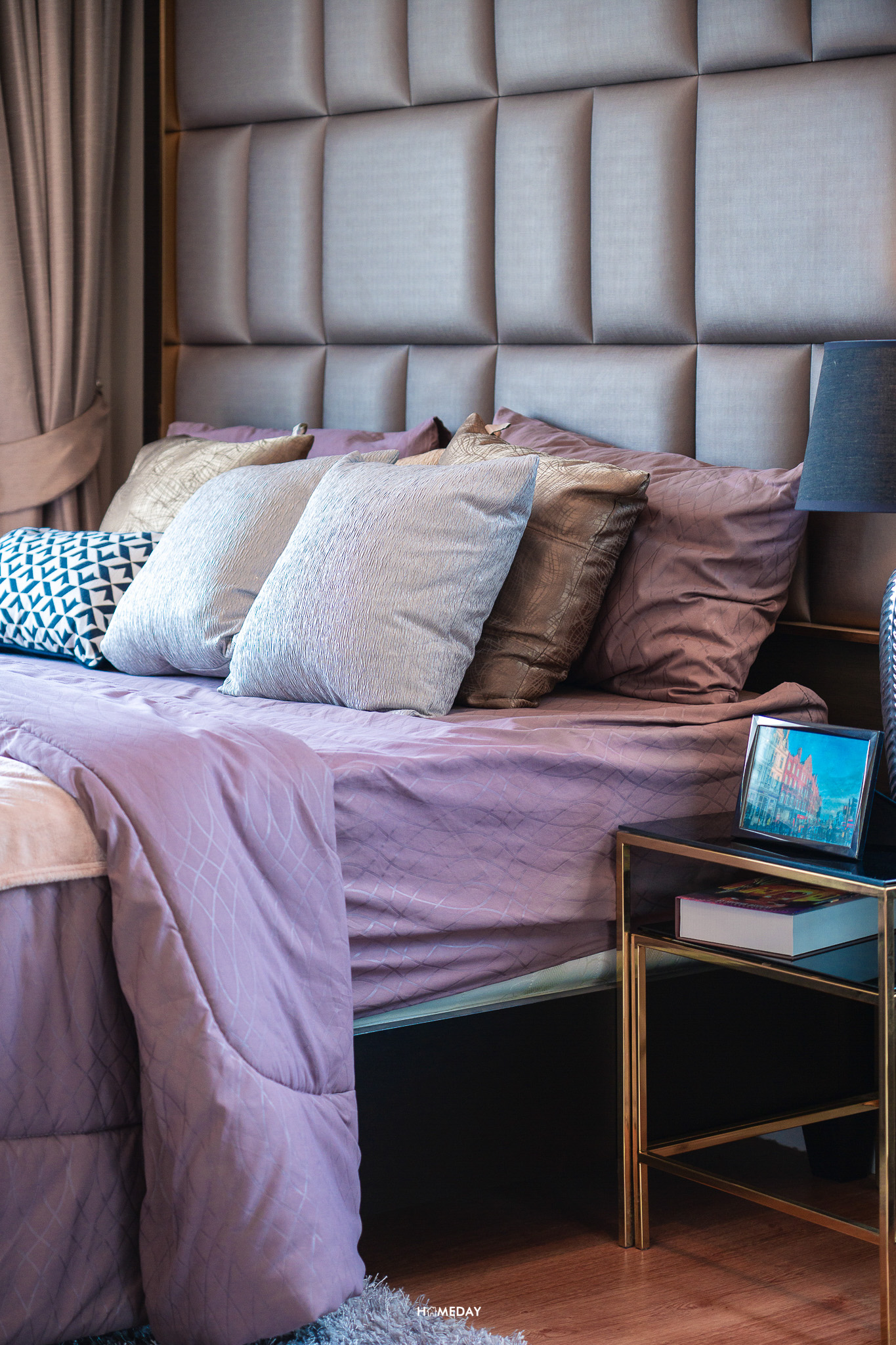 บริเวณโซนพักผ่อน สามารถวางเตียงขนาด 6 ฟุต หัวเตียงสามารถวางตู้หัวเตียงได้สบาย ๆ ปลายเตียงบิลต์ชั้นวางทีวี มีระยะการรับชมที่พอเหมาะกำลังดี เหลือพื้นที่ให้เดินรอบเตียงค่อนข้างเยอะ ห้องดูไม่อึดอัด ลงตัวสำหรับการอยู่ 2 คนได้สบาย ๆ พร้อมระเบียงส่วนตัว ที่สามารถเปิดรับลมและแสงธรรมชาติได้อย่างเต็มที่