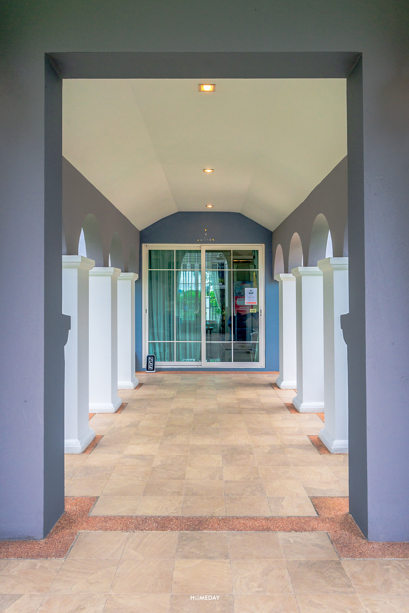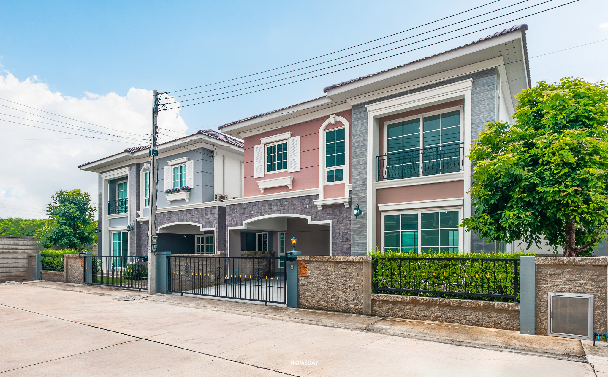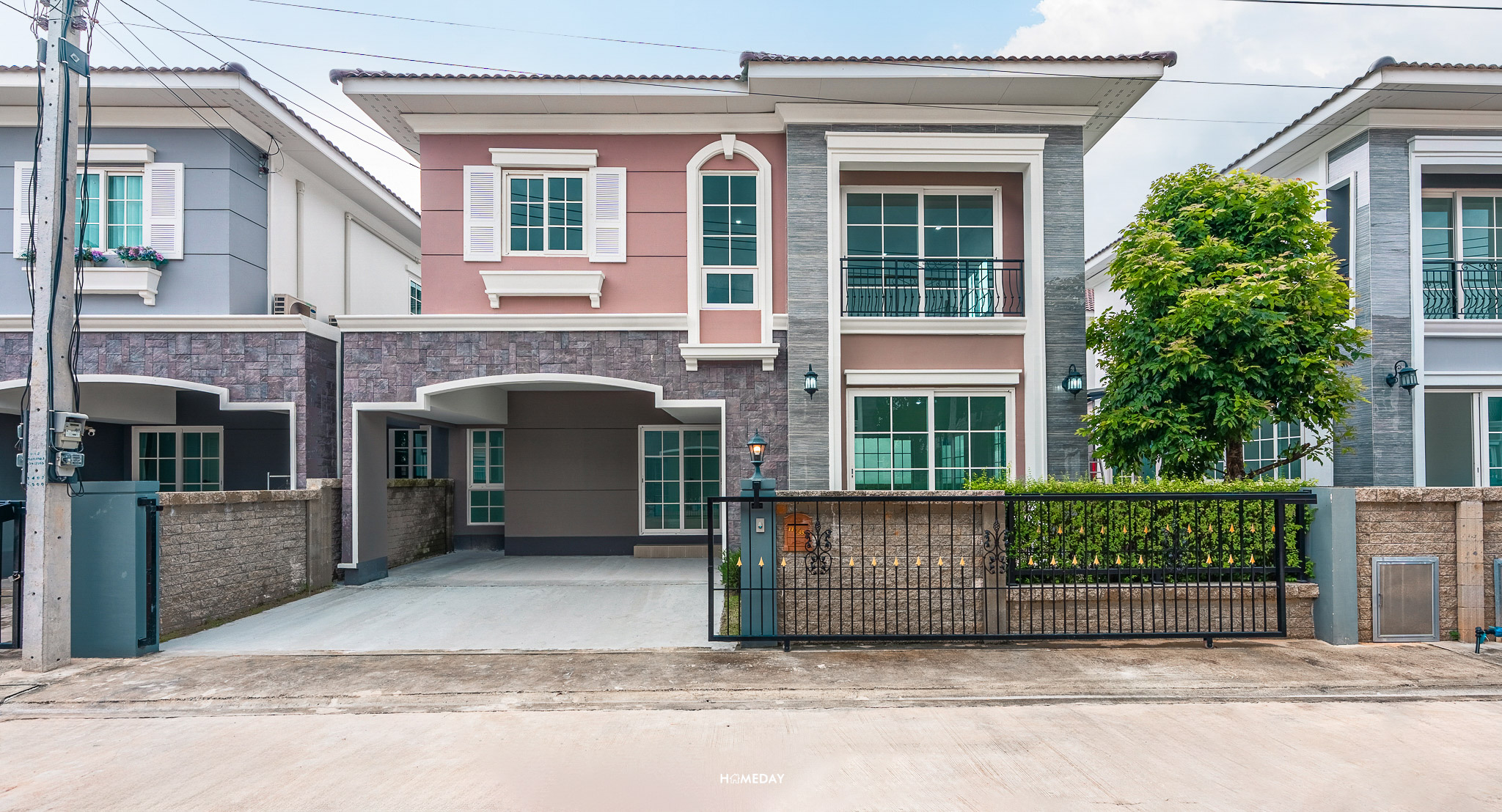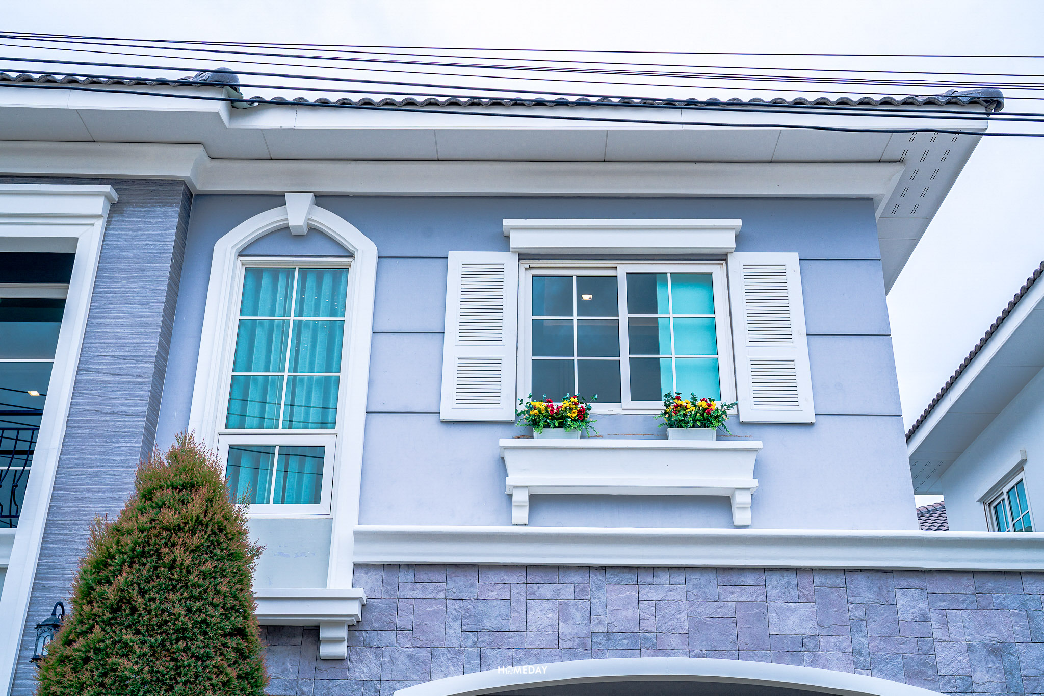 โดดเด่นด้วยสไตล์อังกฤษที่ผสมผสานความทันสมัย โทนสีเทาและขาวที่หรูหราลงตัว ตกแต่งด้วยวัสดุคุณภาพอย่างกระเบื้องลายหินและหินประดับผนัง ช่องแสงขนาดใหญ่ที่เป็นเอกลักษณ์ พร้อมราวระเบียงเหล็กดัดและดีเทลน่ารัก ๆ ตรงหน้าต่างชั้น 2 พร้อมกระถางต้นไม้ริมหน้าต่าง สร้างบรรยากาศสวนอังกฤษให้น่าอยู่ยิ่งขึ้น