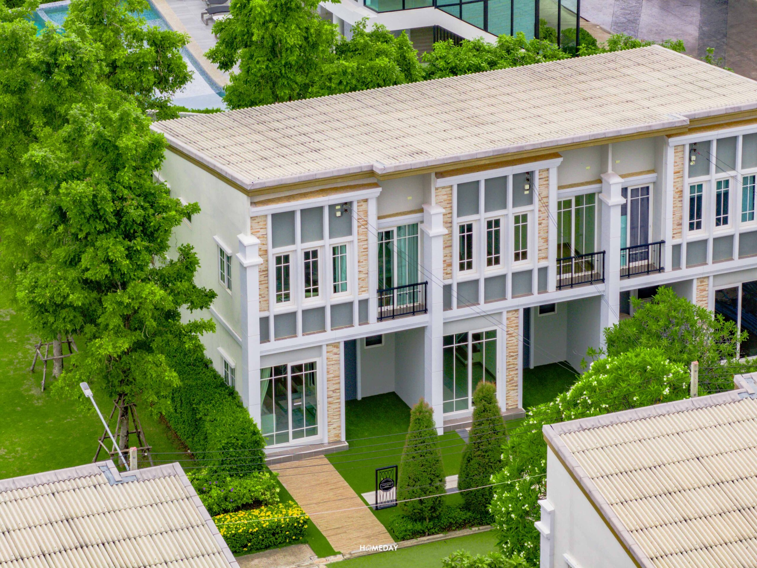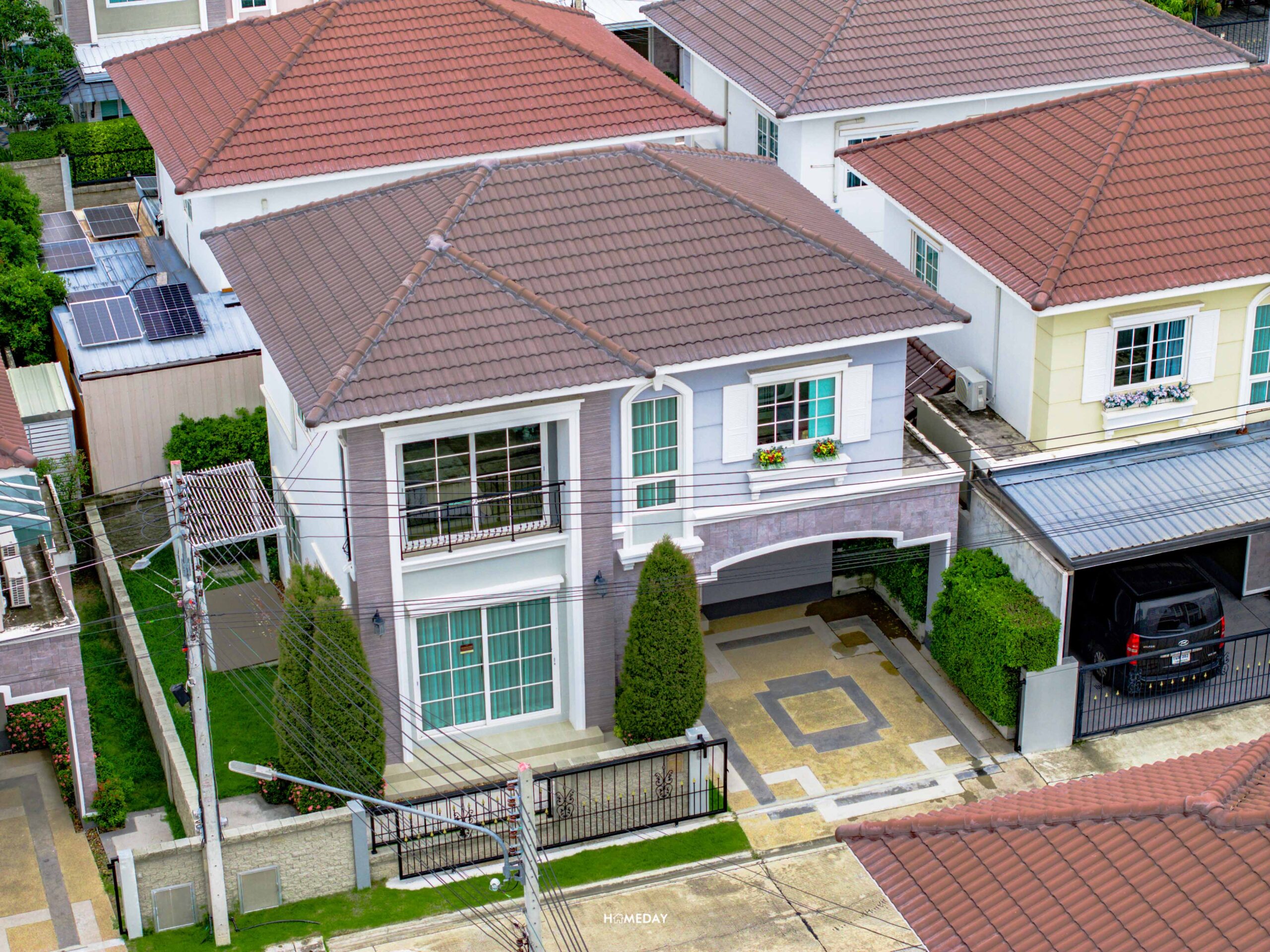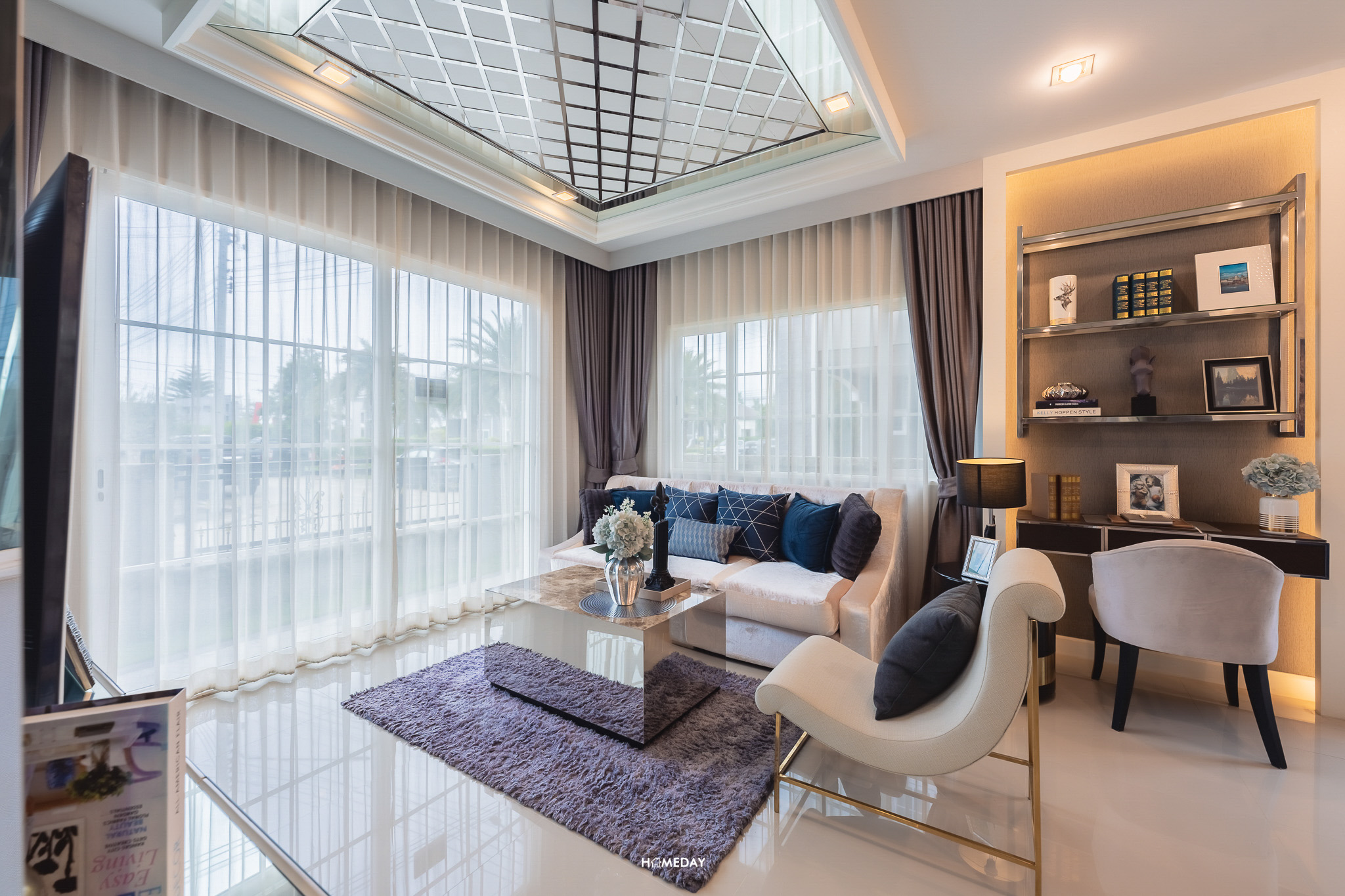 โดดเด่นด้วยสไตล์อังกฤษที่ผสมผสานความทันสมัย โทนสีเทาและขาวที่หรูหราลงตัว ตกแต่งด้วยวัสดุคุณภาพอย่างกระเบื้องลายหินและหินประดับผนัง ช่องแสงขนาดใหญ่ที่เป็นเอกลักษณ์ พร้อมราวระเบียงเหล็กดัดและดีเทลน่ารัก ๆ ตรงหน้าต่างชั้น 2 พร้อมกระถางต้นไม้ริมหน้าต่าง สร้างบรรยากาศสวนอังกฤษให้น่าอยู่ยิ่งขึ้น