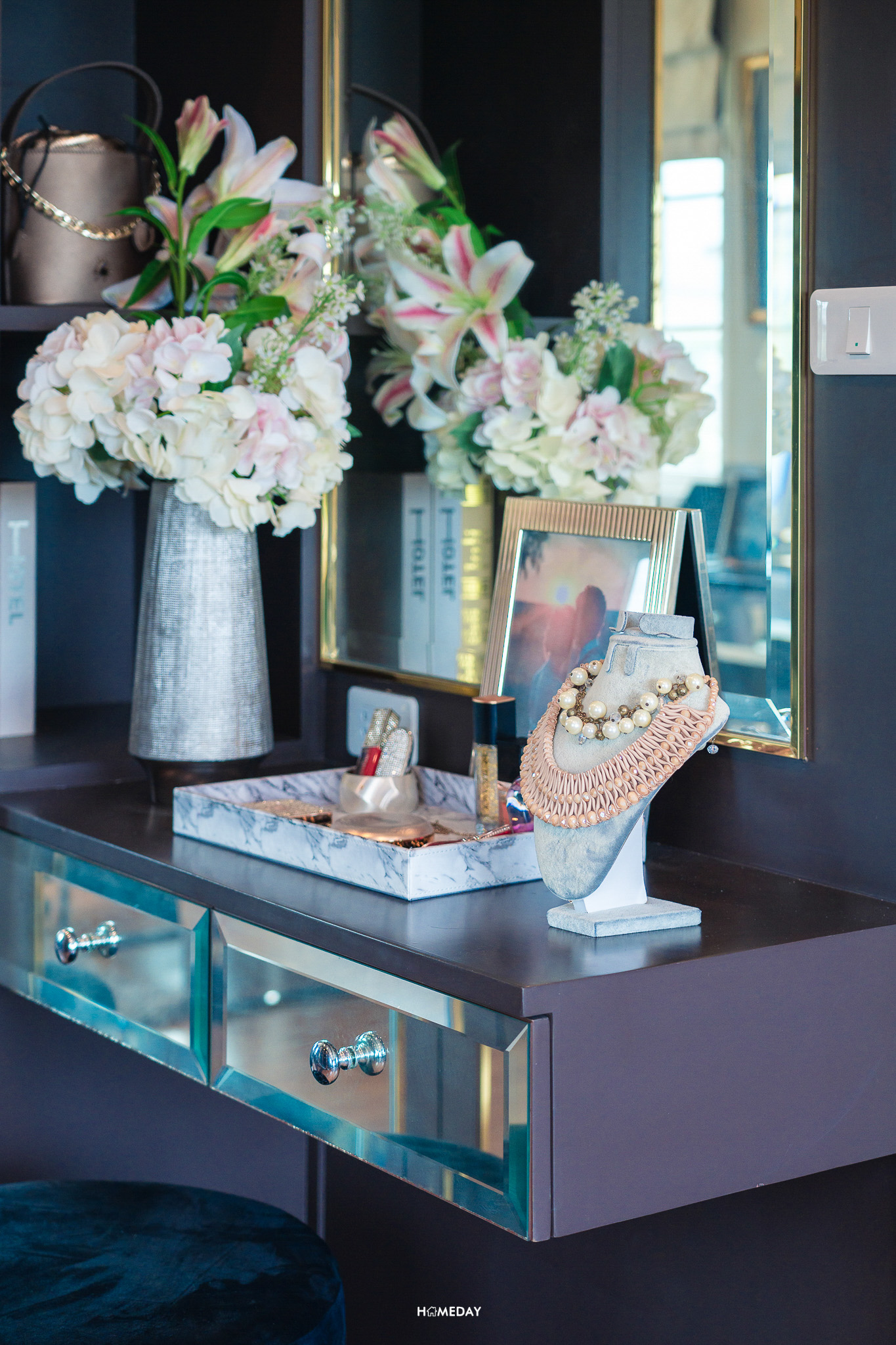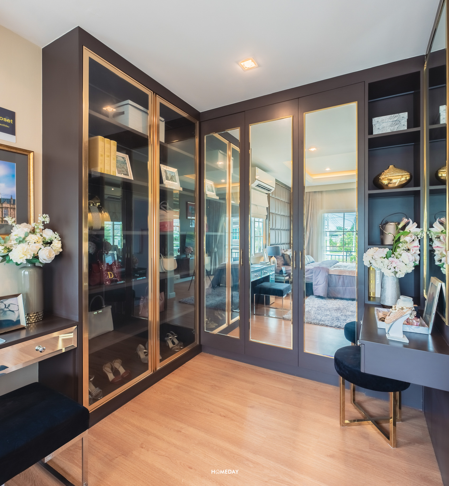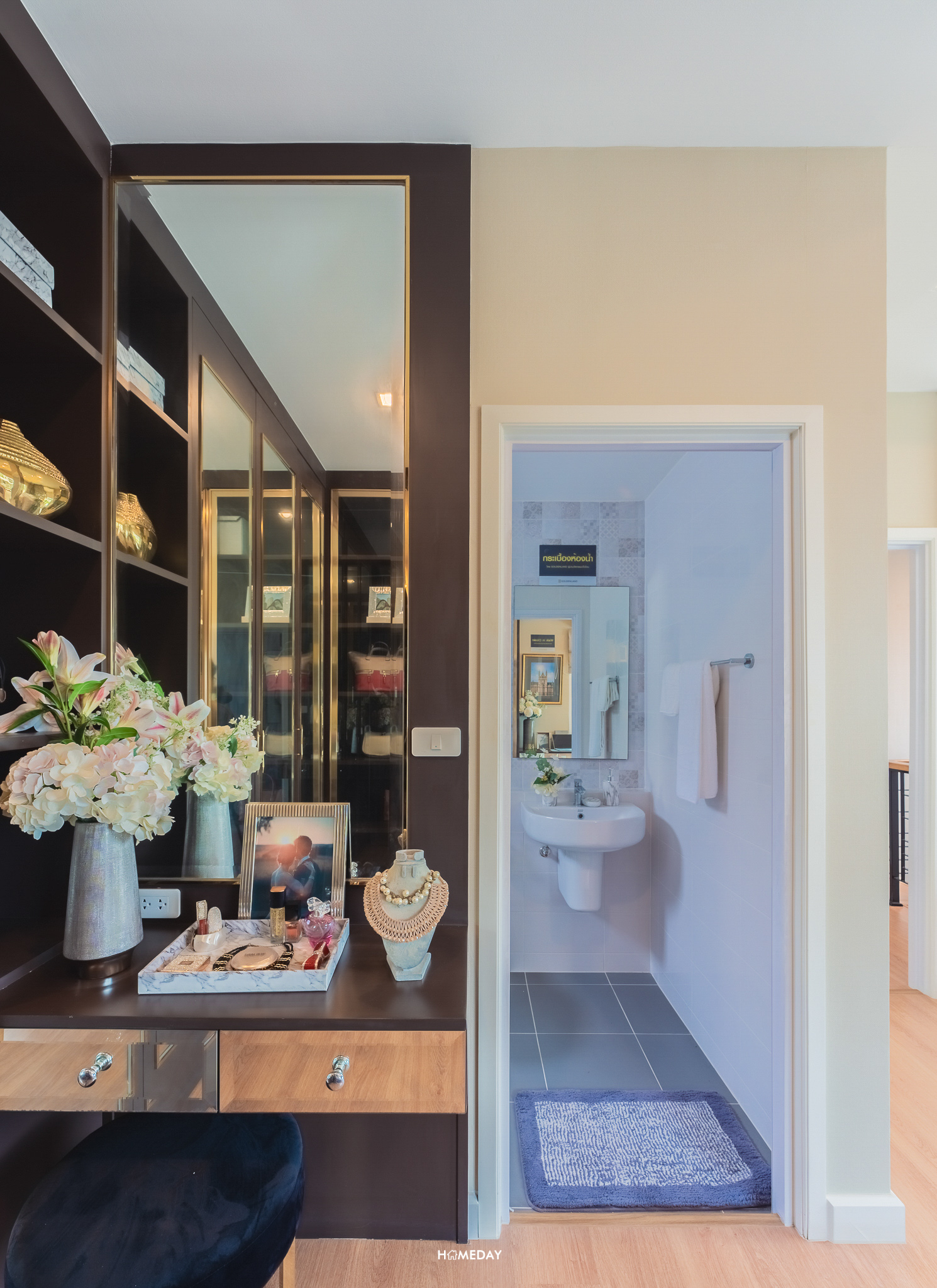 มองกลับมายังโซน Walk-in Closet สามารถกั้น Partition เป็นสัดส่วนได้ ภายในบิลต์อินตู้เสื้อผ้าขนาดใหญ่เข้ามุมทรง L-Shape พร้อมโต๊ะเครื่องแป้ง หรือจะเพิ่มมุมทำงานก็ทำได้เช่นกันครับ ติดกันจะเป็นห้องน้ำในตัวของ Master Bedroom
