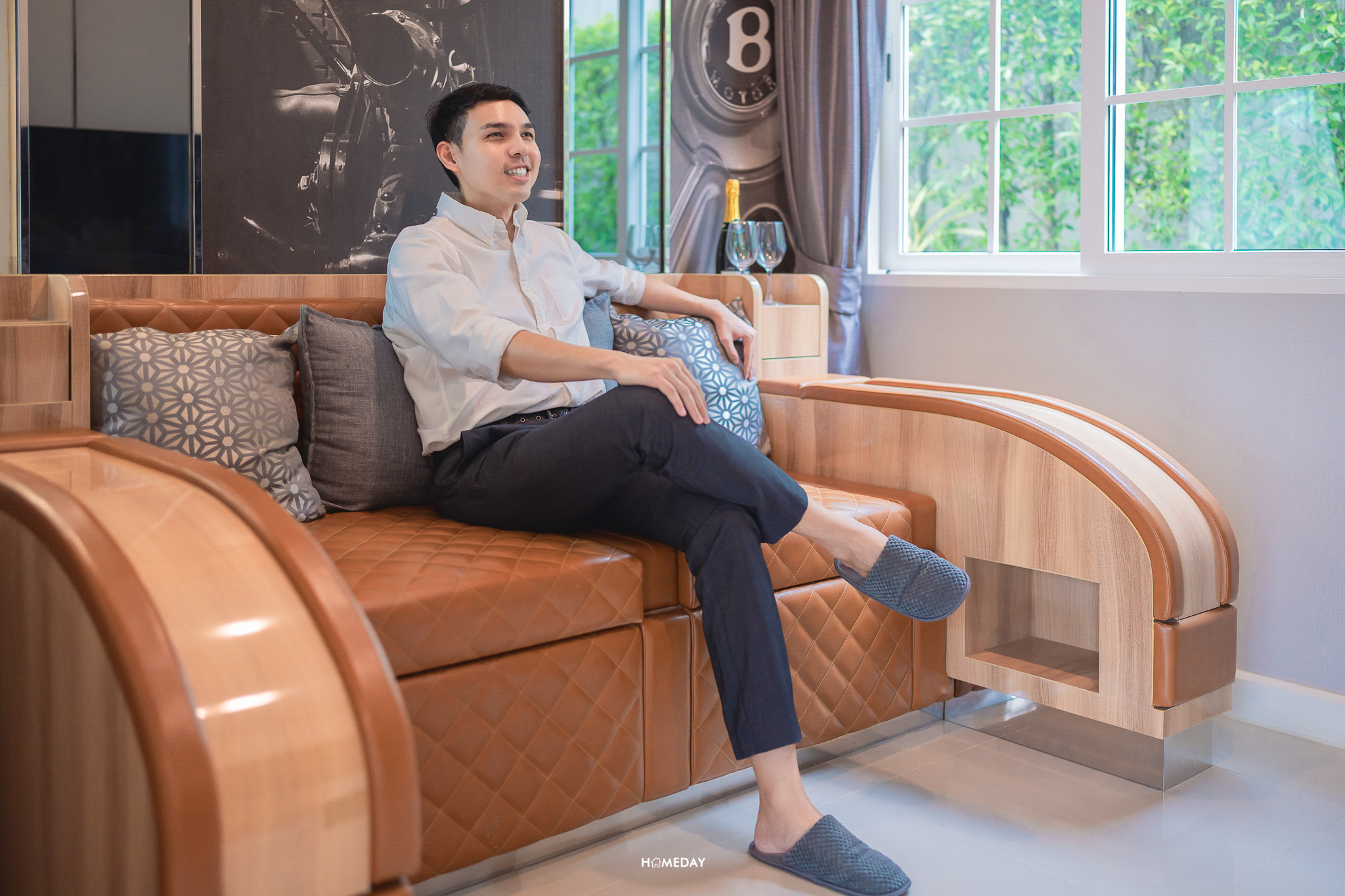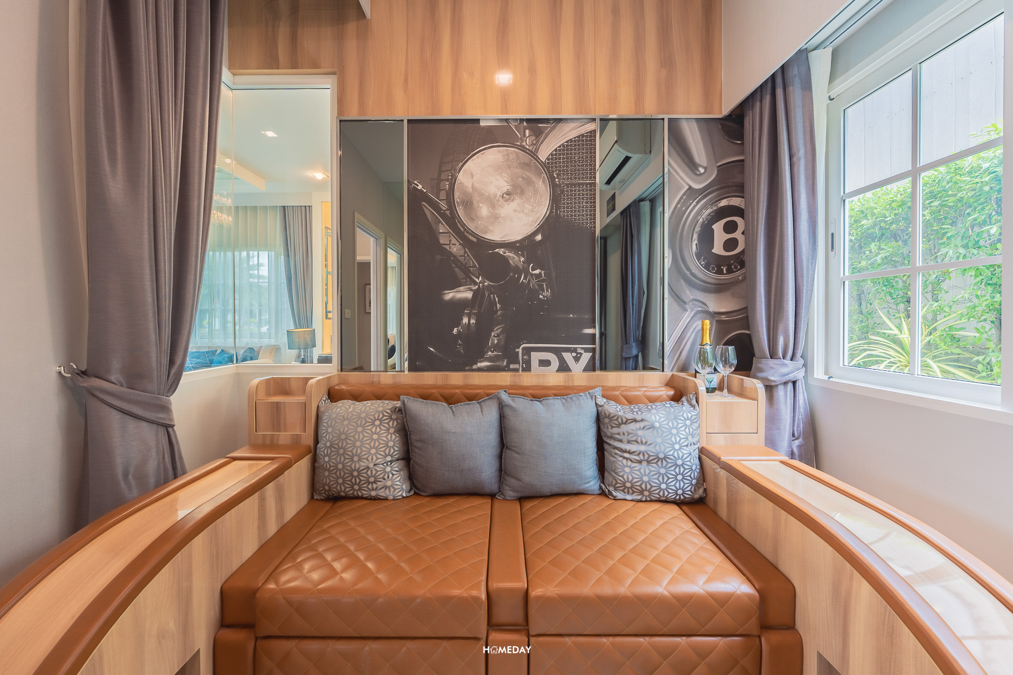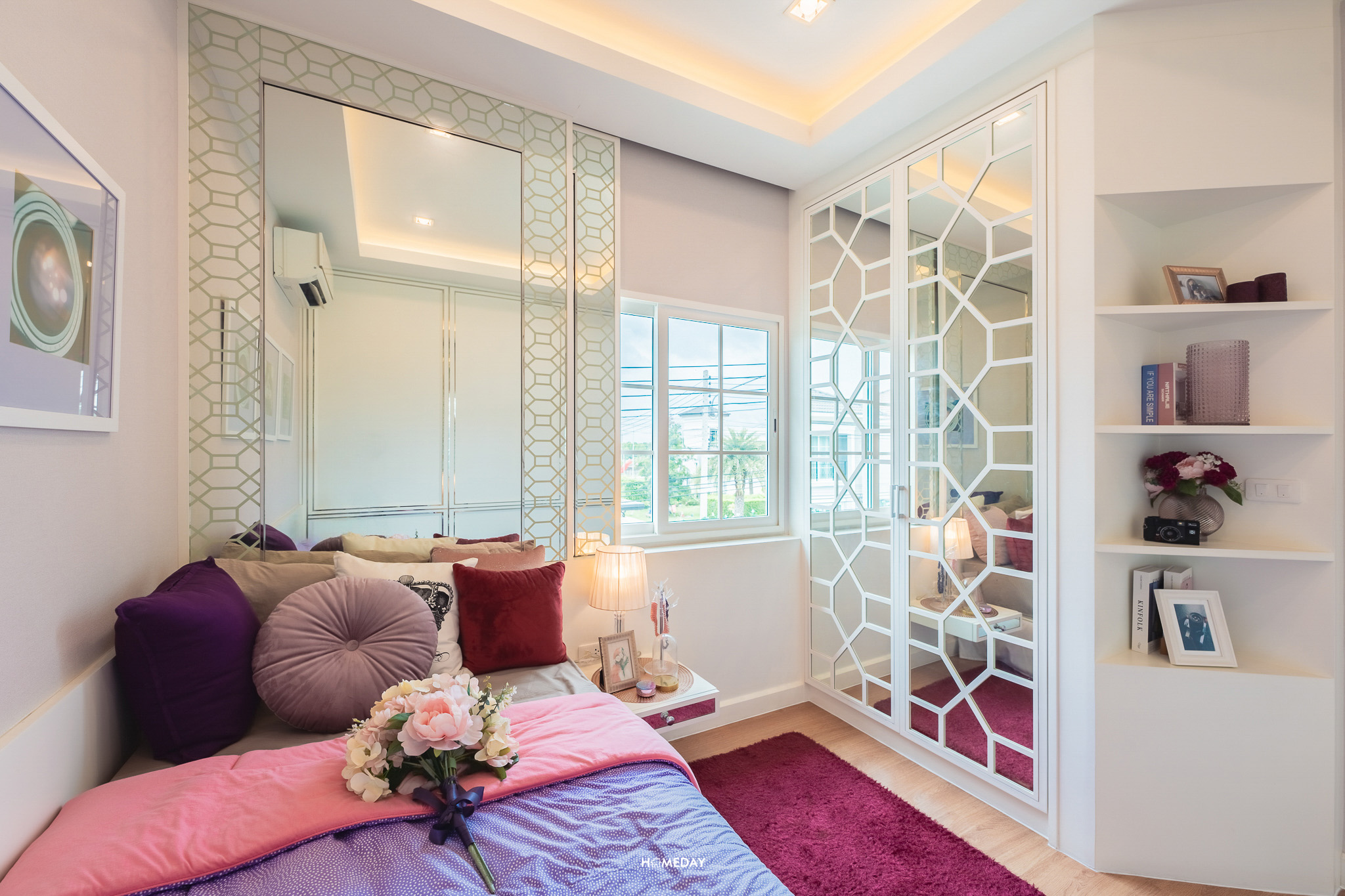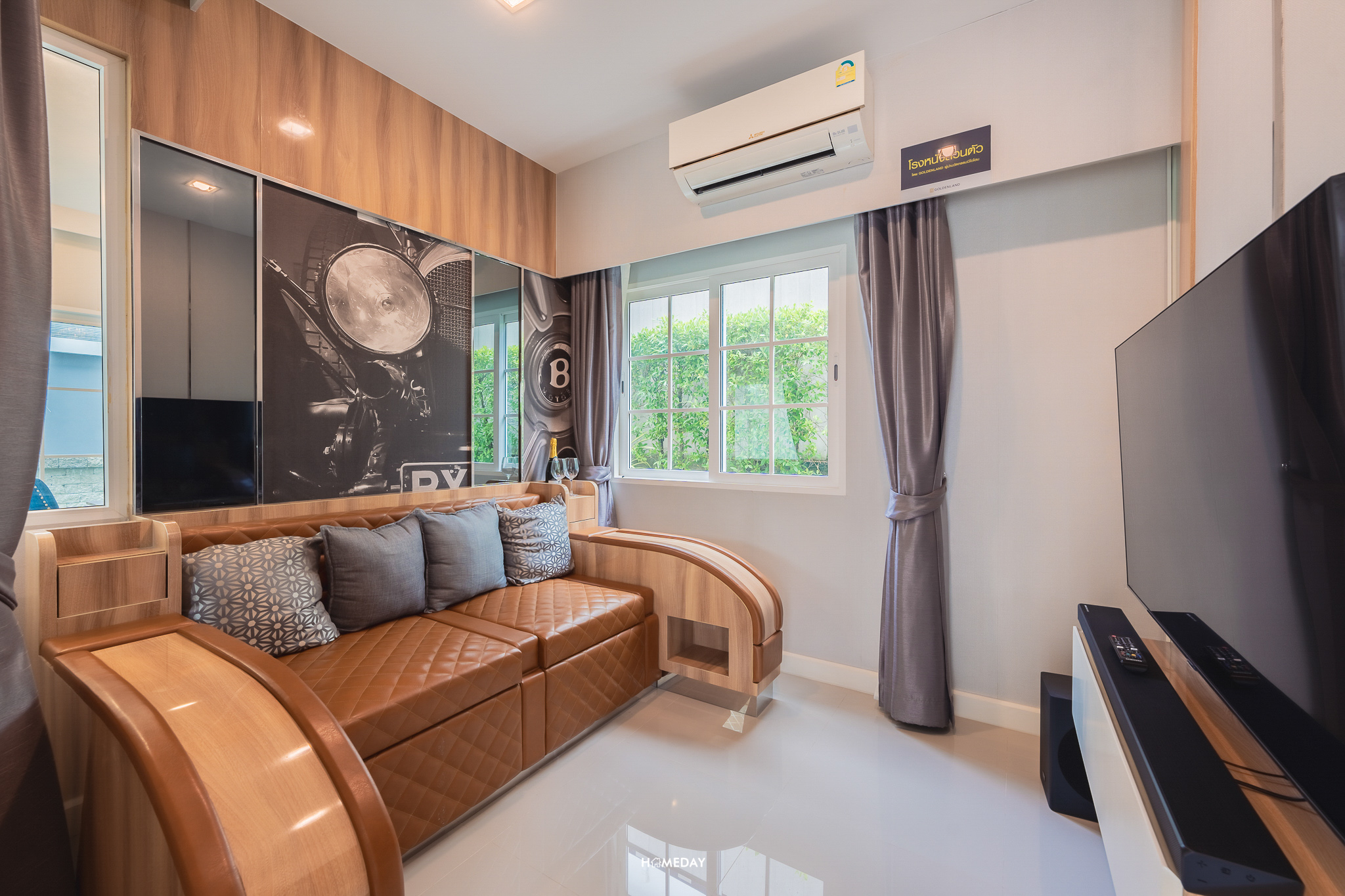 ทางด้านของห้องนอน 4 บ้านตัวอย่างตกแต่งมาเป็นโรงหนังส่วนตัว ภายในห้องมีขนาดกำลังดี สามารถปรับเปลี่ยนฟังก์ชันการใช้งานได้หลากหลาย ไม่ว่าจะทำเป็นห้องทำงาน หรือห้องนอนสำหรับผู้สูงอายุก็ทำได้อย่างลงตัว พร้อมหน้าต่างกระจกบานเลื่อนและหน้าต่างกระจกใสบานฟิกซ์เข้ามุม ช่วยให้ห้องดูโปร่งโล่งและกว้างขวาง