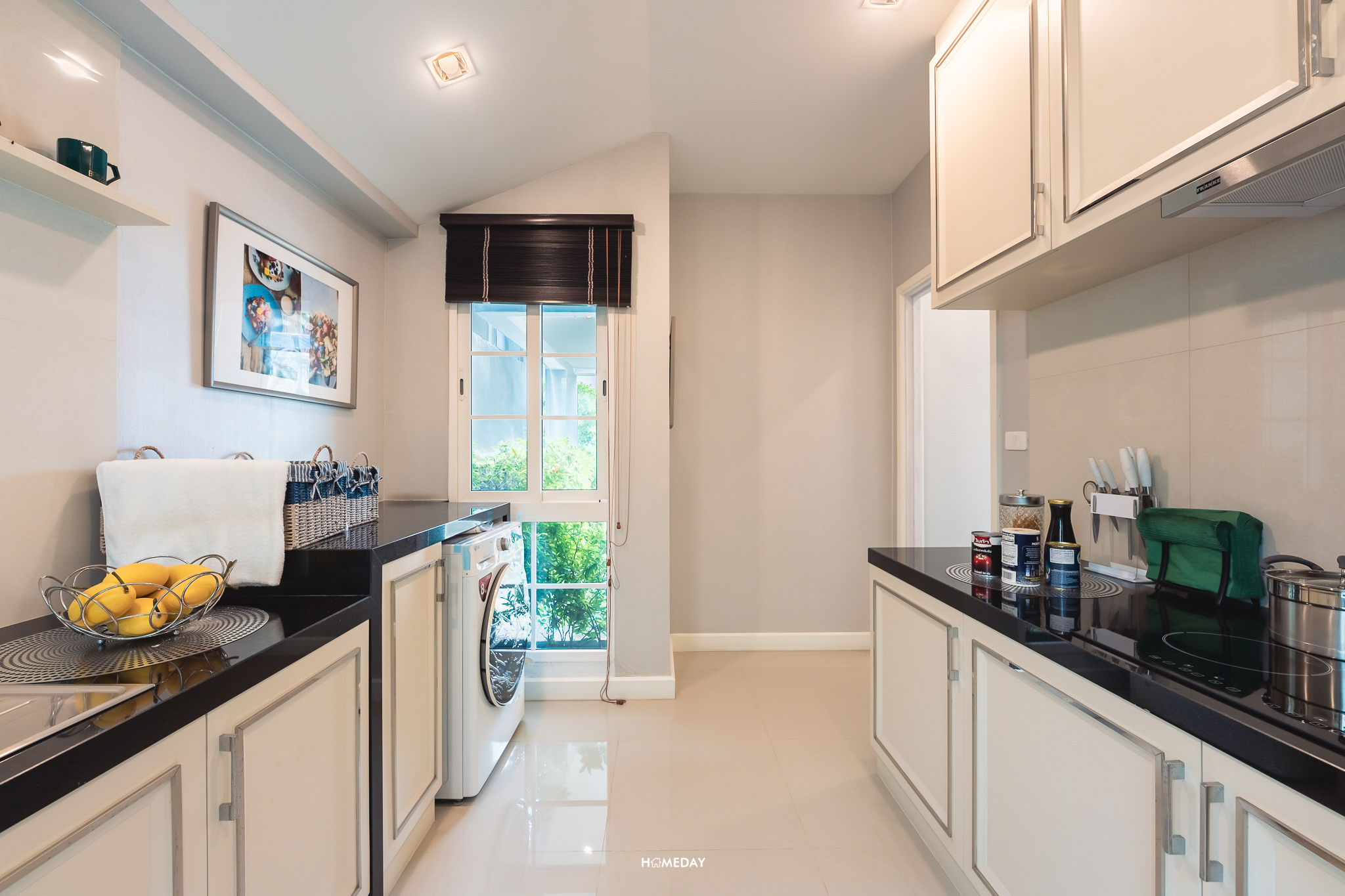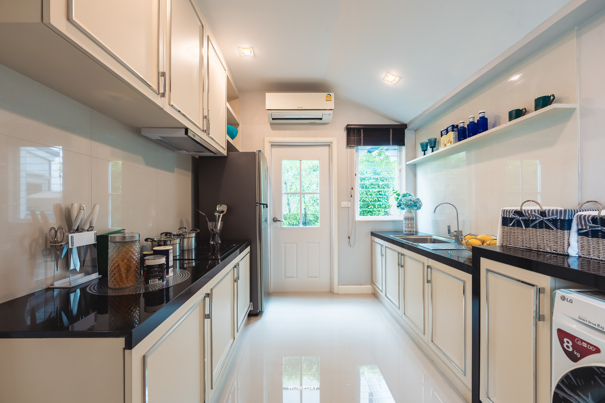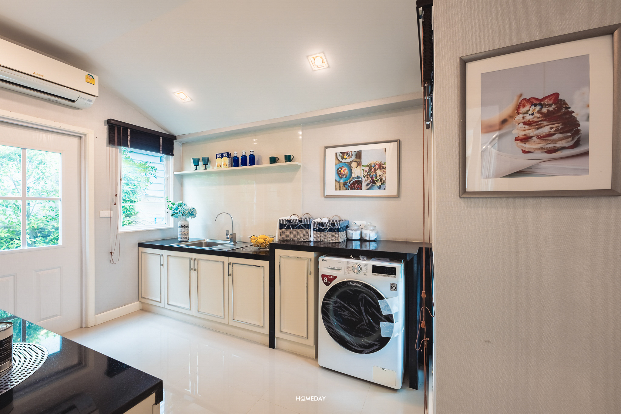 ส่วนครัวไทยและลานซักล้างจะอยู่ถัดมาจากห้องน้ำชั้นล่าง ภายในกว้างขวาง สามารถบิลต์เคาน์เตอร์ครัวและฟังก์ชันการใช้งานส่วนอื่น ๆ ได้ตามความต้องการเลยครับ บ้านตัวอย่างออกแบบมาให้ดูเป็นไอเดีย ทำเป็นเคาน์เตอร์สองฝั่ง แยกโซนร้อนและโซนเย็น โดยเพิ่มช่องใส่เครื่องซักผ้ามาให้ดู เหลือพื้นที่สามารถใช้งานพร้อมกัน 2 คนได้สบาย ๆ ไม่อึดอัด ตอบโจทย์ทุกความต้องการในการทำครัวและซักรีด