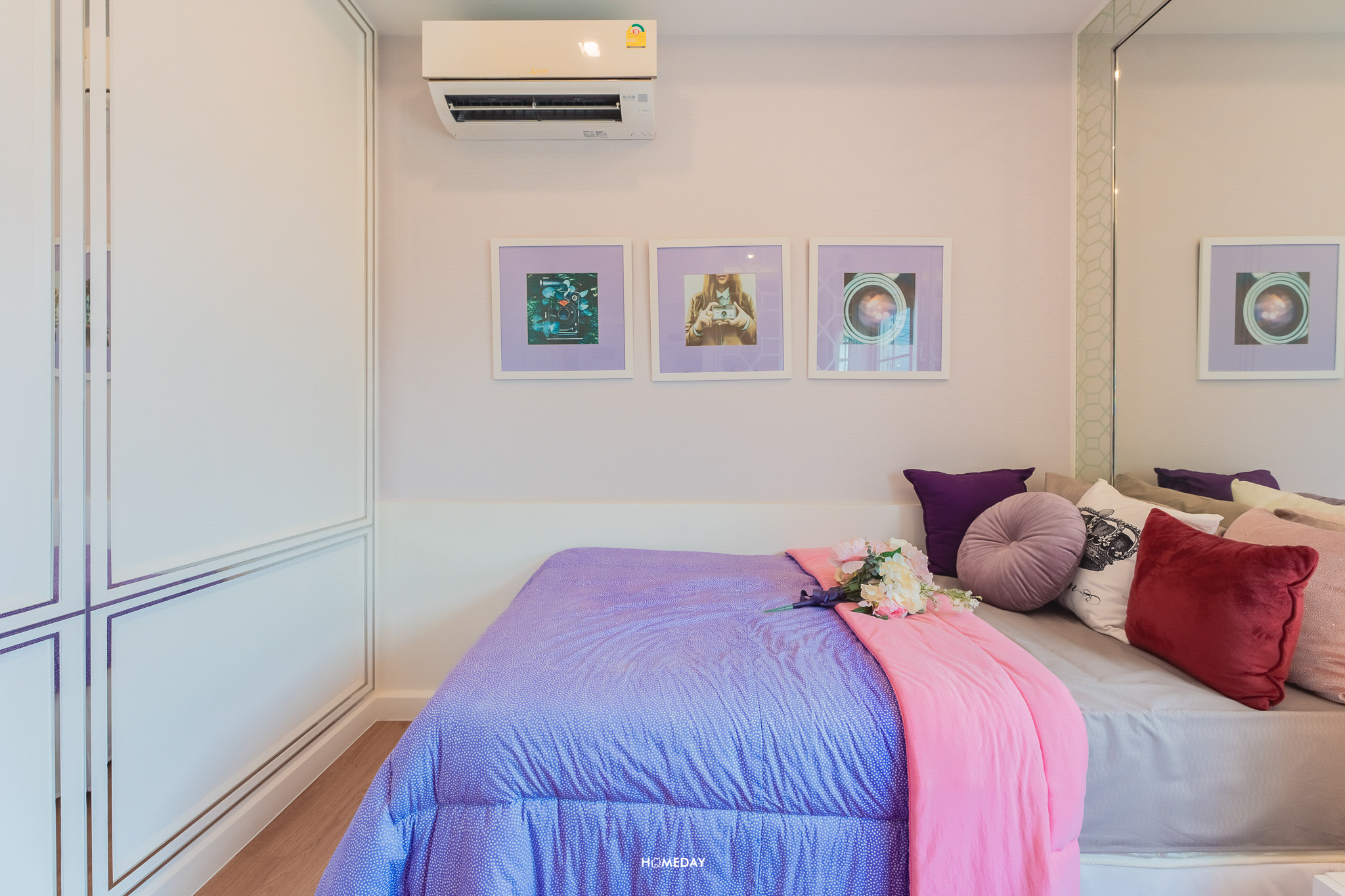 ห้องนอน 2 ตกแต่งภายในมาในโทนสีอบอุ่น ภายในห้องได้ขนาดกว้างกำลังดี พอเหมาะสำหรับ 1 คน วางเตียงขนาด 3.5 ฟุตมาให้ดู โดยยังมีเหลือพื้นที่ให้เดินได้รอบ สามารถจัดวางฟังก์ชันได้ครบไม่ว่าจะวางตู้เสื้อ, โต๊ะเครื่องแป้ง หรือมุมทำงานก็จัดวางได้อย่างลงตัว พร้อมปรับเปลี่ยนได้ตามไลฟ์สไตล์ของผู้อยู่อาศัยเลยครับ