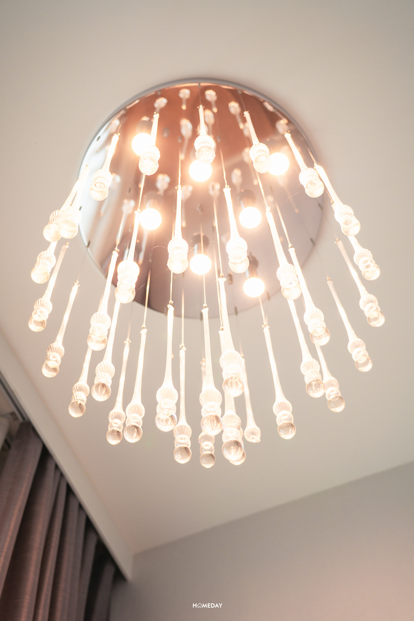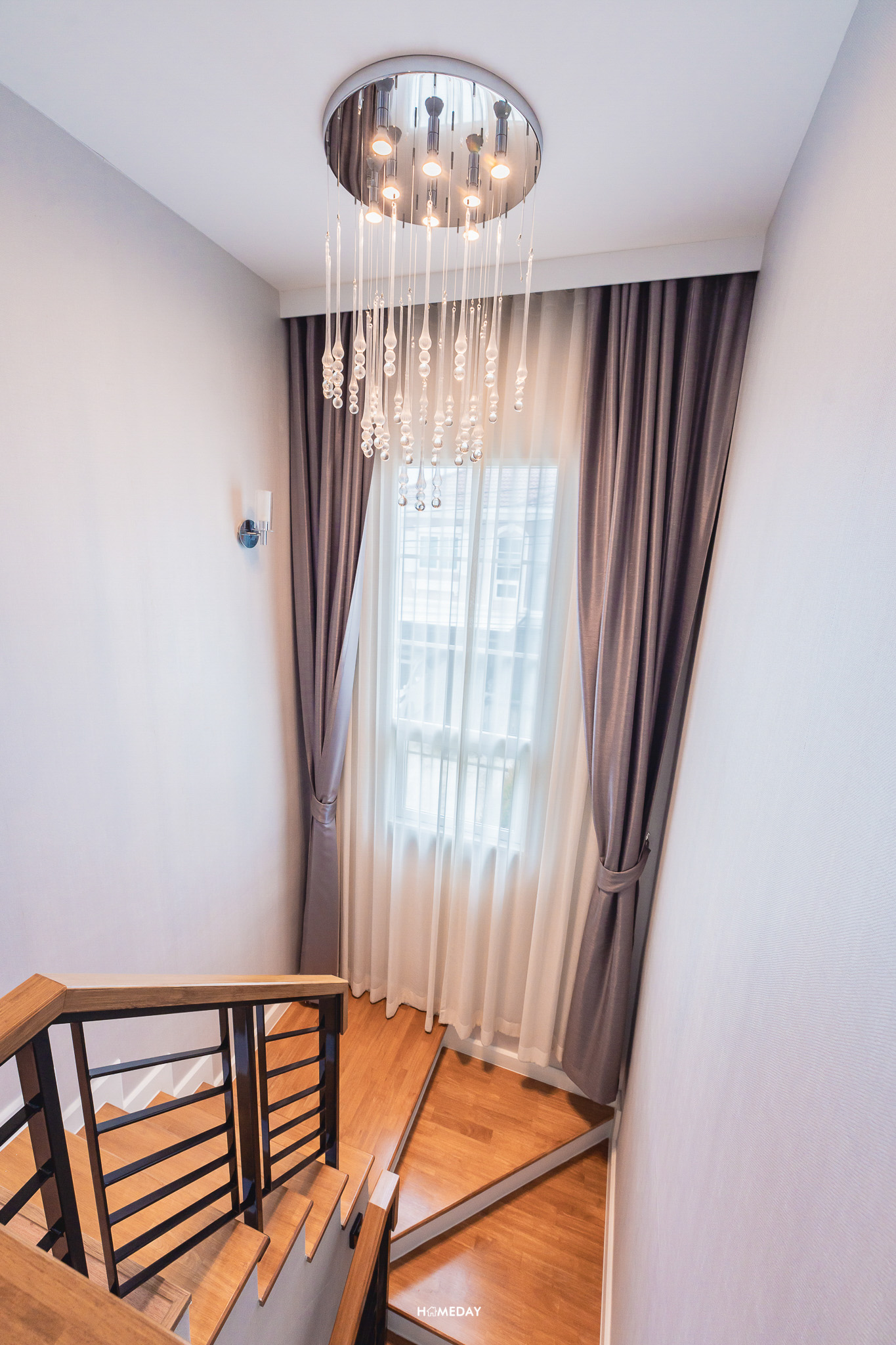 สร้างความหรูหรา บริเวณโถงบันไดด้วยการตกแต่งโคมไฟระย้าสวย ๆ หรือแชนเดอเลียร์เก๋ ๆ ก็ได้เลยครับ