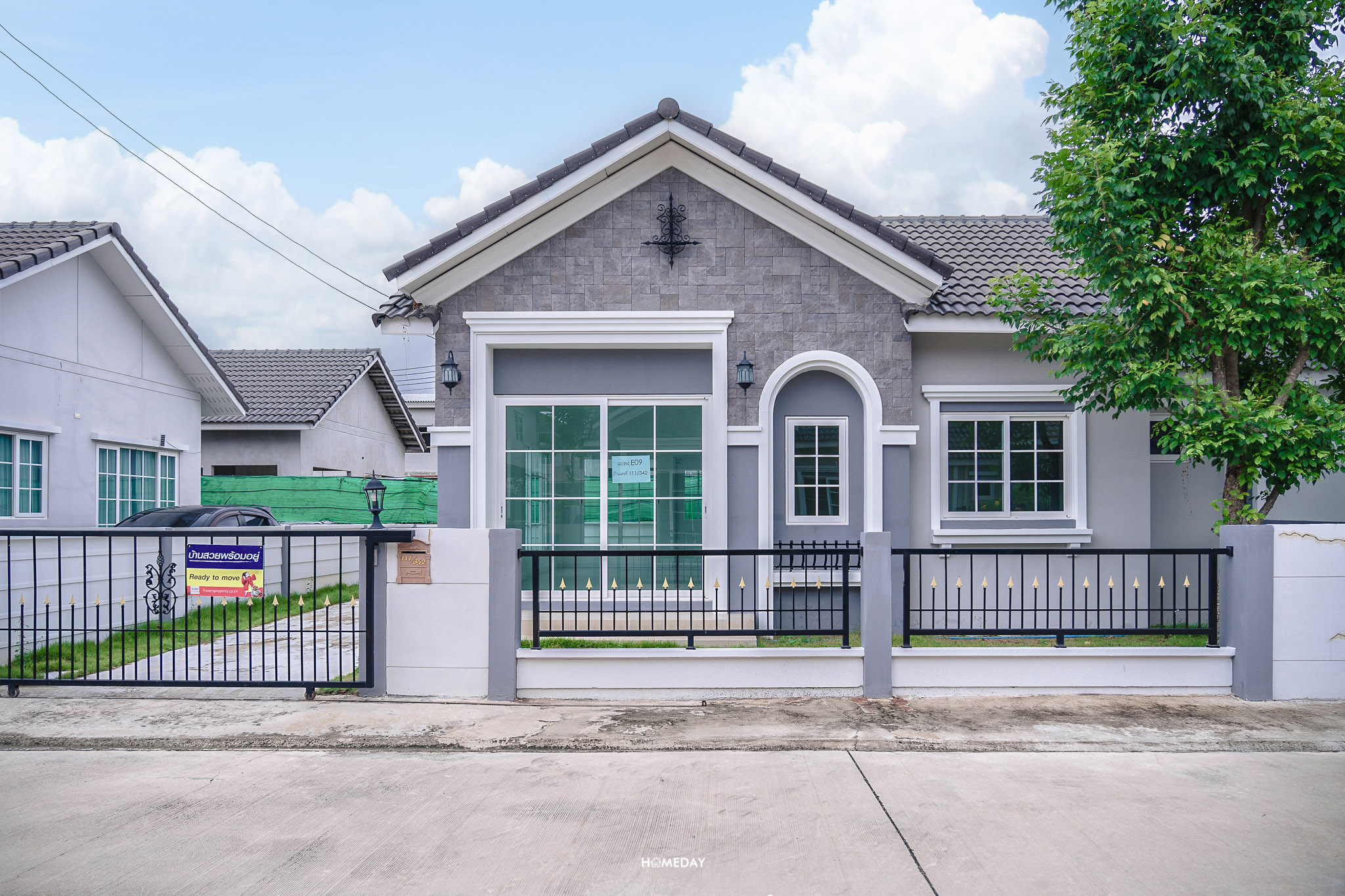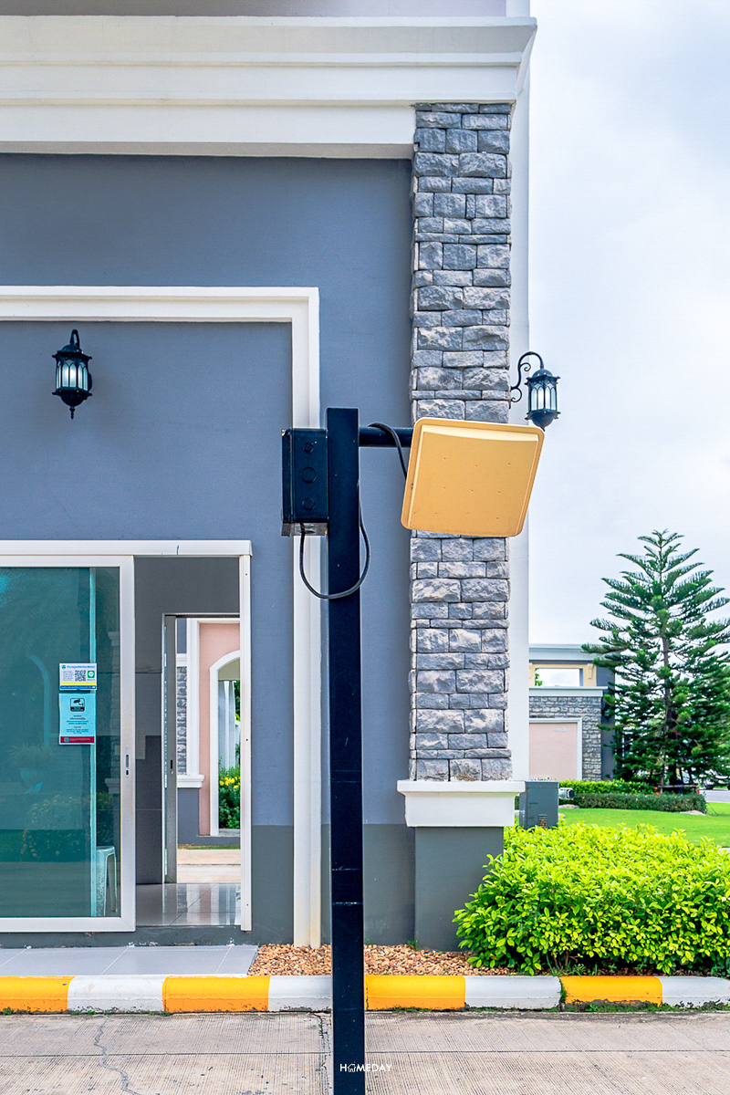 บ้านมาตรฐานจะได้ประตูรั้ว เหล็กดัดสีดำ แบบรางเลื่อน พร้อมกล่องจดหมาย, กริ่งไร้สาย และไฟหัวเสาสไตล์คลาสสิก สวยงาม รับกันกับบ้าน สำหรับโรงจอดรถจะเป็นพื้นคอนกรีตเสริมเหล็ก ขัดหยาบ รองรับการจอดรถยนต์ได้ 2 คัน พร้อมเดินงานระบบน้ำ-ไฟ มาให้เรียบร้อย ส่วนประตู และหน้าต่าง ลูกฟักกระจกเขียวตัดแสง ช่วยลดความร้อน สะท้อน UV บานกรอบเป็น UPVC สีขาว แข็งแรงทนทาน ทั้งหมดนี้ให้เป็นมาตรฐานของโครงการเลยครับ
