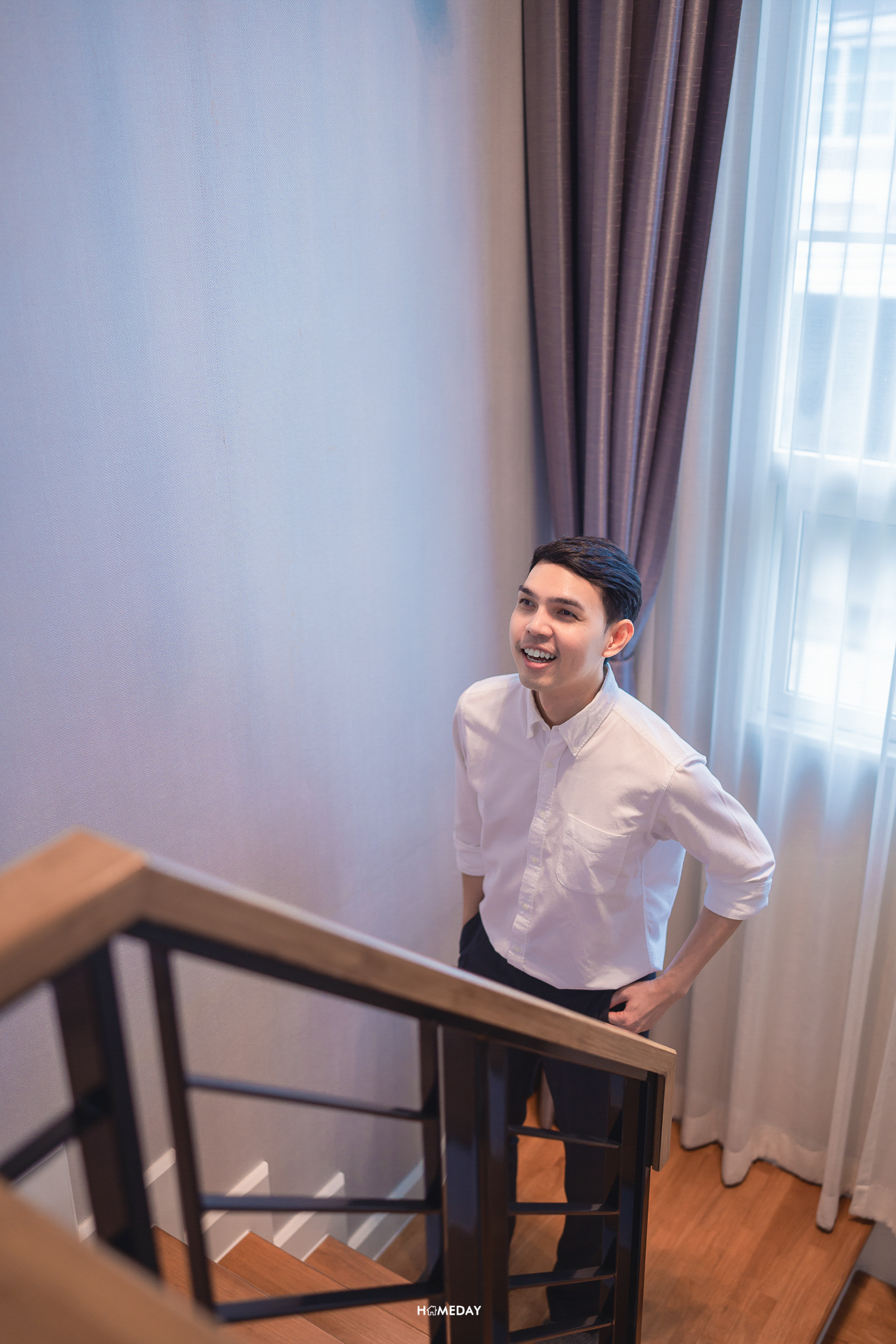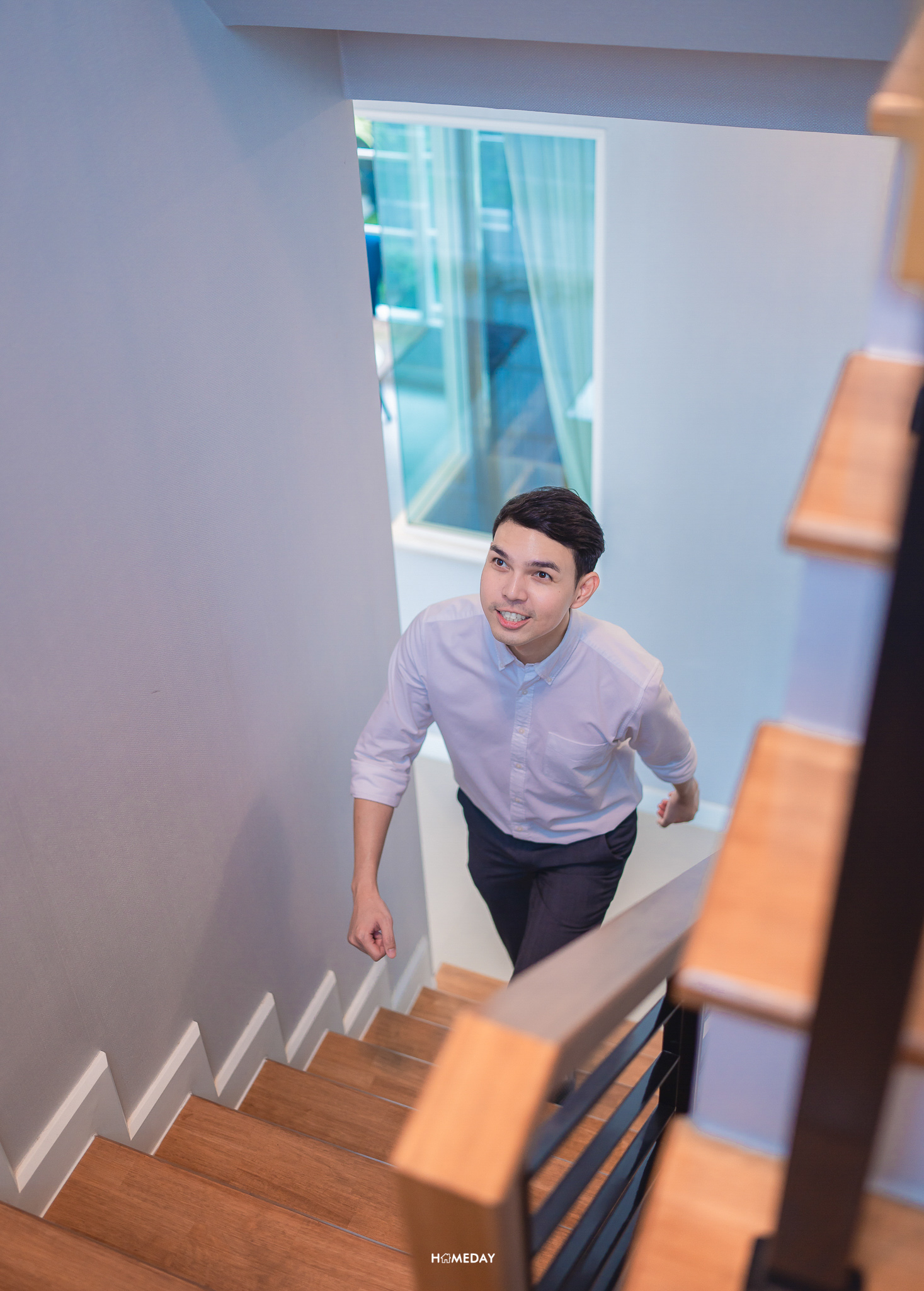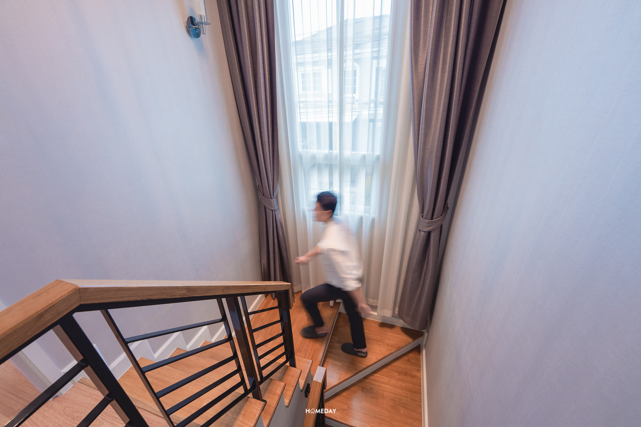 โครงสร้างบันไดเป็นคอนกรีตเสริมเหล็ก บันไดทรง U-Shape ราวบันไดเหล็กสีดำและลูกนอนไม้ยางพารา สร้างความสวยงามและลงตัว ชานพักกว้าง เดินสวนกันได้สะดวก พร้อมโถงบันไดสูงโปร่งที่รับแสงธรรมชาติจากหน้าต่างกระจกบานใหญ่ ทำให้บ้านดูโปร่ง