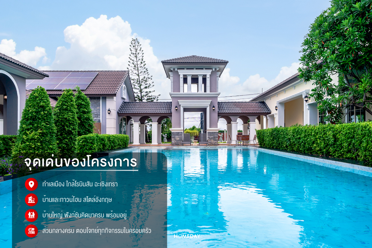 ทำเลที่ตั้ง โครงการตั้งอยู่ติดถนนสาย 3315 อำเภอบ้านโพธิ์ ซึ่งห่างจากถนนสายหลัก ถนนบางปะกง-ฉะเชิงเทรา (314) หรือ ถนนสิริโสธร เพียง 600 เมตร* ทำให้การเดินทางเข้า-ออกโครงการสะดวก สามารถเข้าถึงมอเตอร์เวย์ และทางด่วนบูรพาวิถีได้อย่างสะดวก เชื่อมต่อกรุงเทพฯ และจังหวัดใกล้เคียงเป็นเรื่องง่าย ใกล้แหล่งงานทั้งภาครัฐและเอกชน อาทิ Toyota’s Asia Pacific Global Production Center (AP-GPC), นิคมฯ TFD และนิคมฯ BP เป็นต้น พร้อมแหล่งอำนวยความสะดวกมากมายรอบโครงการ อาทิ Robinson, Mega Home และ FN Outlet ใกล้โรงพยาบาลในจังหวัดอย่างโรงพยาบาลเกษมราษฎร์ ฉะเชิงเทรา, โรงพยาบาลพุทธโสธร และรวมไปถึงสถาบันการศึกษาชั้นนำ เช่น โรงเรียนอินเตอร์ทอทส์ ไตรลิงกวล, โรงเรียนสุจิปุลิ, โรงเรียนดัดดรุณี และโรงเรียนเบญจมราชรังสฤษฎิ์ เป็นทำเลศักยภาพที่ตอบโจทย์ทุกช่วงชีวิตของทุกคนในครอบครัวได้อย่างแน่นอน