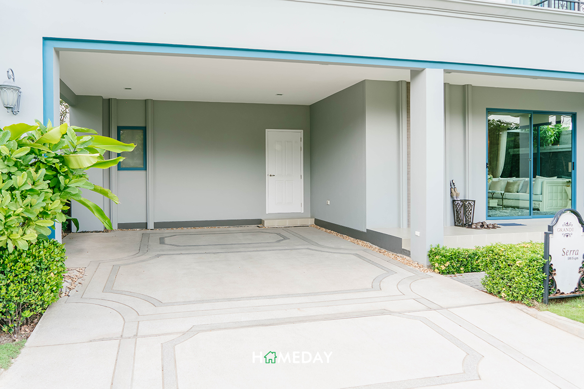 แบบบ้าน Serra เป็นแบบบ้านแรกที่เราจะพามาชมกันในวันนี้ค่ะ ด้านหน้าตัวบ้านมีพื้นที่จอดรถในร่มสำหรับ 2 คัน และมีประตูทางเข้าเชื่อมลานจอดรถมาให้ ภาพรวม Facade ของบ้านมีการใส่เส้นสีน้ำเงินลงไปในองค์ประกอบของขอบบานหน้าต่าง บานประตู ให้โทนสีที่ล้อกันไปกับภาพรวมของโครงการเลยค่ะ