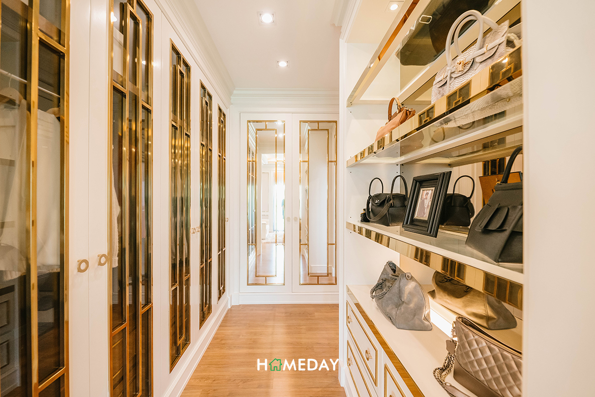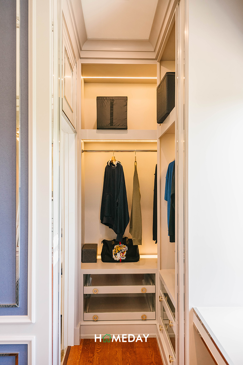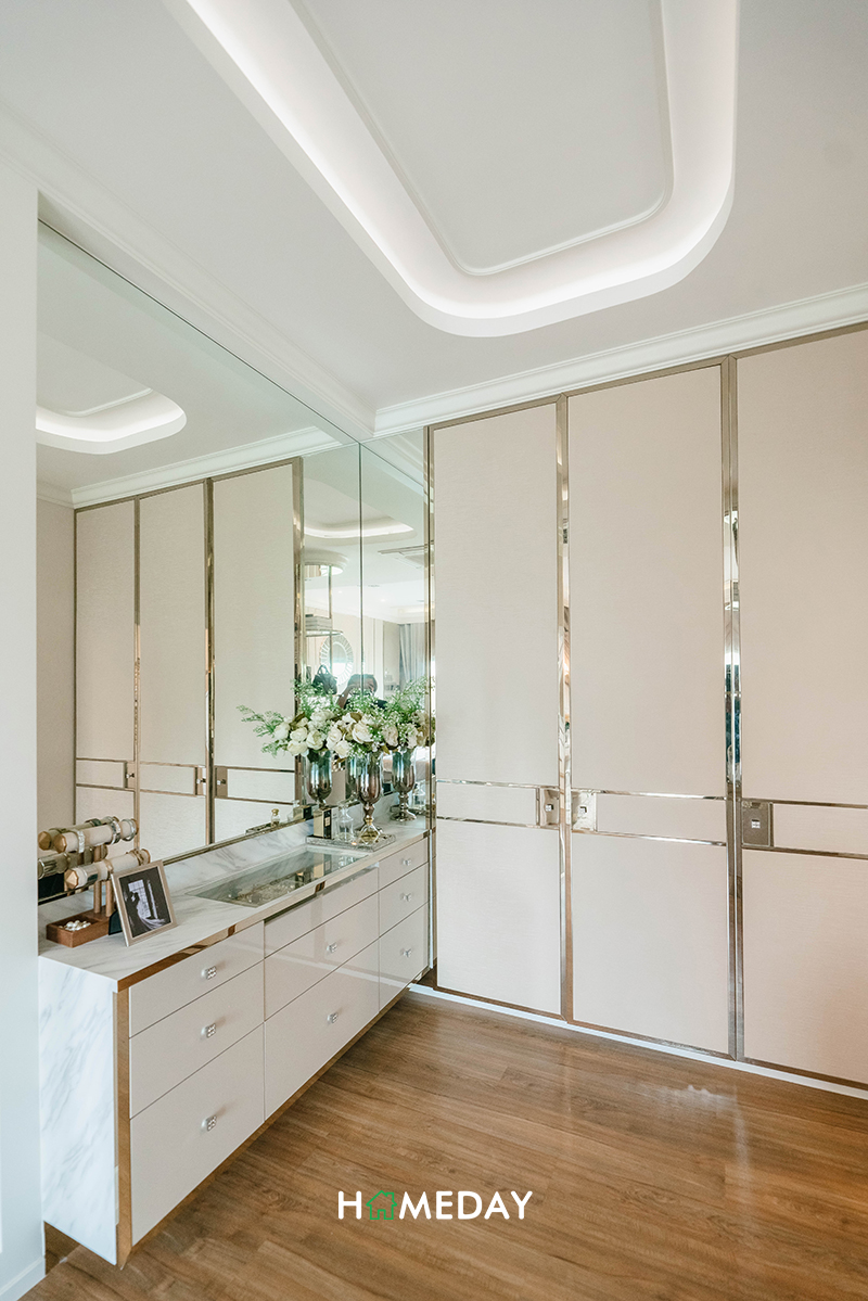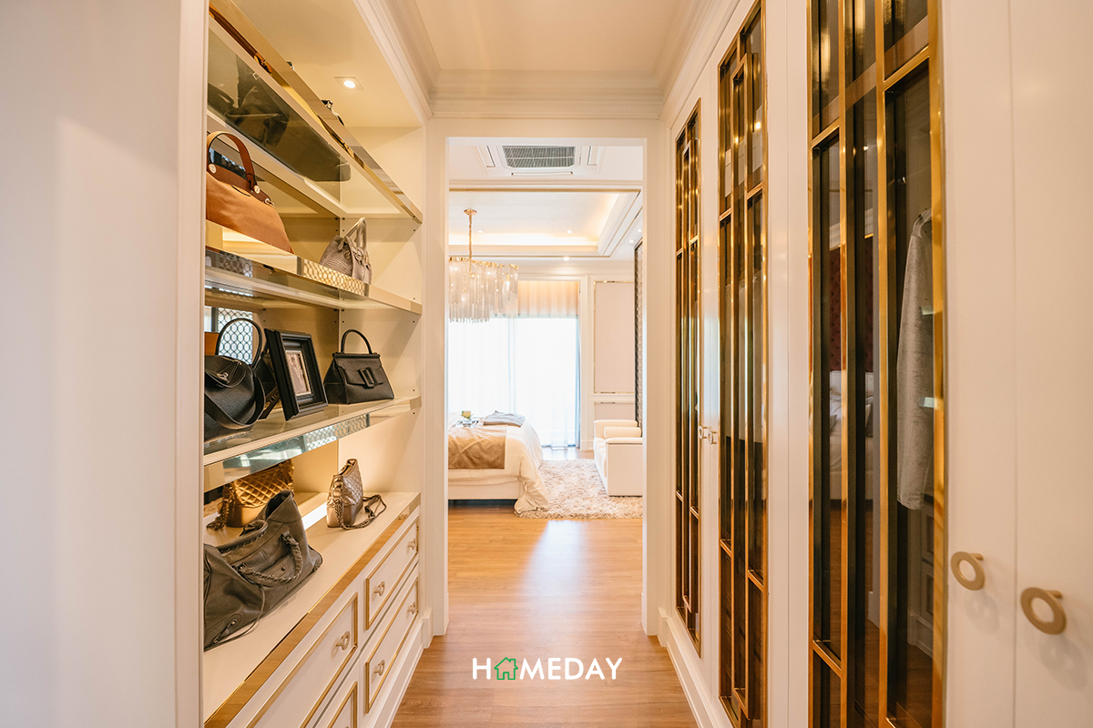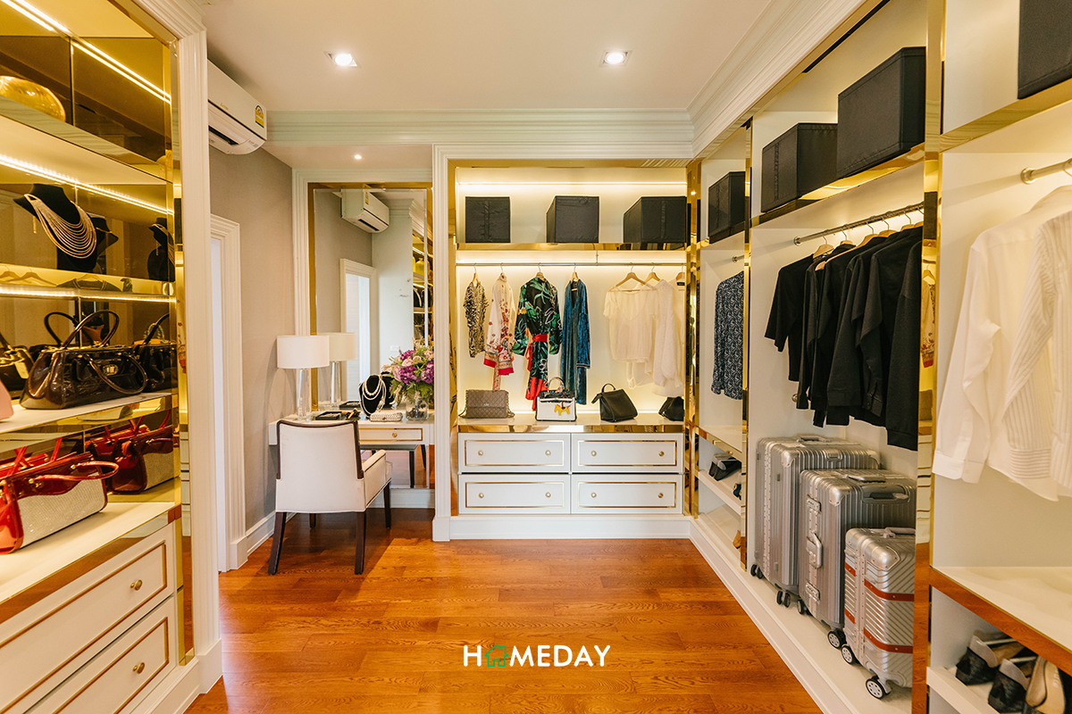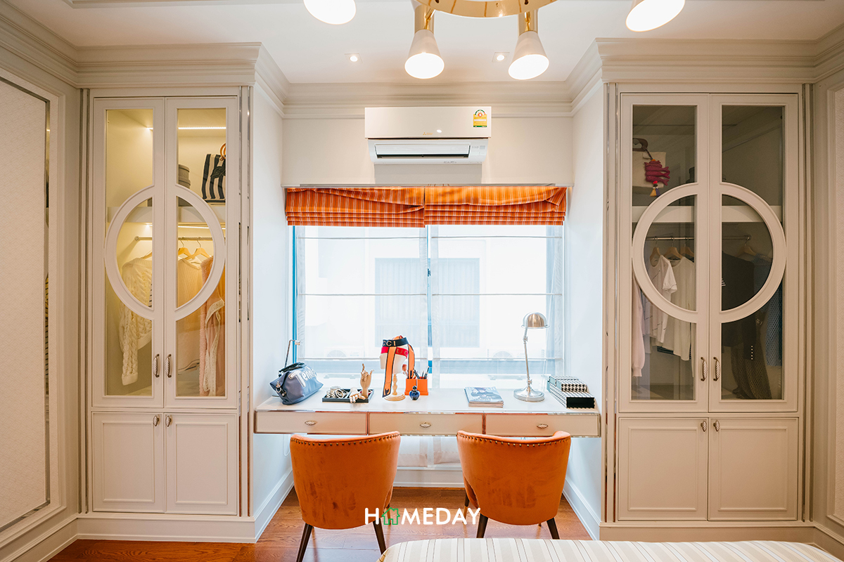 ส่วนทางฝั่งซ้าย จะเป็นพื้นที่ใช้งาน เชื่อมกับห้องน้ำภายในของห้อง ส่วนนี้ทางโครงการตกแต่งให้ดูเป็น Walk-in Closet เต็มรูปแบบ มีตู้ไอร์แลนด์อยู่ที่กึ่งกลางของพื้นที่ด้วย สำหรับใครที่เป็นสายแฟชัน มีเสื้อผ้าเครื่องแต่งกาย เครื่องประดับเยอะ บิลต์พื้นที่จัดเก็บออกมาในลักษณะนี้ก็ดูดีและหยิบใช้งานง่ายทีเดียวค่ะ
