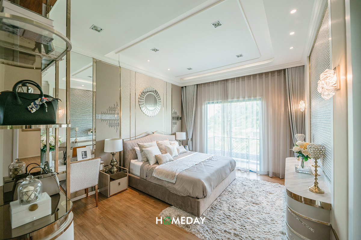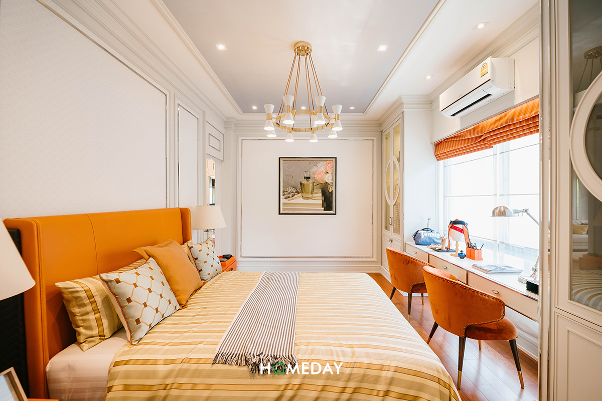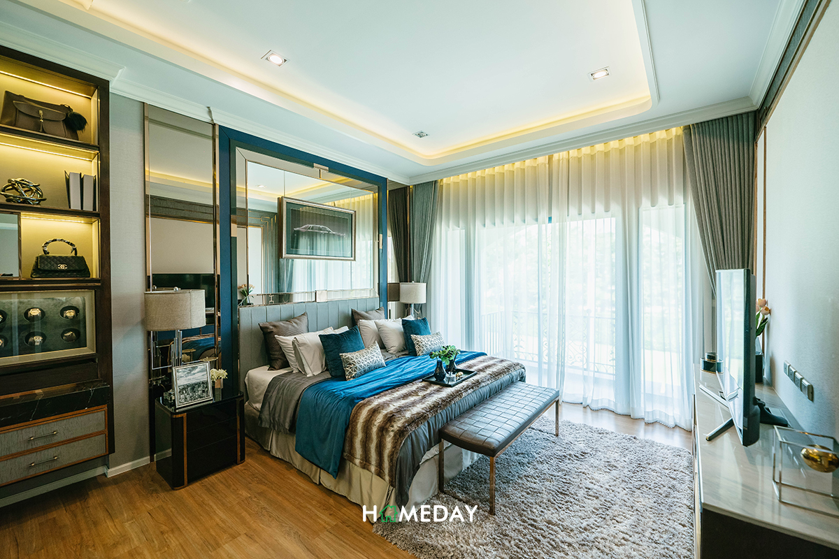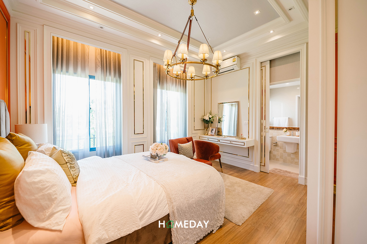 มาถึงในส่วนพักผ่อนส่วนตัวอย่าง Master Bedroom กันบ้างค่ะ แบบบ้านนี้ให้มาพิเศษ โอ่โถง มีพื้นที่ใช้สอยเหลือใช้มาก ๆ ภายในห้องเป็นลักษณะแปลนหน้ากว้าง แบ่งพื้นที่การใช้งานออกเป็น 2 ฝั่ง คือส่วนใช้งานและส่วนพักผ่อน ช่องแสงรับมาจากประตูบานเลื่อนกระจกใสเชื่อมระเบียงและบานหน้าต่างขนาดใหญ่ ทำให้ห้องดูโปร่งมากขึ้นไปอีกค่ะ