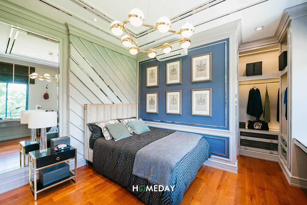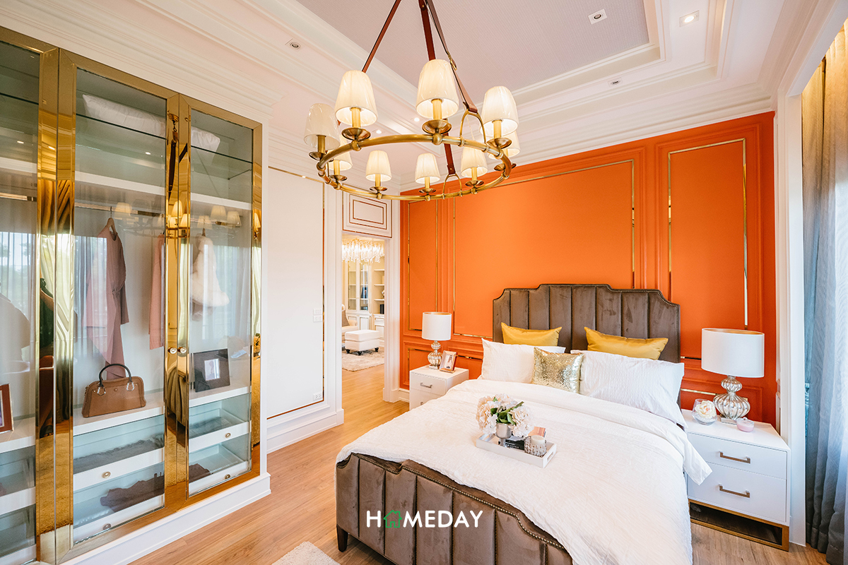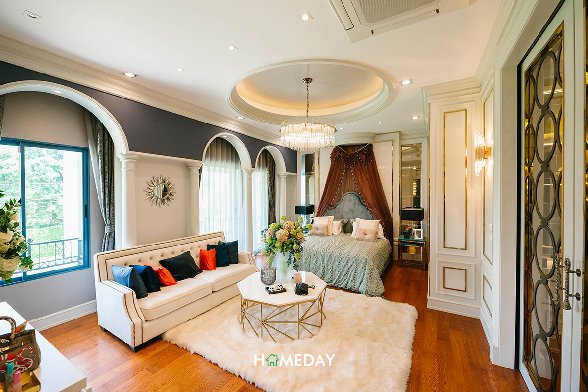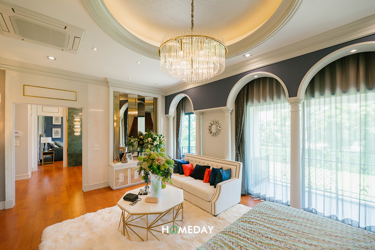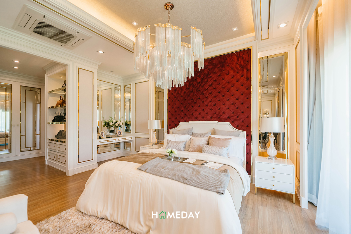 มาถึงในส่วนพักผ่อนส่วนตัวอย่าง Master Bedroom กันบ้างค่ะ แบบบ้านนี้ให้มาพิเศษ โอ่โถง มีพื้นที่ใช้สอยเหลือใช้มาก ๆ ภายในห้องเป็นลักษณะแปลนหน้ากว้าง แบ่งพื้นที่การใช้งานออกเป็น 2 ฝั่ง คือส่วนใช้งานและส่วนพักผ่อน ช่องแสงรับมาจากประตูบานเลื่อนกระจกใสเชื่อมระเบียงและบานหน้าต่างขนาดใหญ่ ทำให้ห้องดูโปร่งมากขึ้นไปอีกค่ะ