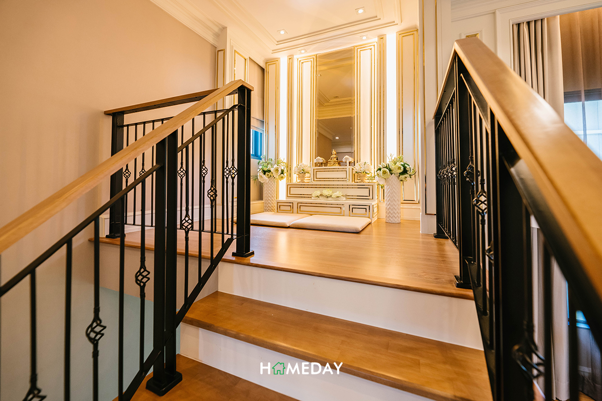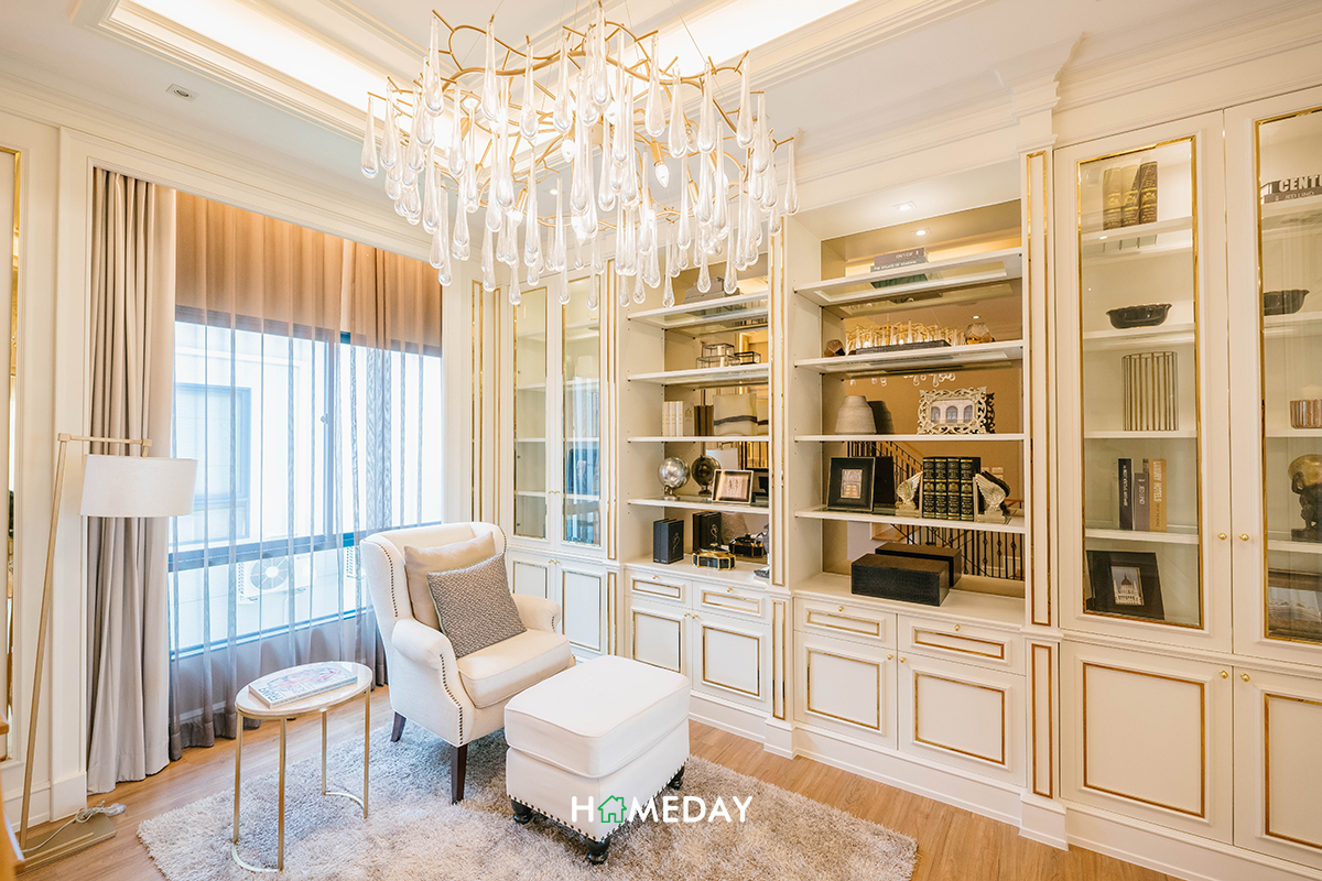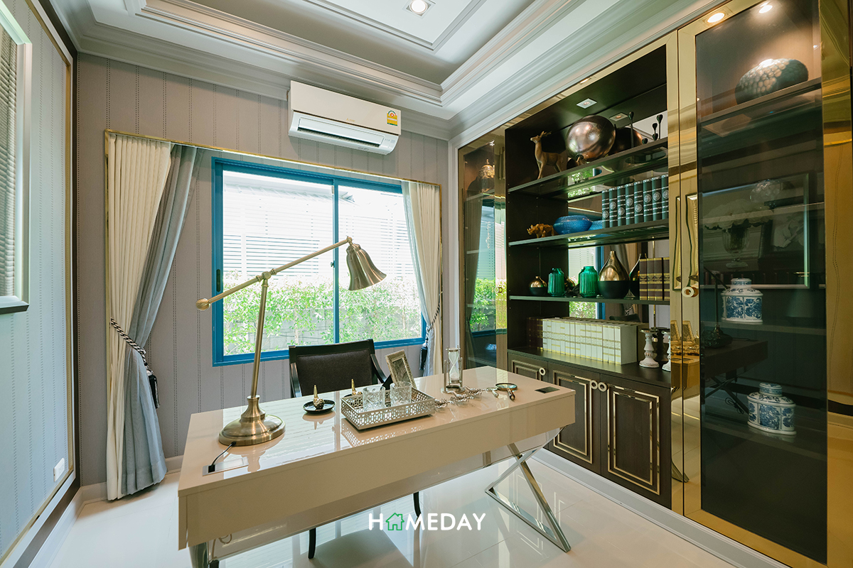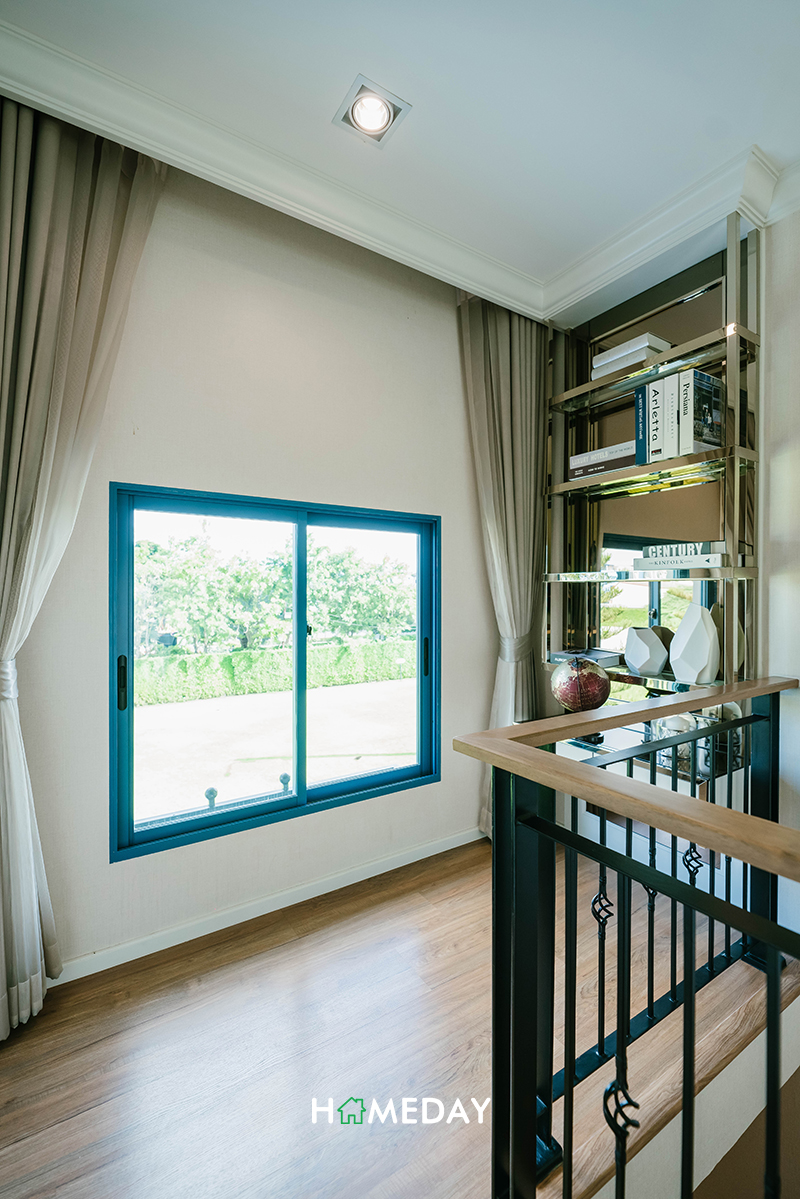 ตัวชั้นลอยทางโครงการตกแต่งให้ดูเป็นห้องพระ ซึ่งในบ้านจริงเราอาจจะปรับเปลี่ยนเป็นพื้นที่อื่น ๆ ตามความต้องการก็ได้ค่ะ ส่วนตัวโถง ทางโครงการดีไซน์ให้ดูเป็นลักษณะของมุมนั่งพักผ่อนอ่านหนังสือ มีการวางตู้หนังสือและอาร์มแชร์ หากใครอยากจะตกแต่งตามแบบบ้านตัวอย่างนี้ก็ลงตัวทีเดียวค่ะ เพราะตรงส่วนนี้ก็มีบานหน้าต่างขนาดใหญ่เปิดรับแสงเอาไว้ให้ด้วย เรียกได้ว่าบรรยากาศดี นั่งจิบชาอ่านหนังสือยามบ่ายกันได้แบบชิลล์ ๆ เลย
