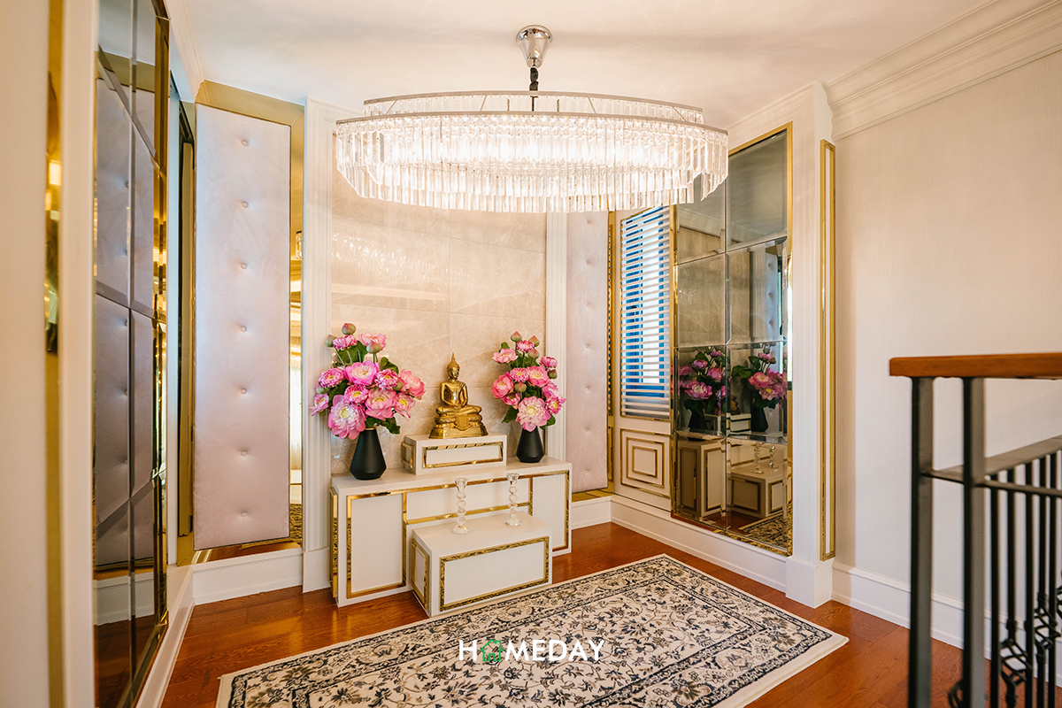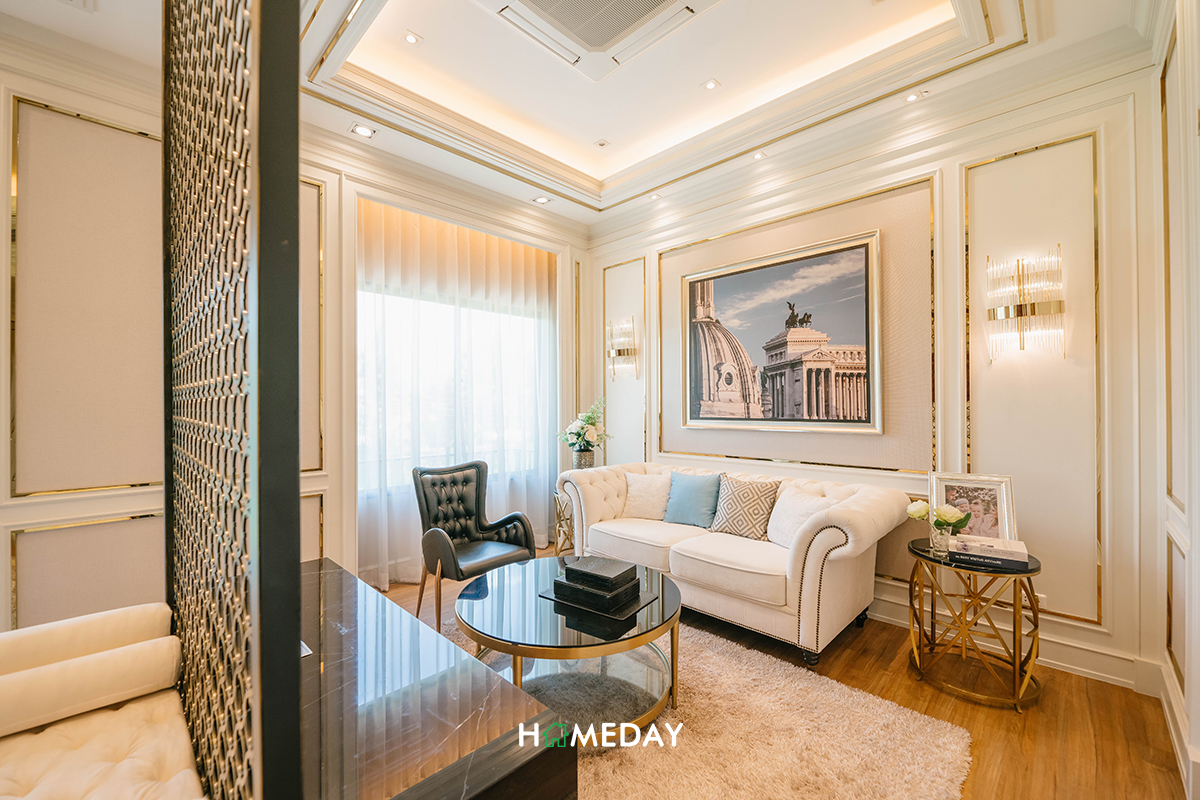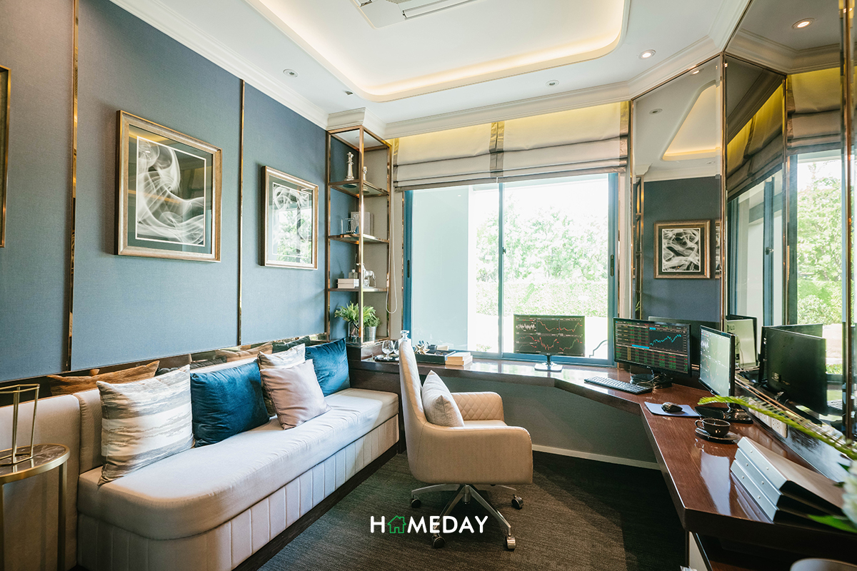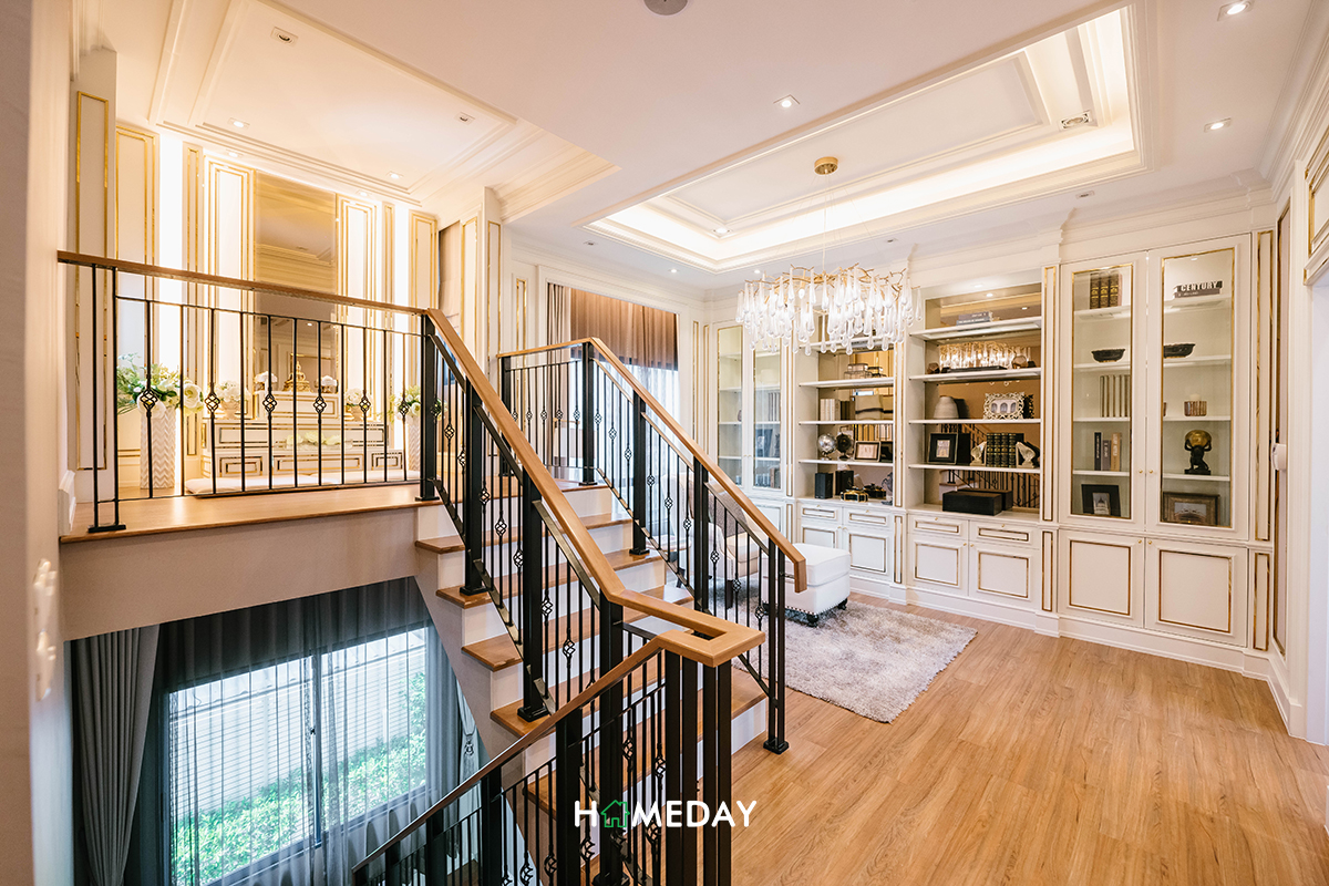 ตัวชั้นลอยทางโครงการตกแต่งให้ดูเป็นห้องพระ ซึ่งในบ้านจริงเราอาจจะปรับเปลี่ยนเป็นพื้นที่อื่น ๆ ตามความต้องการก็ได้ค่ะ ส่วนตัวโถง ทางโครงการดีไซน์ให้ดูเป็นลักษณะของมุมนั่งพักผ่อนอ่านหนังสือ มีการวางตู้หนังสือและอาร์มแชร์ หากใครอยากจะตกแต่งตามแบบบ้านตัวอย่างนี้ก็ลงตัวทีเดียวค่ะ เพราะตรงส่วนนี้ก็มีบานหน้าต่างขนาดใหญ่เปิดรับแสงเอาไว้ให้ด้วย เรียกได้ว่าบรรยากาศดี นั่งจิบชาอ่านหนังสือยามบ่ายกันได้แบบชิลล์ ๆ เลย