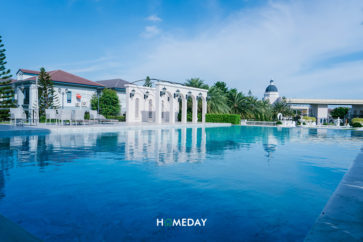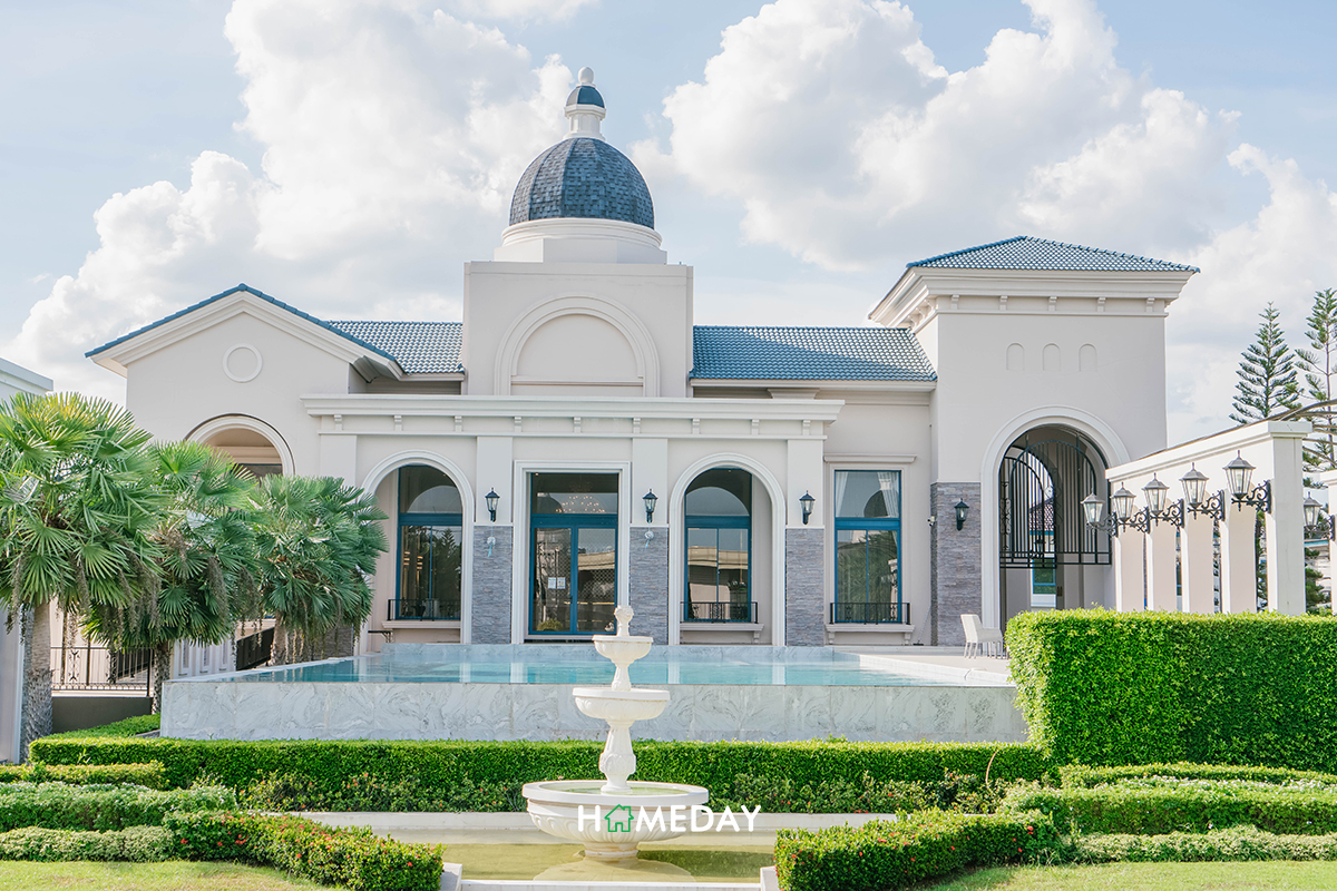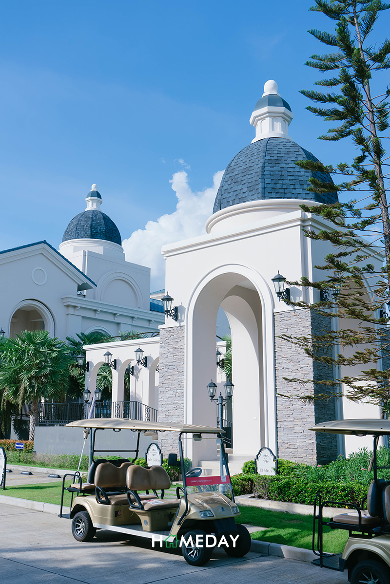 สถาปัตยกรรมและบรรยากาศโดยรอบของ Clubhouse ล้อไปกับซุ้มทางเข้าโครงการค่ะ มีการออกแบบซุ้มโค้งและหลังคาโดมสีน้ำเงินในสไตล์อิตาลีเช่นกัน เสมือนเราได้อาศัยอยู่ในบ้านพักตากอากาศที่ต่างประเทศเลยล่ะค่ะ