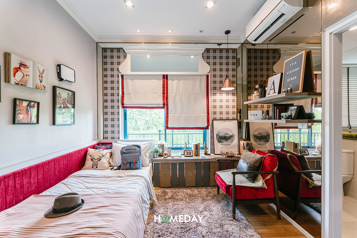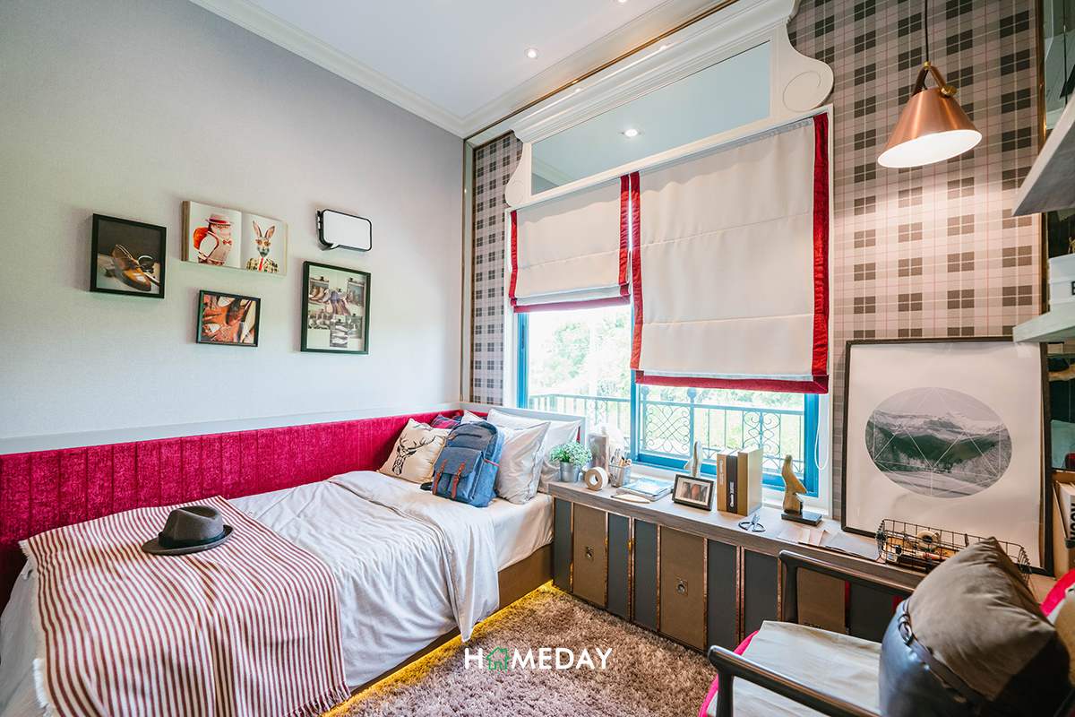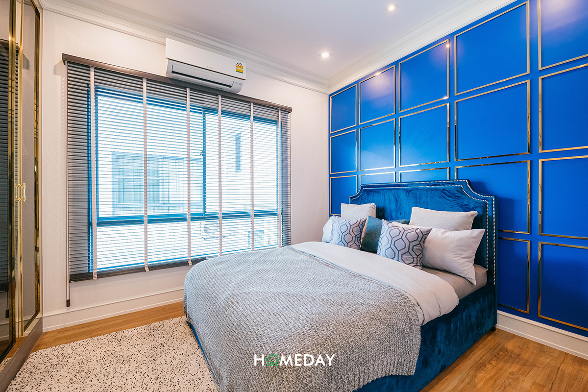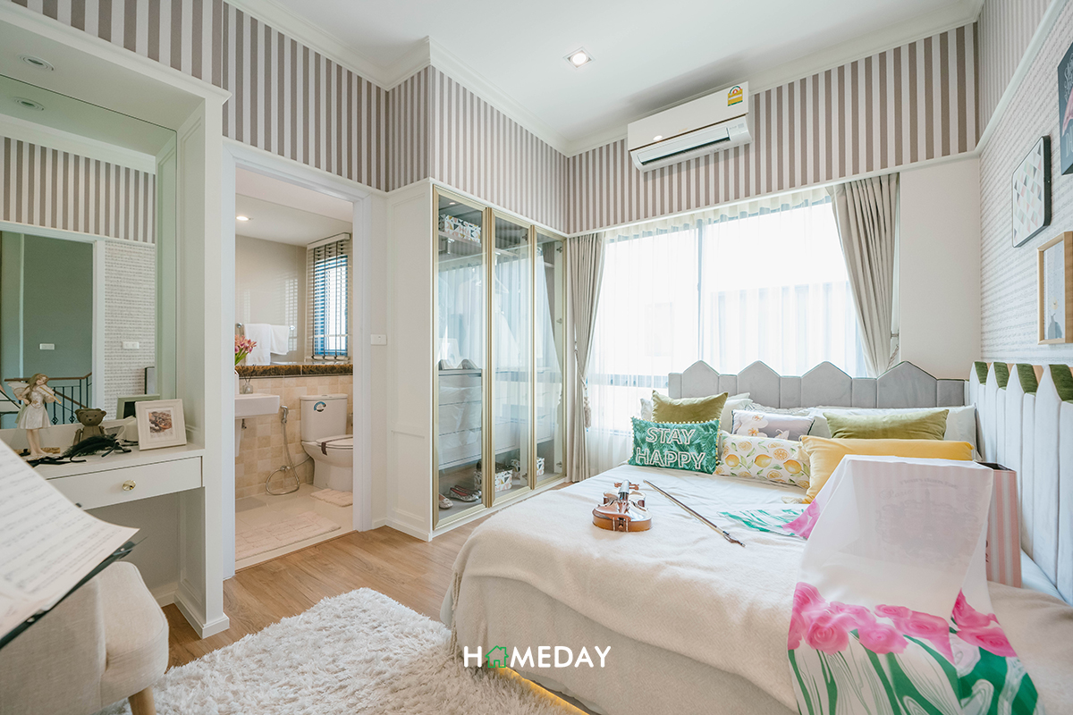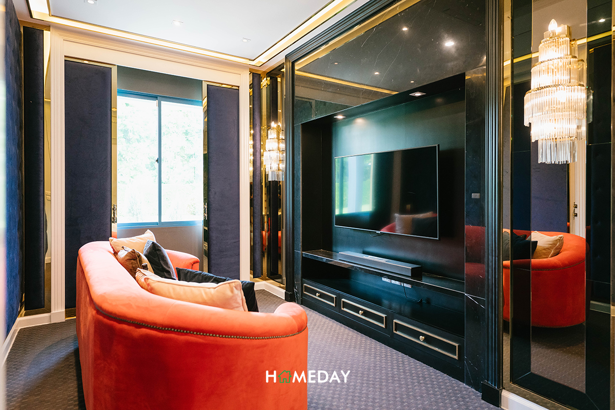 Bedroom 4 ภายในมีห้องน้ำในตัวด้วยนะคะ พิเศษมาก ๆ เลย ห้องนี้ทางโครงการตกแต่งให้ดูเป็นโรงหนังส่วนตัว ทำฉากทึบแสง กั้นบานหน้าต่าง ที่สามารถเลื่อนเปิดปิดได้ แบบนี้ดีกว่าม่านค่ะ รับชมภาพยนตร์ได้เต็มอรรถรสอย่างแน่นอน ใครสนใจจะนำไอเดียไปใช้กับบ้านของตัวเองก็ได้นะคะ หรือหากจะปรับเป็นห้องนอน ก็สามารถวางเตียงขนาด 3.5 ฟุตได้ โดยที่ยังมีพื้นที่เหลือสำหรับวางเฟอร์นิเจอร์พื้นฐานครบค่ะ