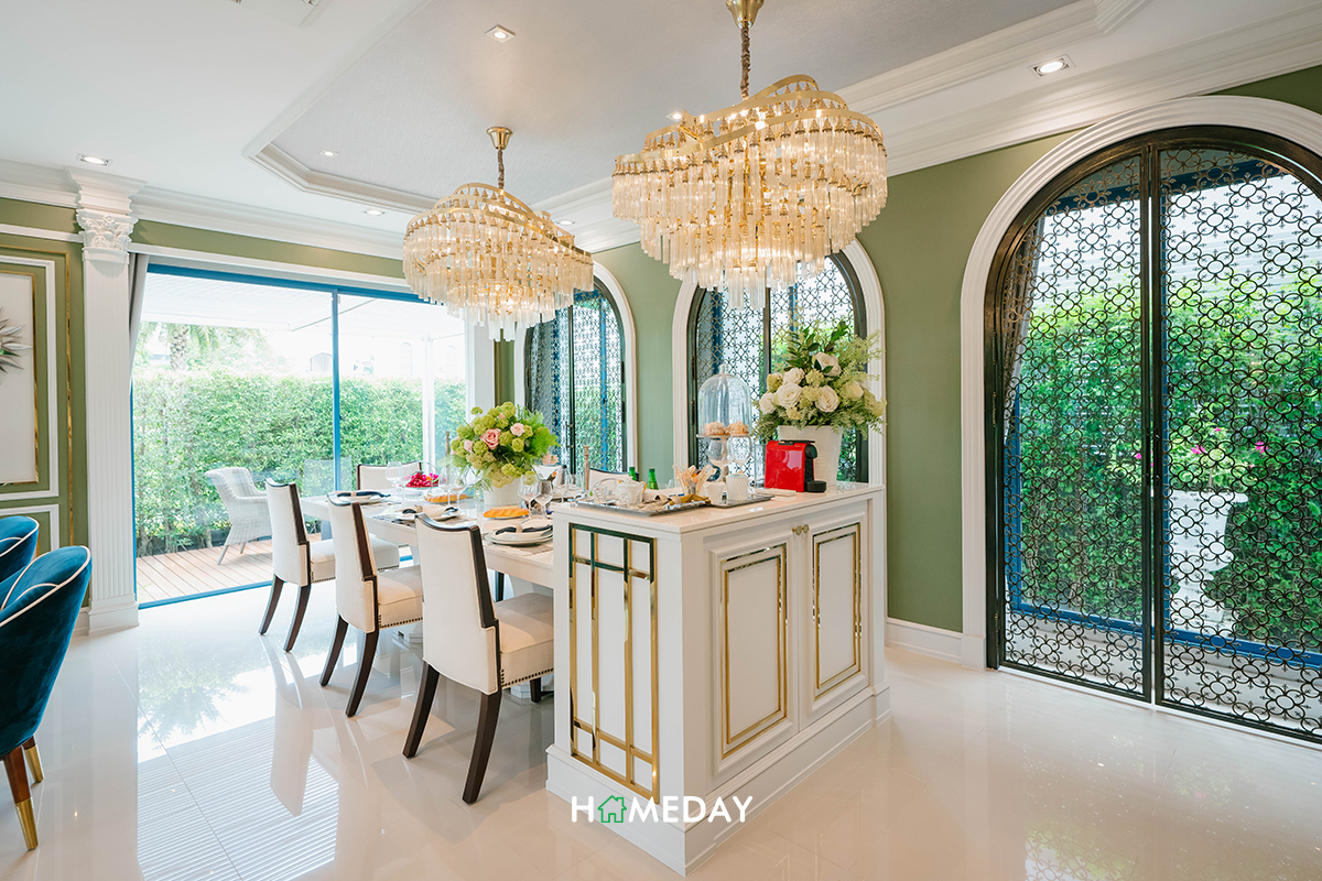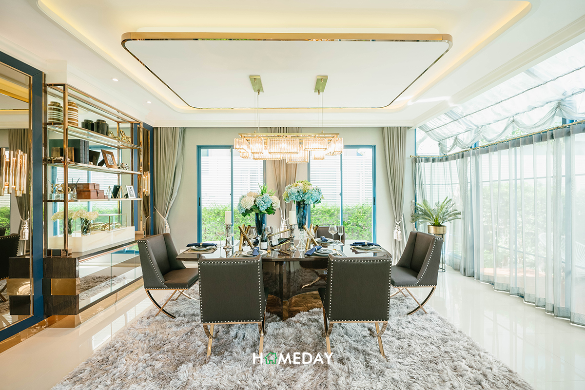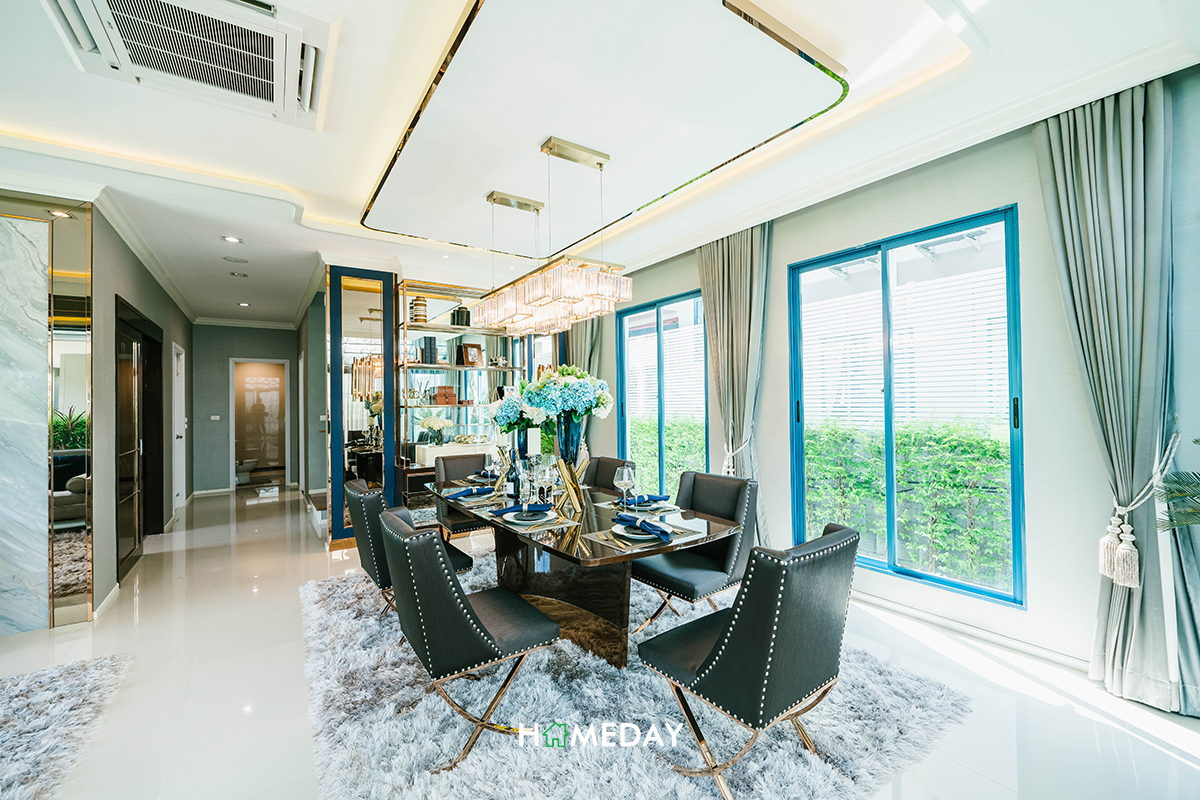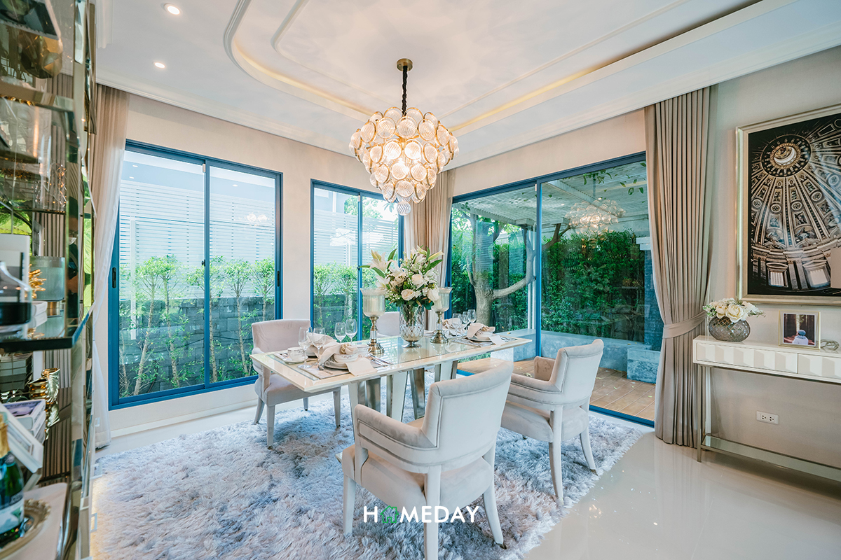 เข้ามาดูส่วนพื้นที่นั่งรับประทานอาหารกันใกล้ ๆ บริเวณนี้สามารถวางชุดโต๊ะพร้อมเก้าอี้ขนาด 6-8 ที่นั่งได้เลยค่ะ มีพื้นที่เหลือให้เดินเข้า-ออกได้สะดวกแน่นอน อีกทั้งยังสามารถวางชั้นโชว์เพิ่มเติมได้ด้วยนะคะ แบบในบ้านตัวอย่างเลย เพราะส่วนนี้ มีทางเชื่อมกับสวนด้านนอก ที่เป็นลักษณะของ Glass House พร้อมประตูบานเลื่อน ยื่นเพิ่มออกมาพอสมควรจากพื้นที่ด้านกว้างของ Living Area ทำให้มีพื้นที่ปาร์ตี้ รับแขก นั่งรับประทานอาหารที่บริเวณนี้ได้มากขึ้นนั่นเองค่ะ