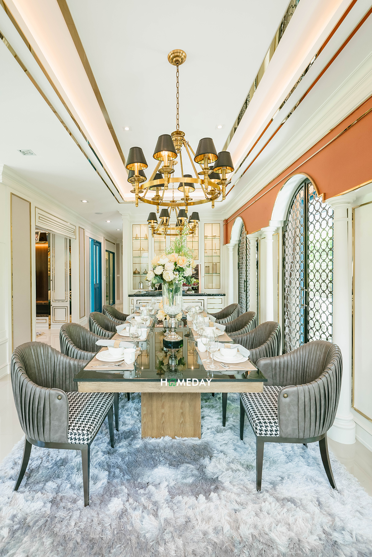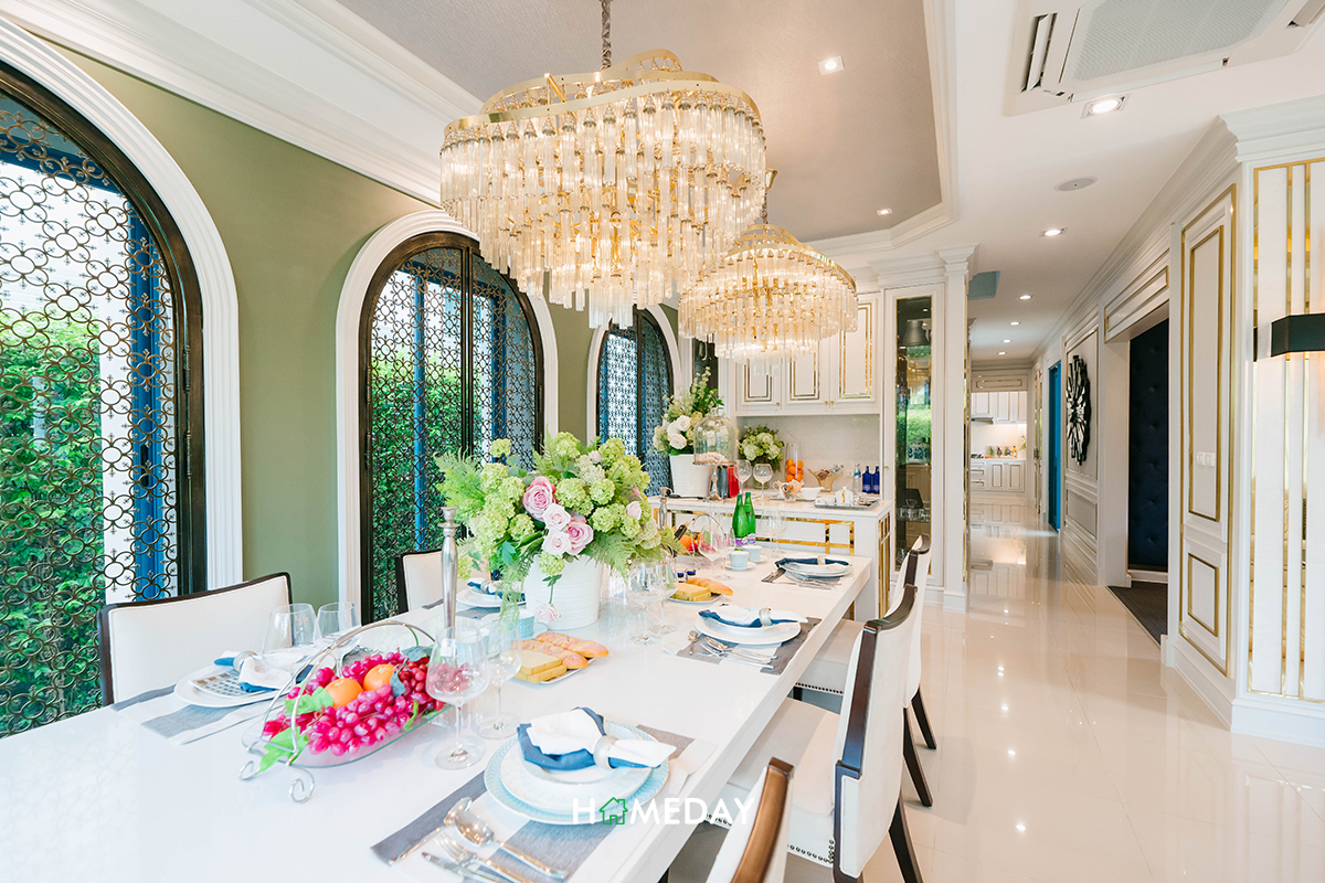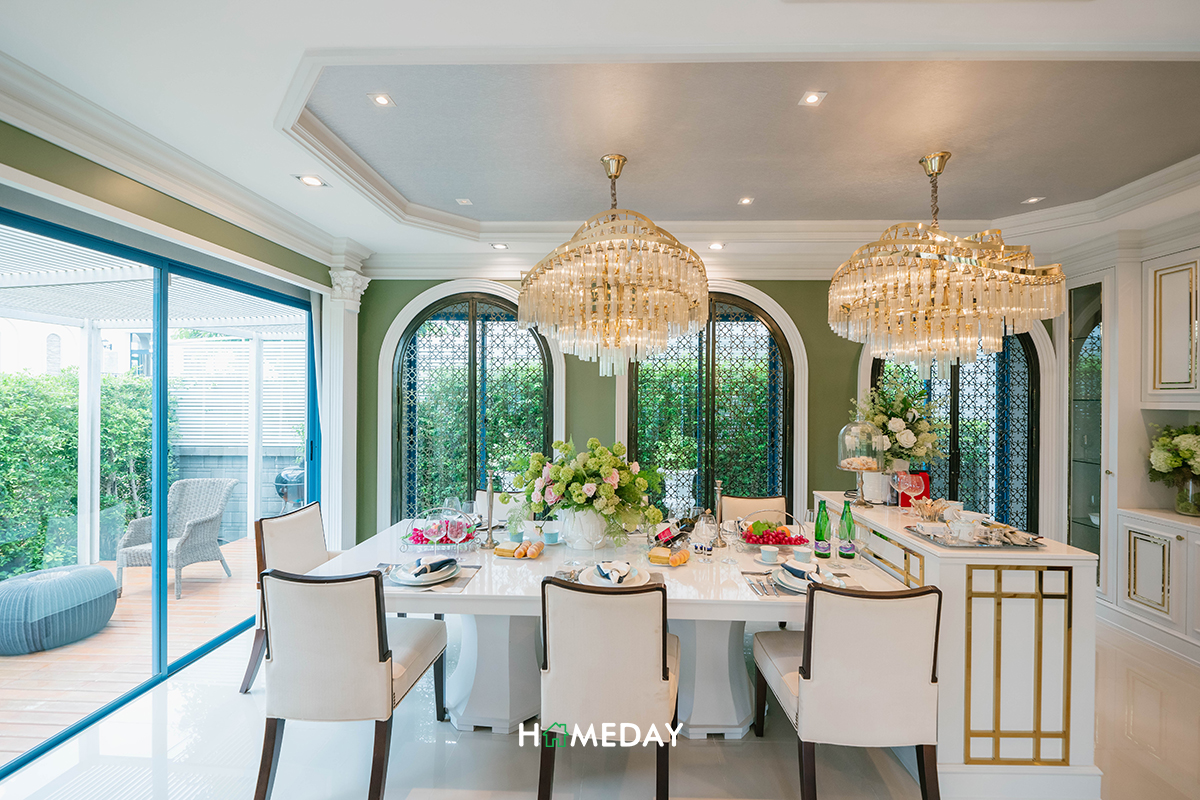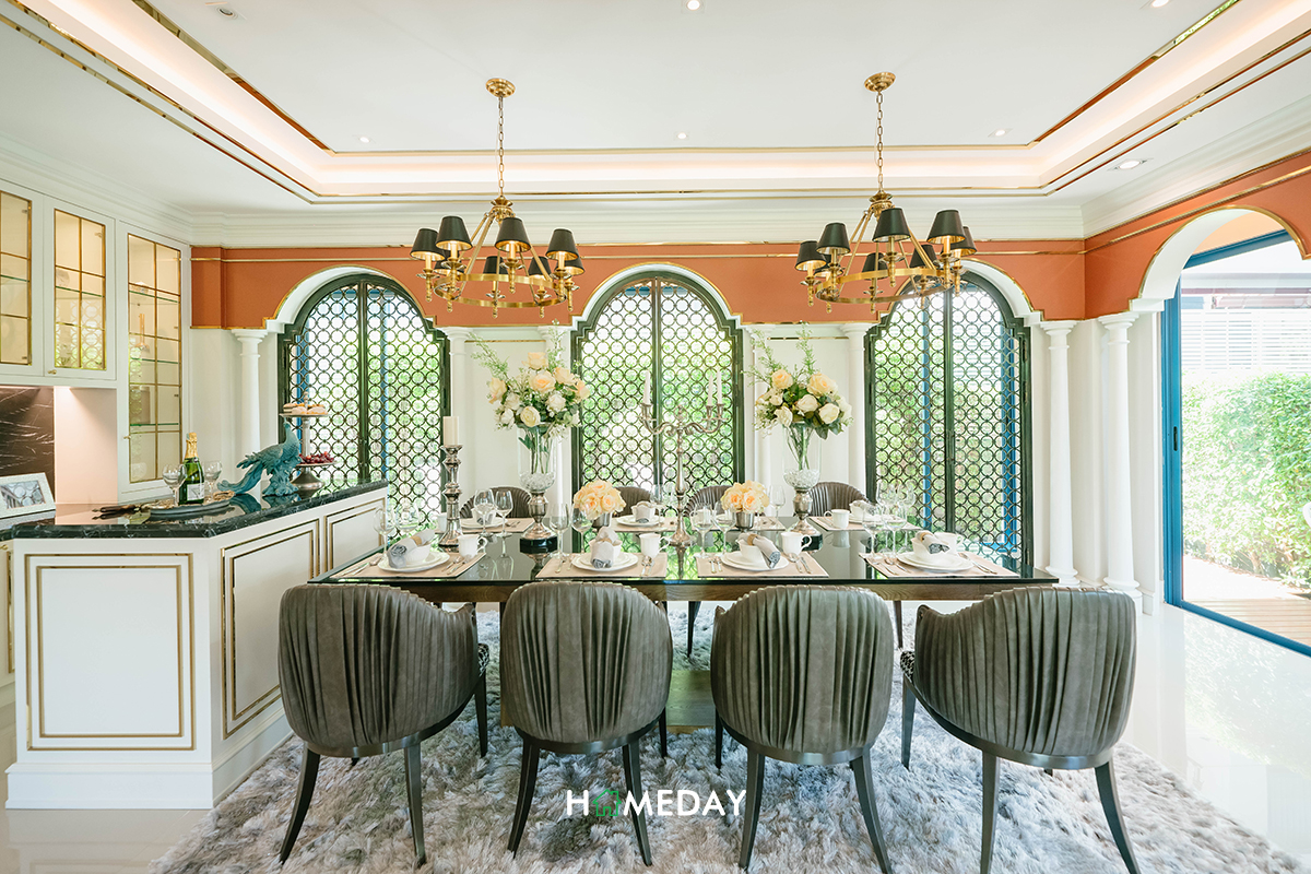 เข้ามาดูส่วนพื้นที่นั่งรับประทานอาหารกันใกล้ ๆ บริเวณนี้สามารถวางชุดโต๊ะพร้อมเก้าอี้ขนาด 6-8 ที่นั่งได้เลยค่ะ มีพื้นที่เหลือให้เดินเข้า-ออกได้สะดวกแน่นอน อีกทั้งยังสามารถวางชั้นโชว์เพิ่มเติมได้ด้วยนะคะ แบบในบ้านตัวอย่างเลย เพราะส่วนนี้ มีทางเชื่อมกับสวนด้านนอก ที่เป็นลักษณะของ Glass House พร้อมประตูบานเลื่อน ยื่นเพิ่มออกมาพอสมควรจากพื้นที่ด้านกว้างของ Living Area ทำให้มีพื้นที่ปาร์ตี้ รับแขก นั่งรับประทานอาหารที่บริเวณนี้ได้มากขึ้นนั่นเองค่ะ