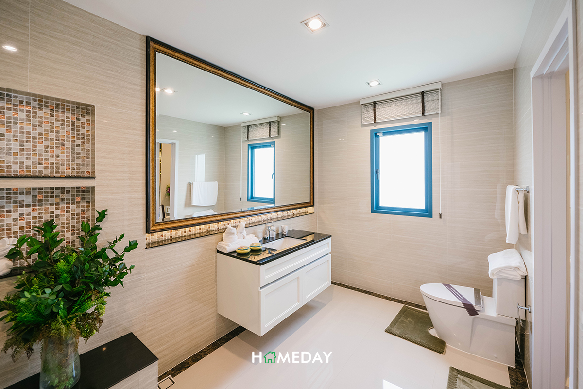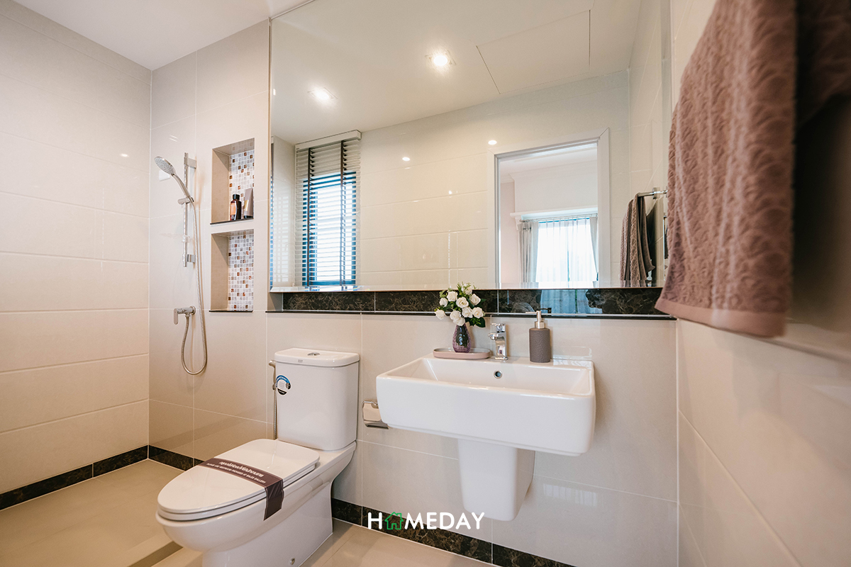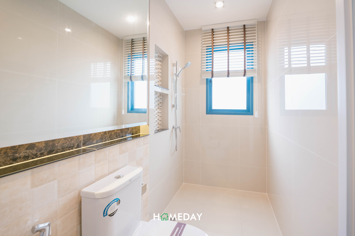 ภายในห้องน้ำของ Master Bedroom ให้กระจกเงาบานใหญ่ มาพร้อมชุดสุขภัณฑ์ครบครันจาก American Standard อีกเช่นกัน ตัวผนัง Drop Wall เอาไว้ให้ สามารถวางขวดสบู่แชมพูได้เลยค่ะ ติดกับโถสุขภัณฑ์ก็มีบานหน้าต่างมาไว้ให้ด้วย สามารถรับแสงตอนกลางวันได้แบบไม่ต้องเปิดไฟให้เปลืองเลยค่ะ อีกทั้งยังสามารถเปิดเพื่อระบายอากาศได้ด้วย