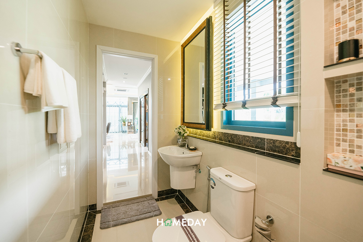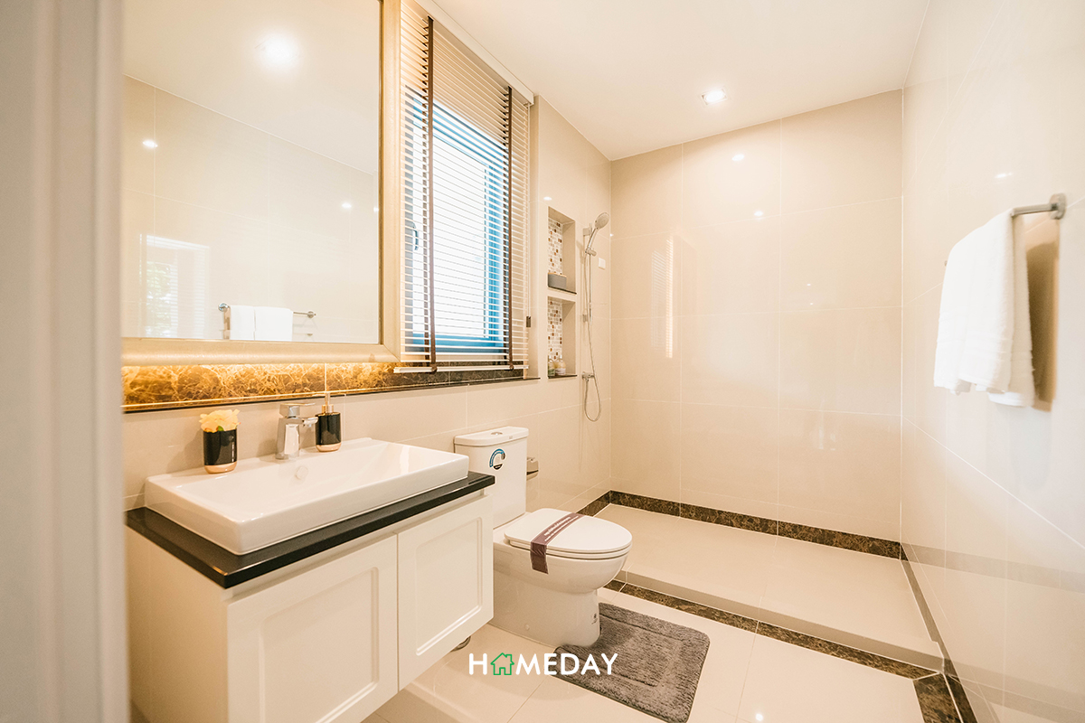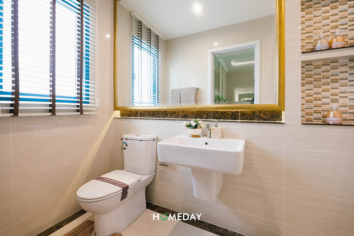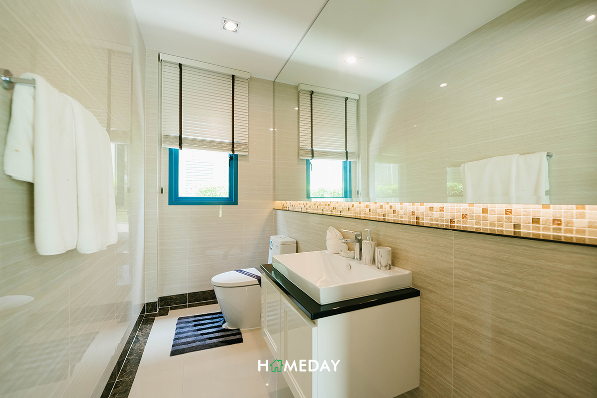 ภายในห้องน้ำของ Master Bedroom ให้กระจกเงาบานใหญ่ มาพร้อมชุดสุขภัณฑ์ครบครันจาก American Standard อีกเช่นกัน ตัวผนัง Drop Wall เอาไว้ให้ สามารถวางขวดสบู่แชมพูได้เลยค่ะ ติดกับโถสุขภัณฑ์ก็มีบานหน้าต่างมาไว้ให้ด้วย สามารถรับแสงตอนกลางวันได้แบบไม่ต้องเปิดไฟให้เปลืองเลยค่ะ อีกทั้งยังสามารถเปิดเพื่อระบายอากาศได้ด้วย