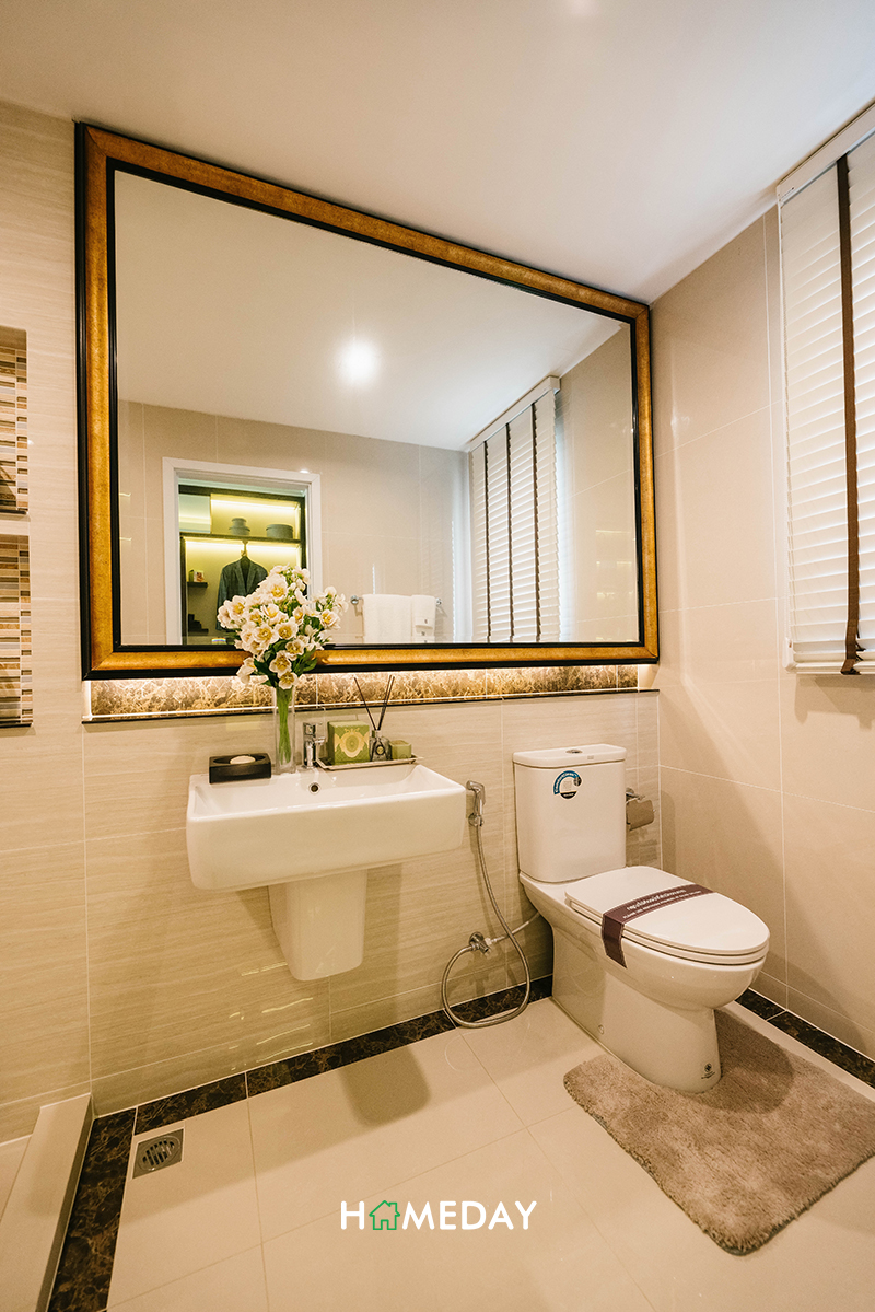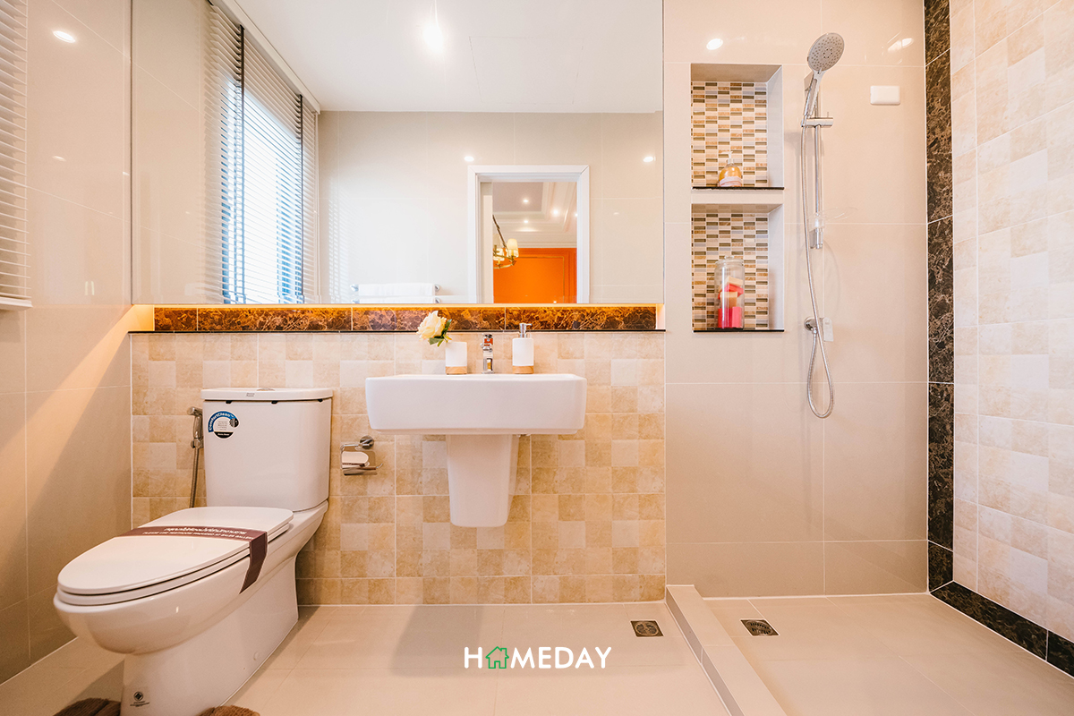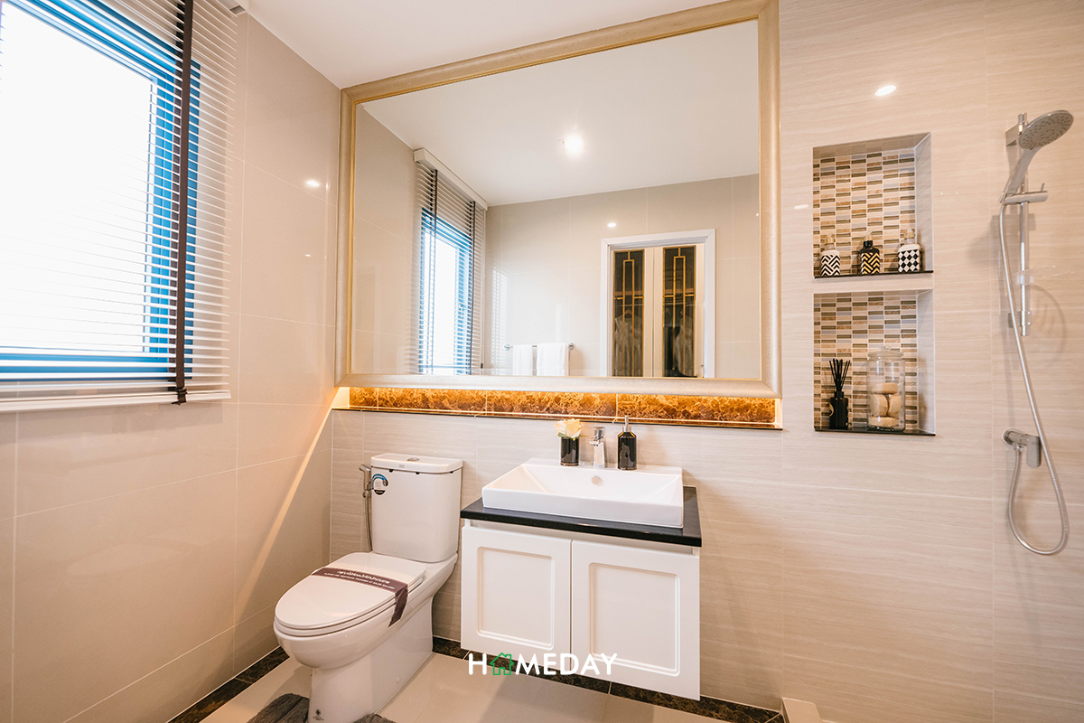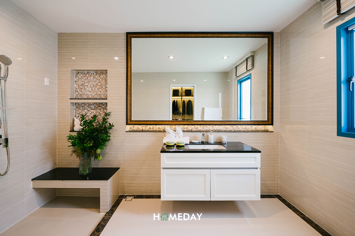 ห้องน้ำภายในของ Master Bedroom ก็อลังการไม่แพ้ตัวห้องเลยค่ะ ภายในมีพื้นที่กว้างมาก ๆ พื้นที่ในส่วนแห้งจะมีบานกระจกขนาดใหญ่เต็มพื้นที่ พร้อมด้วยอ่างล้างหน้าฝังเคาน์เตอร์ ให้ท็อปมาขนาดกว้างทีเดียวค่ะ มีพื้นที่สำหรับวางแปรงสีฟัน, โฟมล้างหน้า, สบู่ล้างมือ, เทียนหอม และอื่น ๆ ได้เยอะเลยค่ะ ส่วนใต้อ่างก็มีพื้นที่จัดเก็บด้านในตู้อีก ใช้เก็บพวกผ้าเช็ดมือ, ทิชชู่, อุปกรณ์อาบน้ำ และอื่น ๆ ได้เยอะเลยค่ะ ส่วนตรงข้ามกันจะเป็นโถสุขภัณฑ์ค่ะ