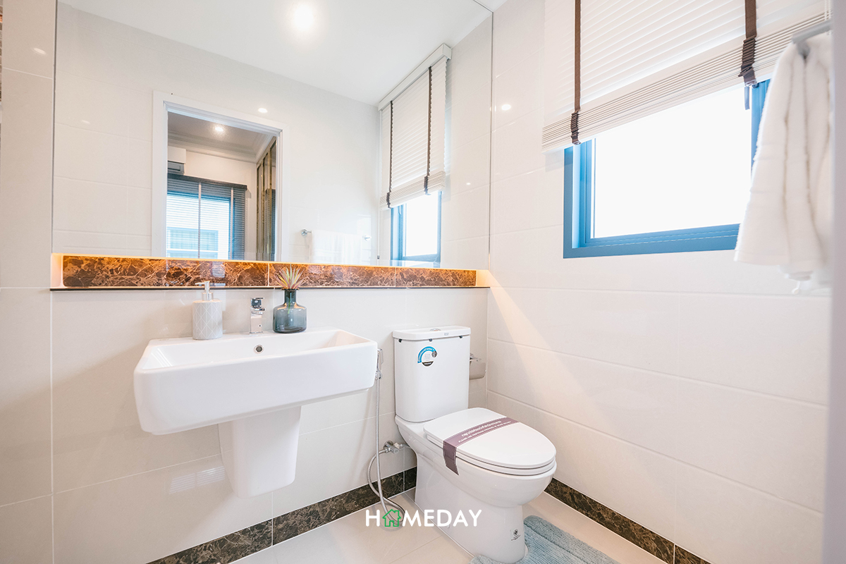 ถัดมาจะเป็นห้องน้ำ Powder Room สำหรับรับแขก ห้องนี้จะมีชุดสุขภัณฑ์พื้นฐานครบครัน มาพร้อมบานกระจกขนาดใหญ่ และบานหน้าต่างระบายอากาศ แต่จะไม่มีในส่วนของ Shower มาให้นะคะ ข้อดีก็คือแขกสามารถใช้ห้องน้ำในการทำธุระส่วนตัวได้ ด้วยไม่ต้องผ่านเข้าไปในพื้นที่ส่วนตัวของเราเลยค่ะ