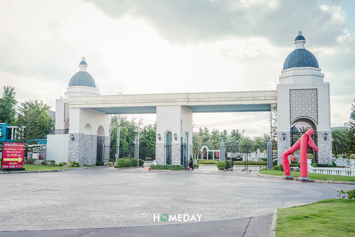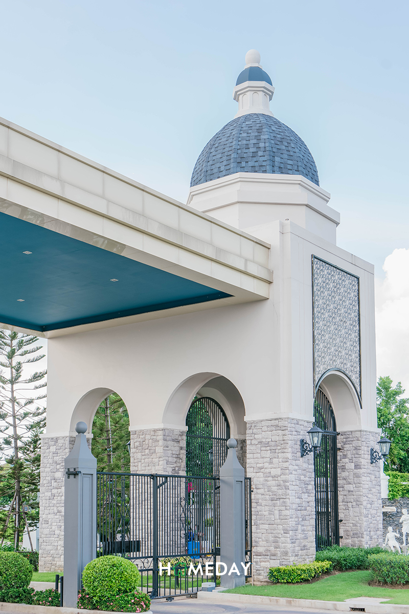 ซุ้มโครงการเห็นโดมสีน้ำเงินโดดเด่นมาแต่ไกลเลยค่ะ ทางเข้าโอ่อ่า หรูหรา มาในสไตล์อิตาลีสมัยใหม่ ที่มีความคลาสสิก แบ่งโซนระหว่างทางเข้าและทางออก กั้นกลางด้วยป้อมของพี่ ๆ รักษาความปลอดภัย