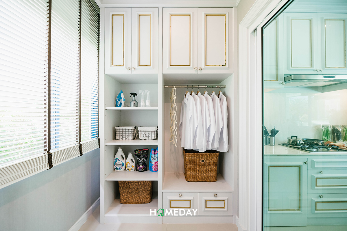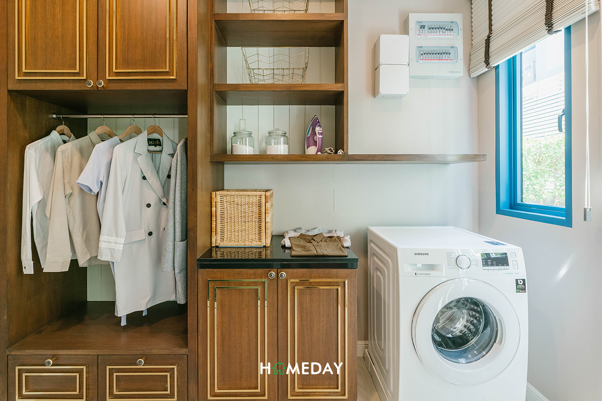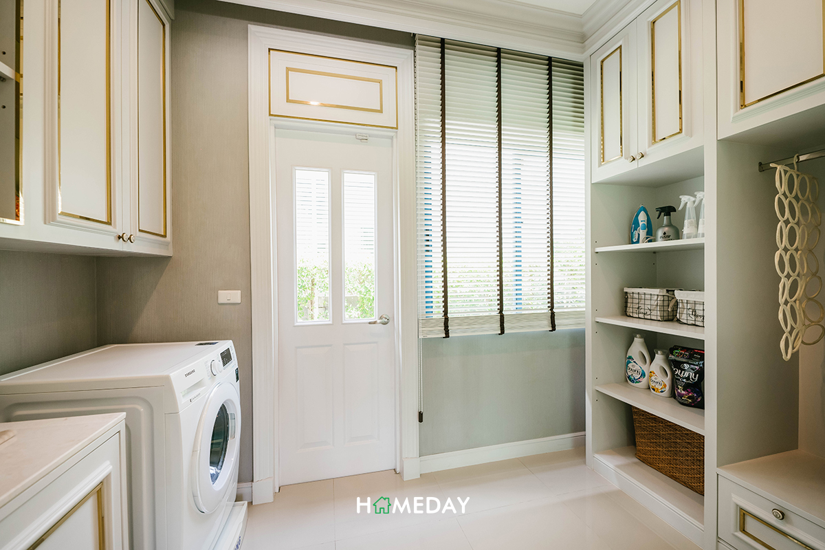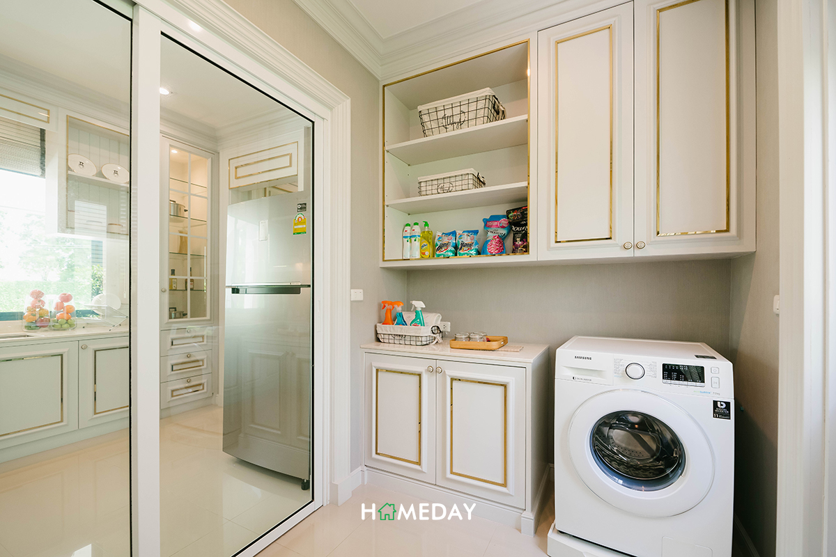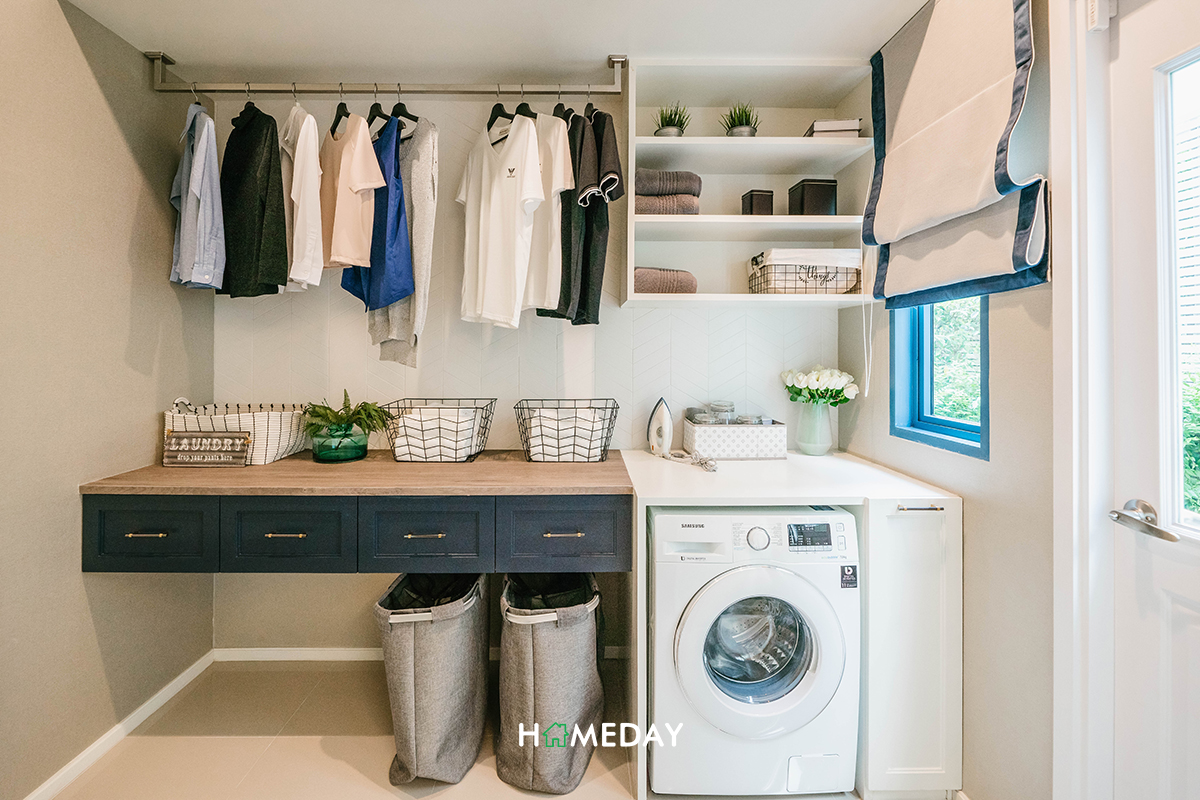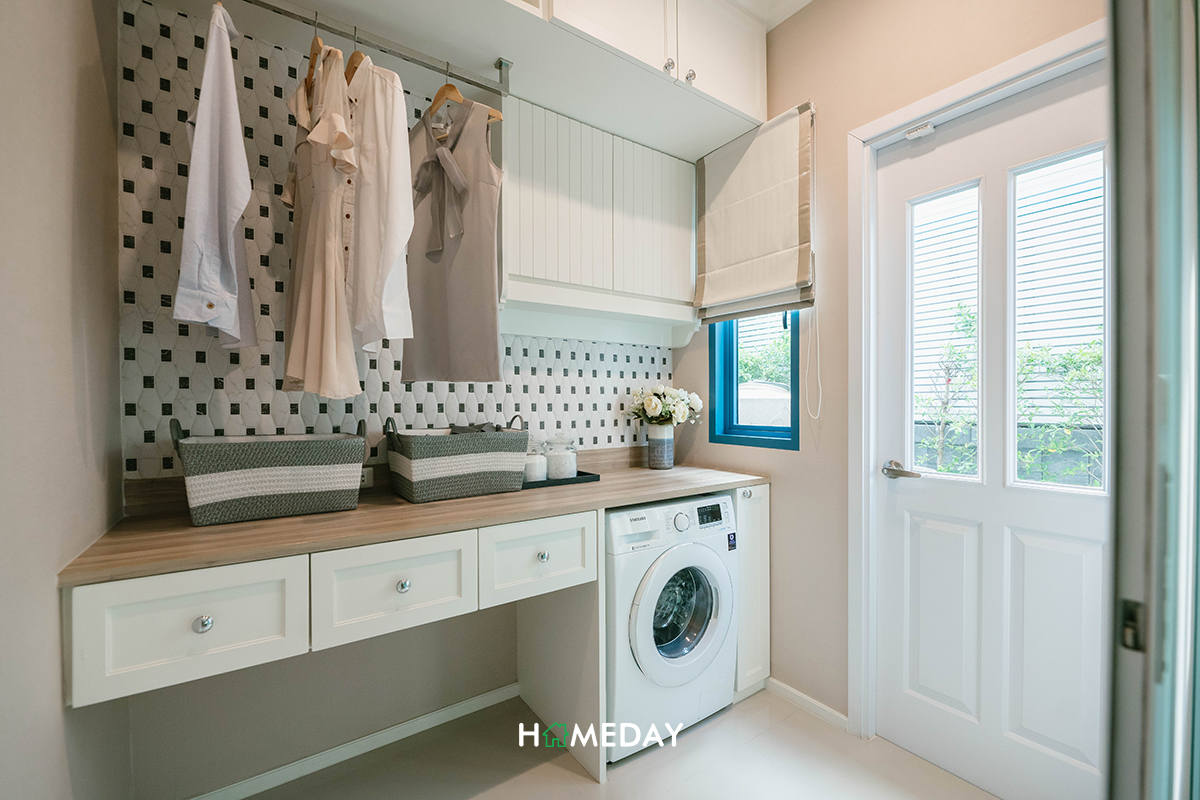 จากห้องครัวติดกัน จะมีประตูกระจกบานเลื่อนที่เชื่อมเราไปสู่ส่วน Laundry ของบ้านค่ะ ภายในจะเป็นพื้นที่โล่ง ๆ ที่เราสามารถจัดสรรพื้นที่เองได้ ด้านในเพียงพอที่จะวางเครื่องซักผ้าและเครื่องอบแห้งได้ค่ะ รวมไปถึงสามารถแขวนเสื้อผ้า และจัดเก็บอุปกรณ์อื่น ๆ ได้ด้วย และห้องนี้ก็ยังมีประตูอีก 1 บานที่เชื่อมไปยังส่วนด้านนอกของบ้านได้ค่ะ