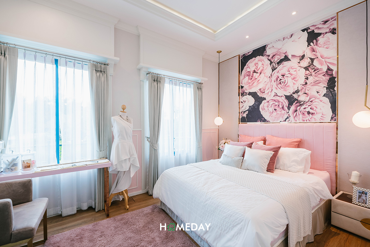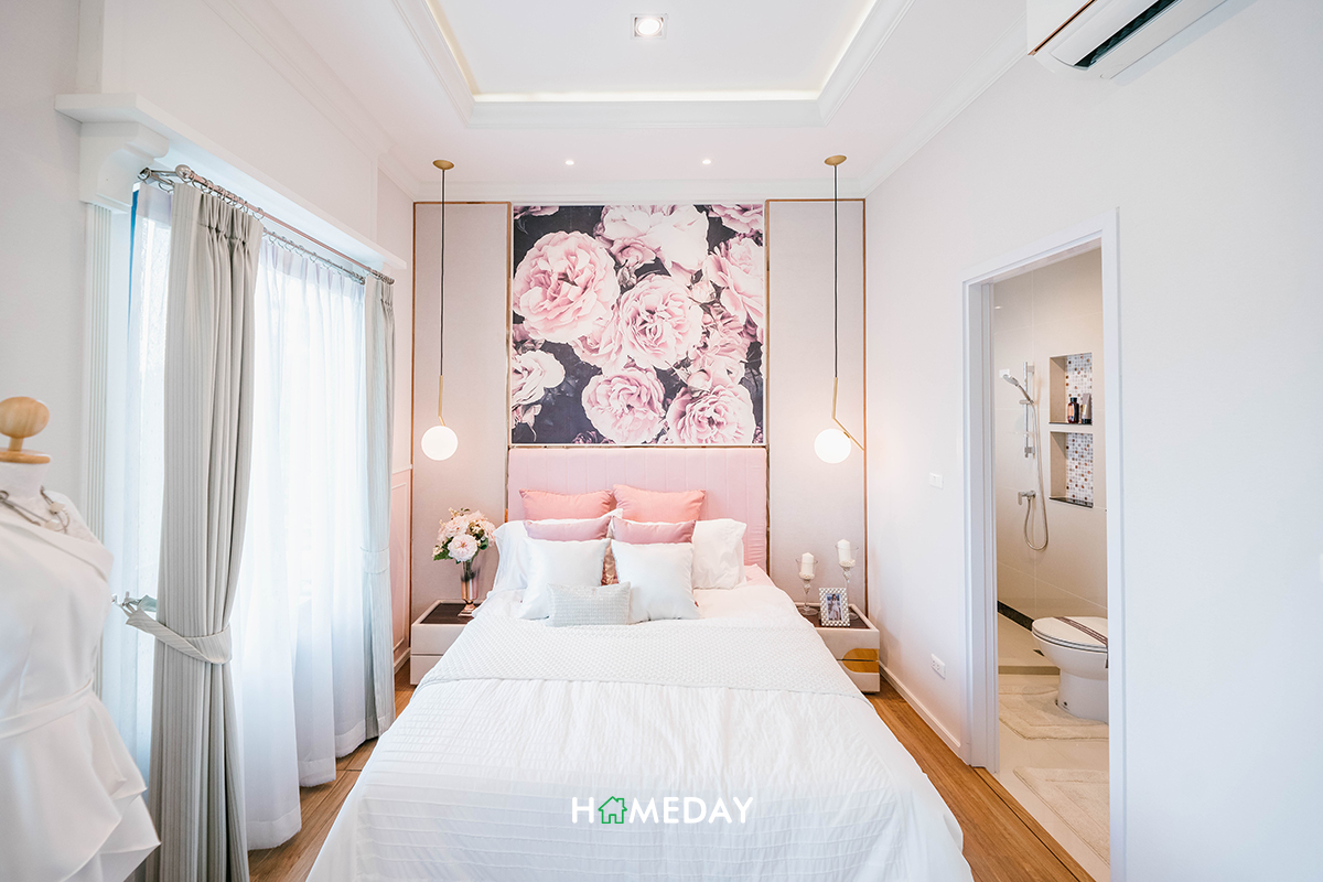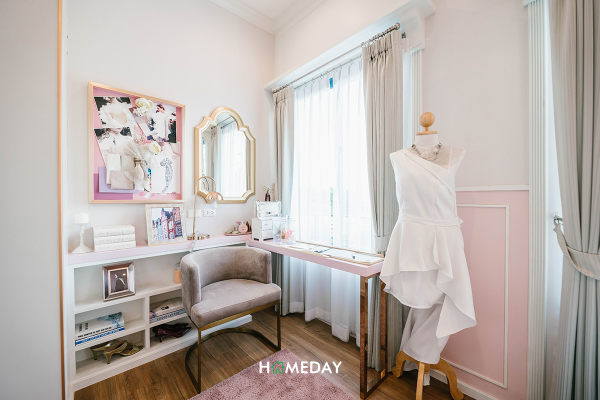 มาต่อที่ Bedroom 2 กันเลยค่ะ ห้องนี้ทางโครงการตกแต่งให้ดูเป็นโทนสีชมพูอ่อน มีความเป็นผู้หญิง ภายในแบ่งพื้นที่เป็นมุมทำงานและมุมพักผ่อนได้อย่างลงตัว ให้บานหน้าต่างขนาดใหญ่มา 2 บาน เปิดรับแสงเข้ามาภายในห้องได้เป็นอย่างดี นำไอเดียนี้ไปตกแต่งเป็นห้องส่วนตัวของตัวเองได้เลยค่ะ เหมาะกับคนที่ชอบทำงานแบบเป็นส่วนตัวในห้องของตัวเอง