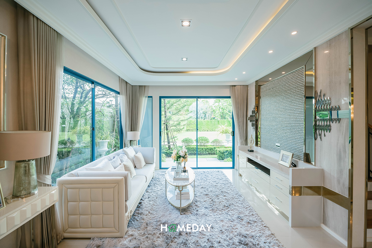 ขยับขยายมาสำรวจบ้านที่มีขนาดใหญ่ขึ้นมาพอสมควรกันค่ะ กับแบบบ้าน Lesina ที่มีพื้นที่จอดรถในร่มมาให้ 3 คัน เมื่อเข้ามาภายในบ้านจากทางเข้าหลัก ก็จะพบกับมุม Living Area ก่อนเหมือนเช่นเคย จากภาพก็จะเห็นได้เลยว่าพื้นที่ระหว่างโซฟาและทีวี ค่อนข้างกว้างทีเดียว เราสามารถเลือกวางโซฟาตัวยาวเข้ามุมลักษณะตัว L พร้อมโต๊ะกลางสำหรับวางของขนาดใหญ่ได้เต็มที่ ไม่ต้องกังวลว่าจะไม่มีพื้นที่ทางเดินค่ะ