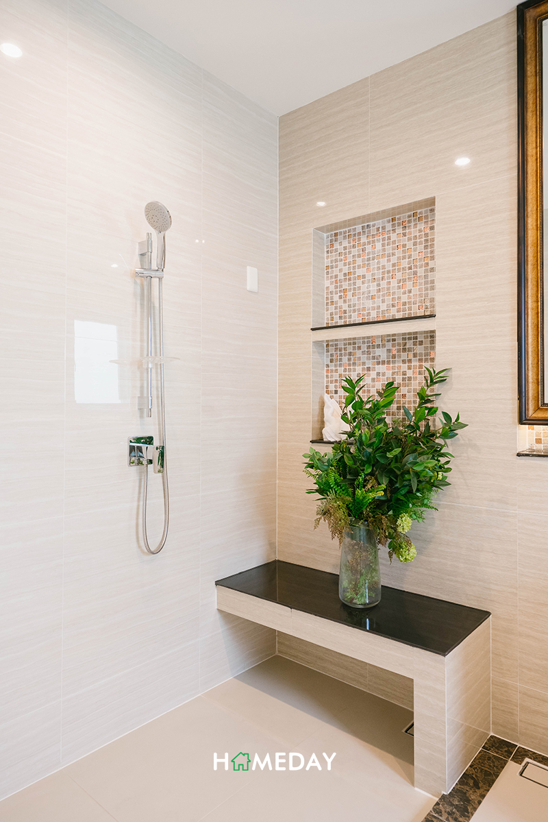 มาถึงส่วนเปียกกันบ้าง ตรงนี้ทางโครงการบิลต์ตัวม้านั่งมาให้ และ Drop Wall มาให้ในขนาดที่ใหญ่มากขึ้น สามารถวางของได้เพิ่มขึ้นเยอะเลยค่ะ เหมาะกับการใช้ห้องน้ำร่วมกัน 2 คนมาก ๆ เลย หรือถ้าใครอยากจะปรับเป็นอ่างอาบน้ำ ก็สามารถรื้อถอนตัวม้านั่งได้เลยค่ะ แนะนำว่าติดตั้ง Partition กั้นแยกส่วนเปียก-แห้งเพิ่ม จะช่วยให้ห้องน้ำมีระเบียบ และดูแลรักษาความสะอาดได้ง่ายขึ้นค่ะ