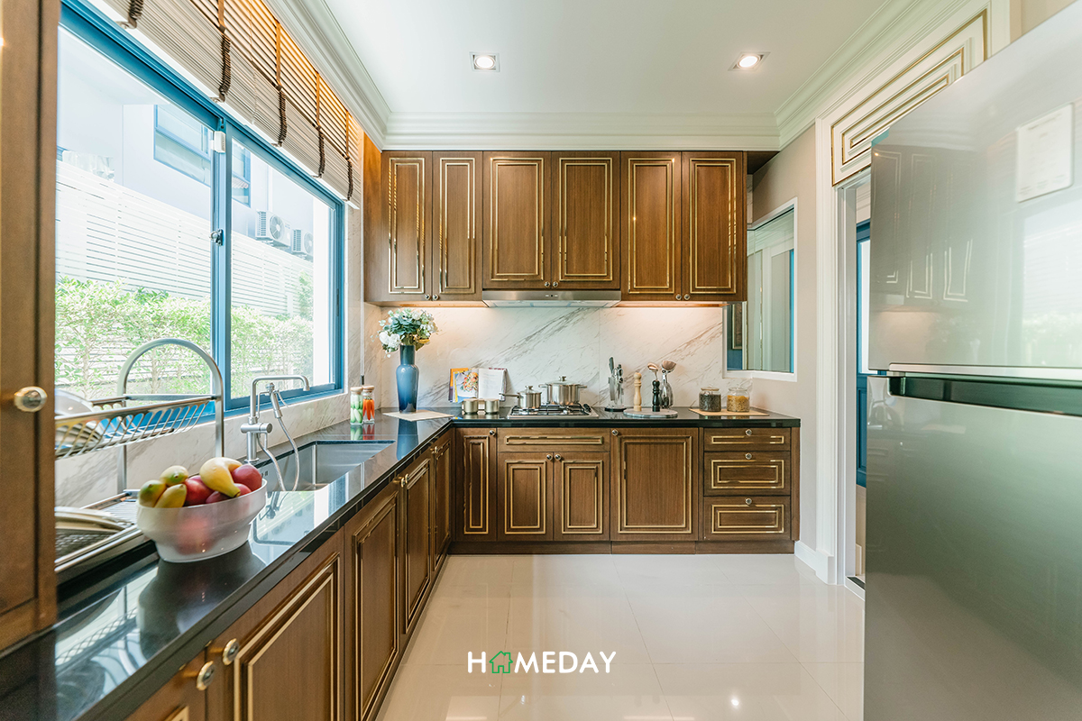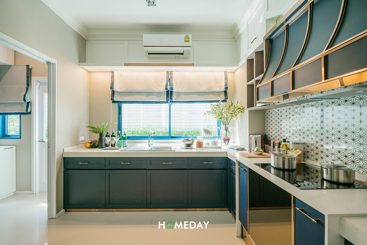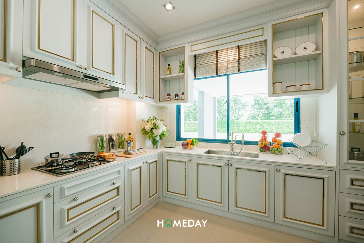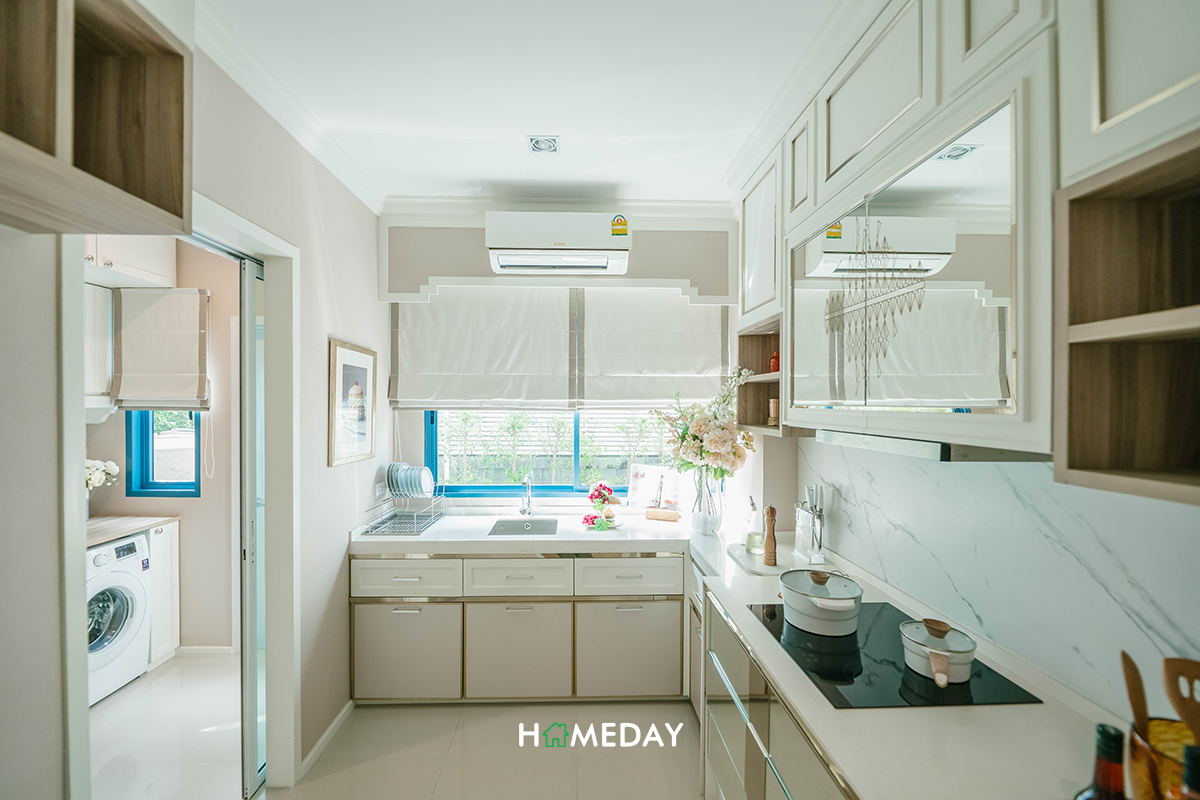 ส่วนครัวของบ้าน ทางโครงการจะให้เป็นห้องเปล่า โดยเราสามารถออกแบบบิลต์ในส่วนของเคาน์เตอร์ครัวและตู้แขวนผนังเพิ่มเติมเองได้ตามดีไซน์ที่เราต้องการเลยค่ะ ตรงส่วนนี้จะสามารถวางเคาน์เตอร์เป็นลักษณะของตัว L ได้ มีพื้นที่สำหรับเตียมอาหารและวางอุปกรณ์ต่าง ๆ ได้เพียงพอแน่นอนค่ะ นอกจากนี้ก็ยังมีบานหน้าต่างขนาดใหญ่ไว้ให้ด้วย สามารถเปิดออกเพื่อระบายกลิ่นอาหารได้