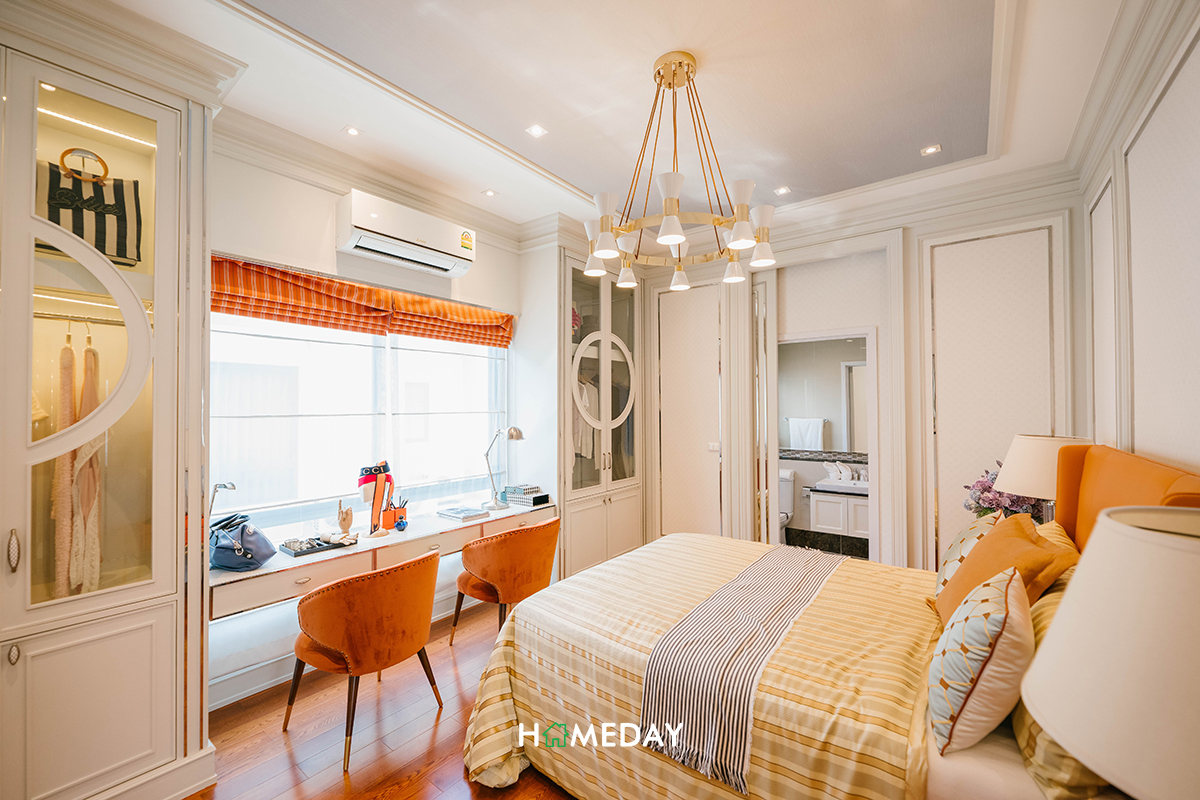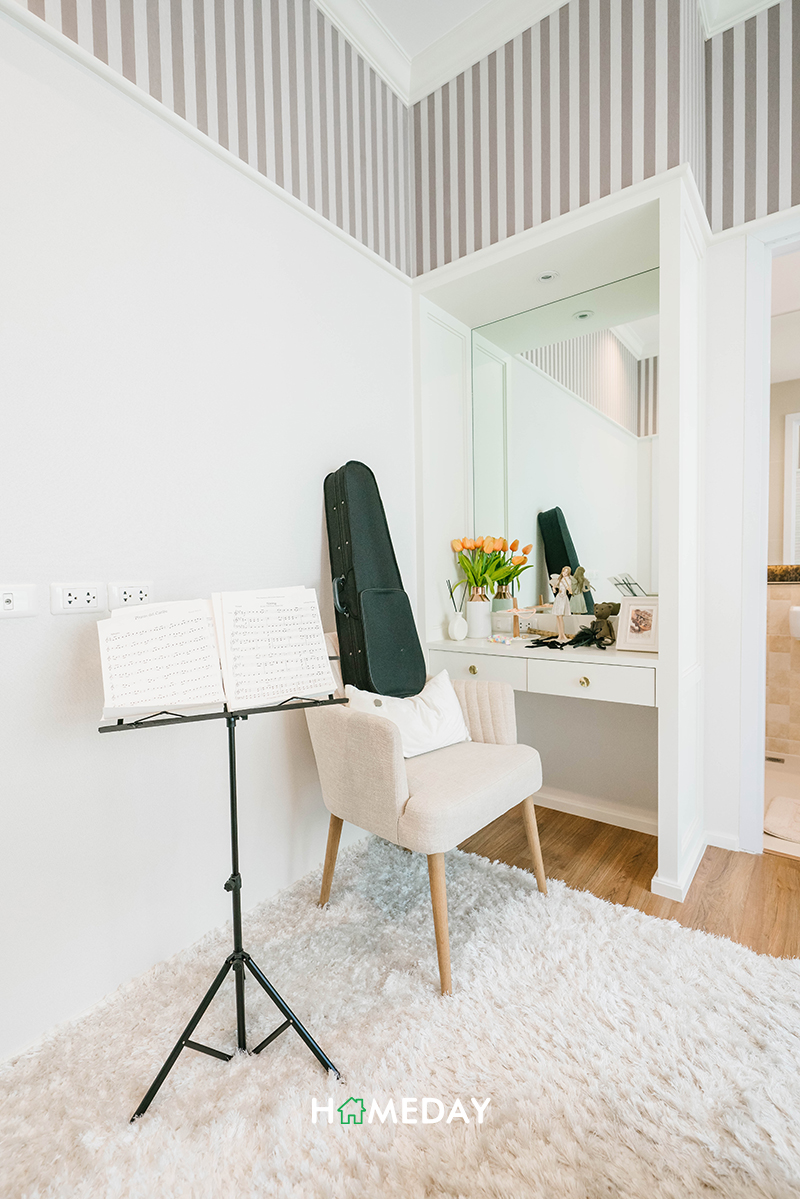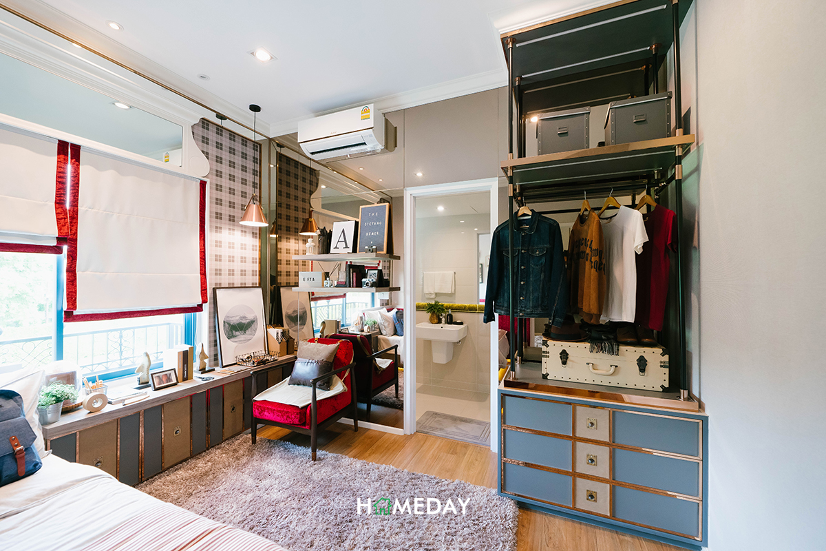 ปลายเตียงสามารถวางตู้เสื้อผ้า โต๊ะเครื่องแป้ง โต๊ะทำงานได้เลย ยังเหลือพื้นที่ให้เดินเข้าออกได้แบบไม่ติดขัดค่ะ