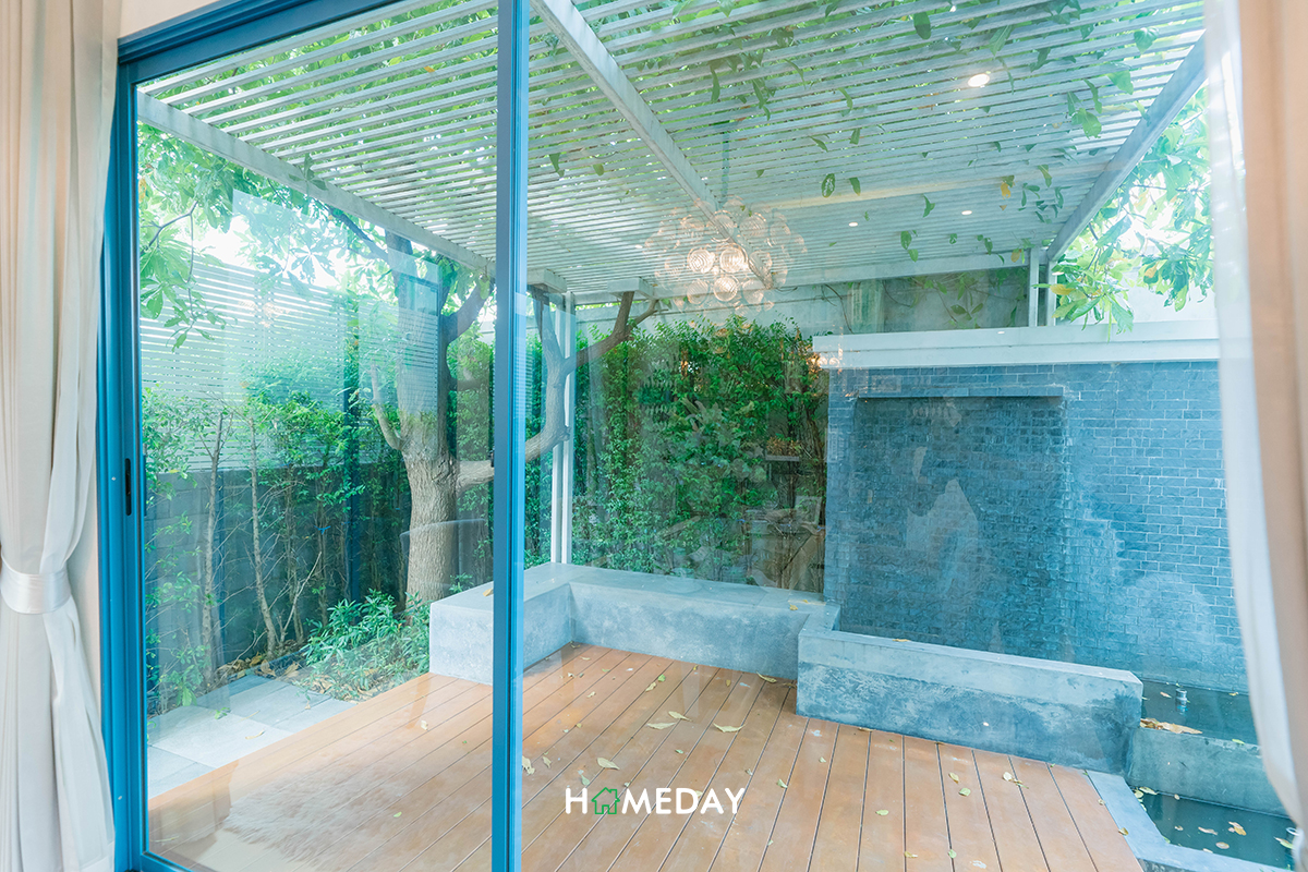 ติดกับพื้นที่นั่งรับประทานอาหาร จะเป็นประตูบานเลื่อนที่สามารถเปิดออกเชื่อมไปยังสวนด้านข้างของตัวบ้านได้ค่ะ ทางโครงการได้จัดบ้านตัวอย่างให้ดูเป็นแนวทาง โดยการใช้ระแนงไม้ปูเป็นส่วนของพื้น สำหรับให้เป็นมุมนั่งเล่นพักผ่อนในสวน
