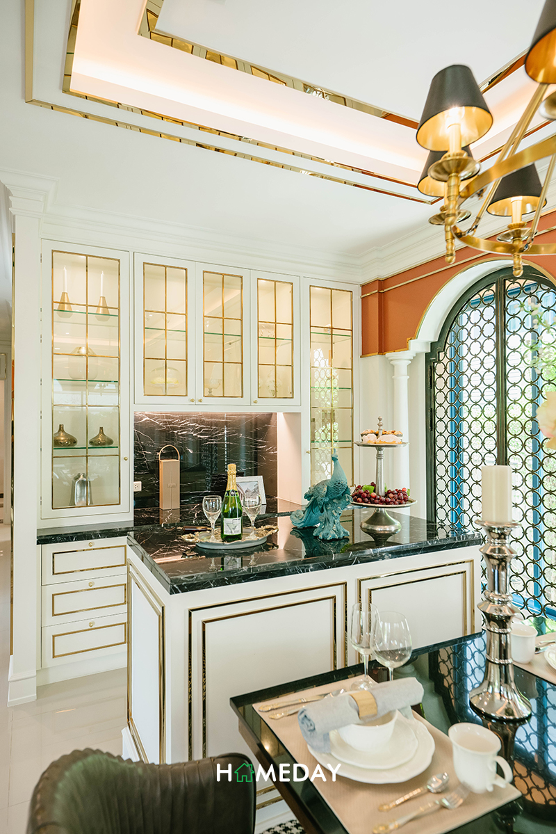 เพราะนอกจากเราจะสามารถวางชุดโต๊ะนั่งรับประทานอาหารขนาด 8 ที่นั่งได้แล้ว เรายังจัดมุมบาร์สำหรับเครื่องดื่ม หรือไว้ใช้เป็นมุมเตรียมอาหารเล็ก ๆ ที่บริเวณนี้ได้ด้วย บอกเลยว่าพื้นที่เหลือค่อนข้างเยอะค่ะ ถ้าสมาชิกในบ้านไม่ได้เยอะมาก ก็อาจจะใช้เป็นชุดโต๊ะทานข้าวเล็ก ๆ แล้วไปเพิ่มพื้นที่ใช้สอยในส่วนอื่น ๆ แทนก็ได้ค่ะ