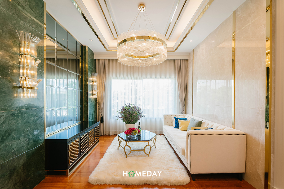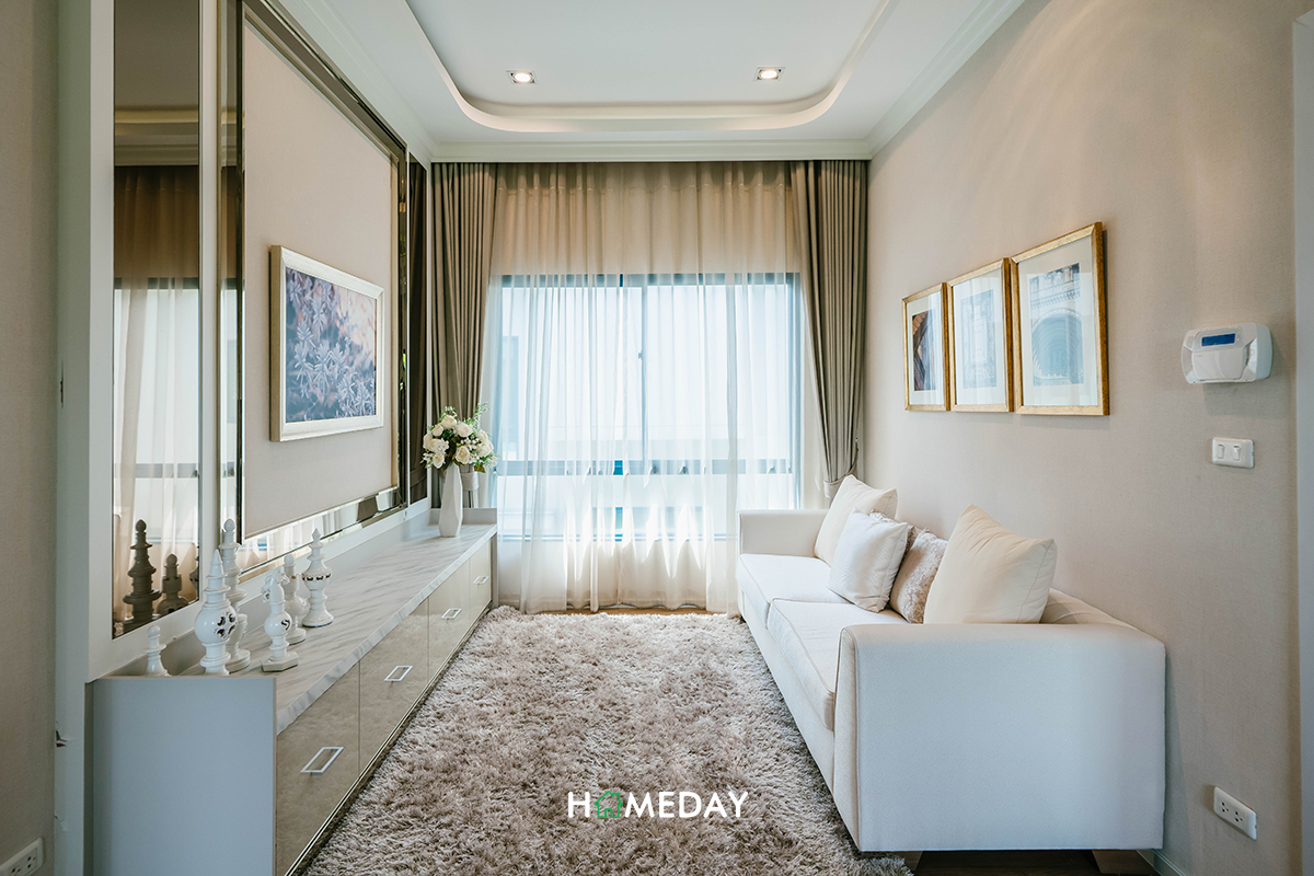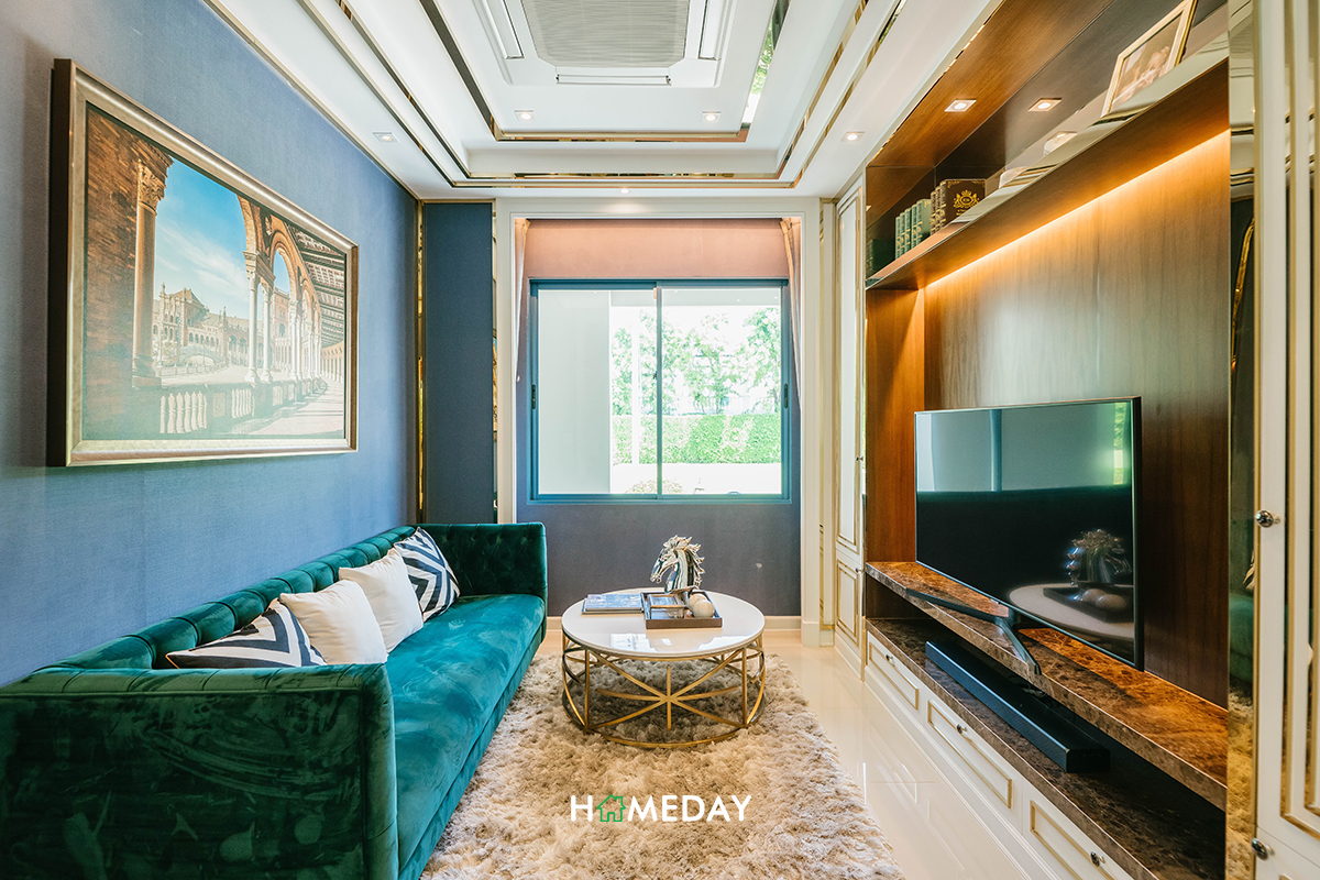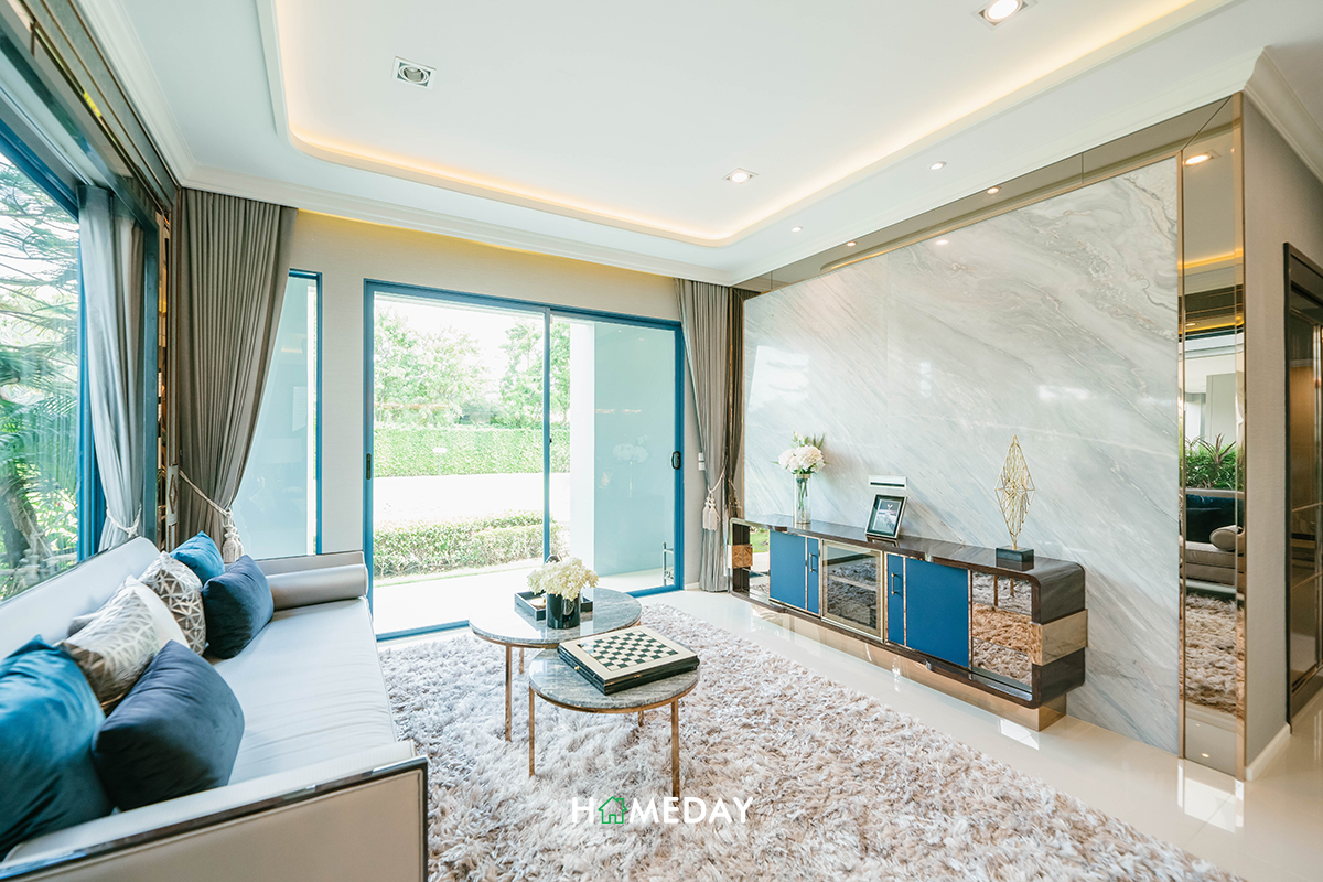 เมื่อเปิดเข้ามาภายในจากทางเข้าหลักก็จะพบกับ Living Area ขนาดกว้าง ที่สามารถรองรับพื้นที่พักผ่อนของครอบครัวและพื้นที่รับแขกได้สบาย ๆ พื้นที่วางโซฟาสามารถเลือกวางแบบเข้ามุมตัว L ได้ พร้อมโต๊ะกลาง แบบที่ยังมีพื้นที่เหลือให้เดินเข้าออกได้สะดวกแน่นอน ในส่วนของชั้นวางทีวีก็เหลือ ๆ เลยค่ะ บิลต์ชั้นเก็บของเพิ่มเติมพร้อมแขวนทีวีขนาดใหญ่ได้เลย