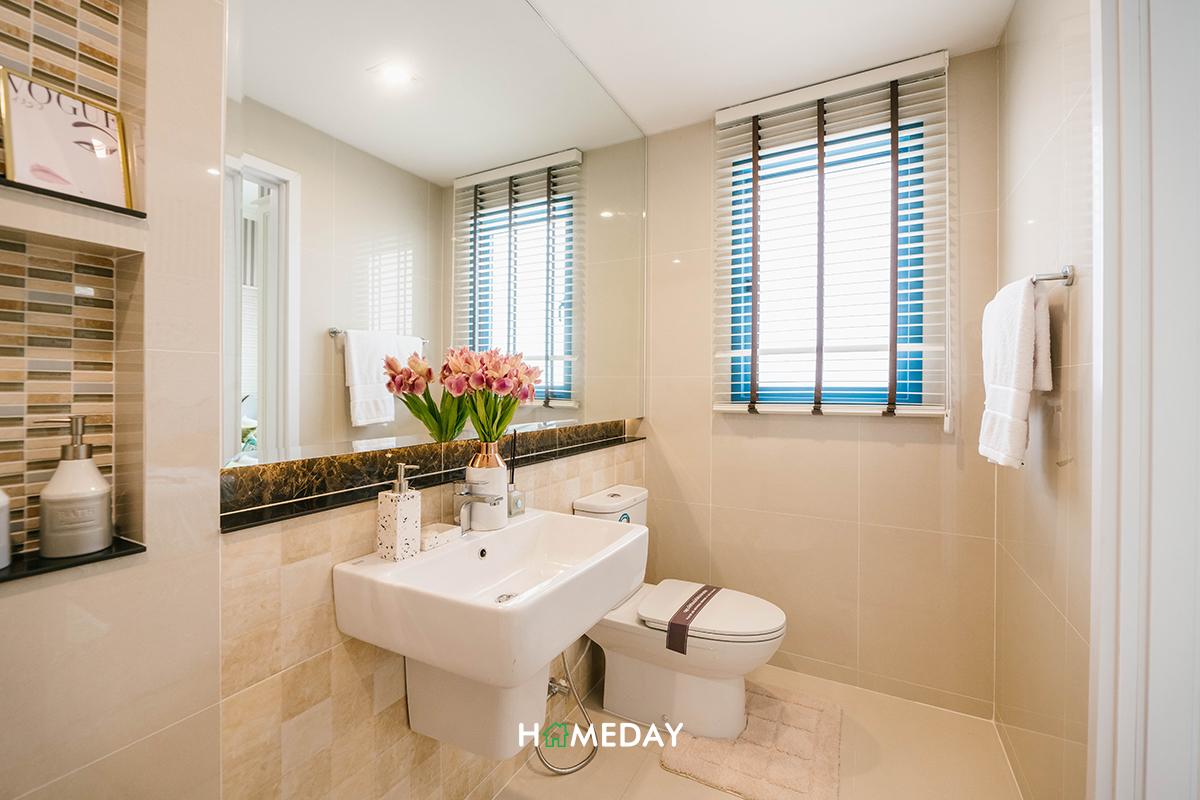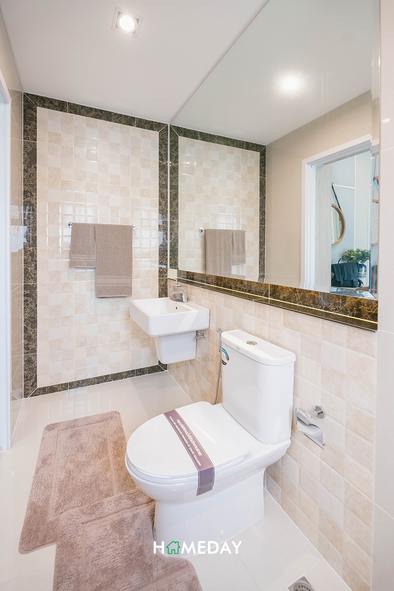 ตัวห้องน้ำส่วนตัวภายใน Bedroom 2 ได้กระจกบานใหญ่มาเต็มที่เลยค่ะ ช่วยทำให้ห้องดูกว้างขึ้นด้วย นอกจากนี้ก็มีบานหน้าต่างช่วยรับแสงให้ห้องในเวลากลางวันและช่วยระบายอากาศ ไม่ต้องกังวลเรื่องกลิ่นอับเลย ทางด้านของฟังก์ชันการใช้งานต่าง ๆ และชุดสุขภัณฑ์ ก็ให้มาครบ เหมือนห้องน้ำ Master Bedroom ทุกประการเลยค่ะ