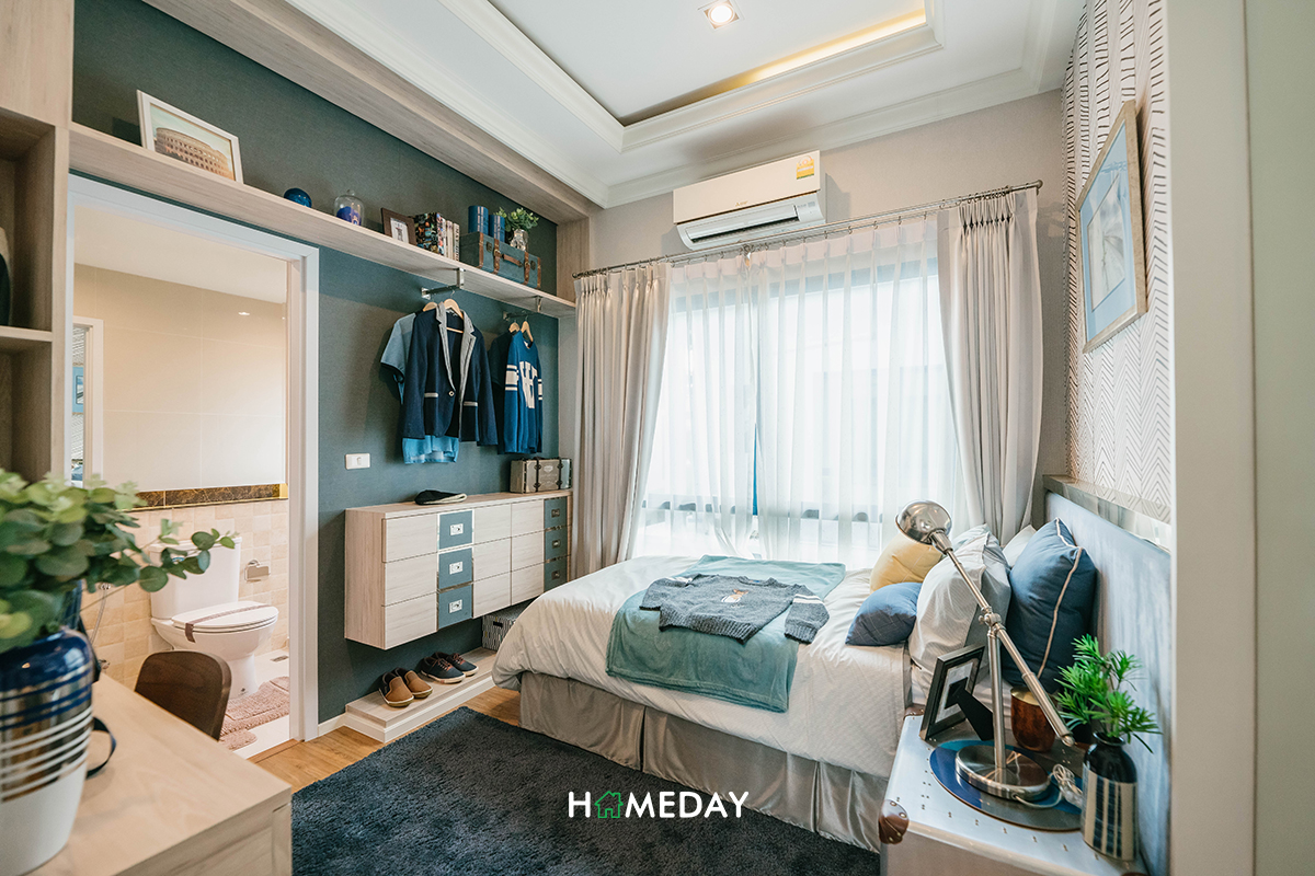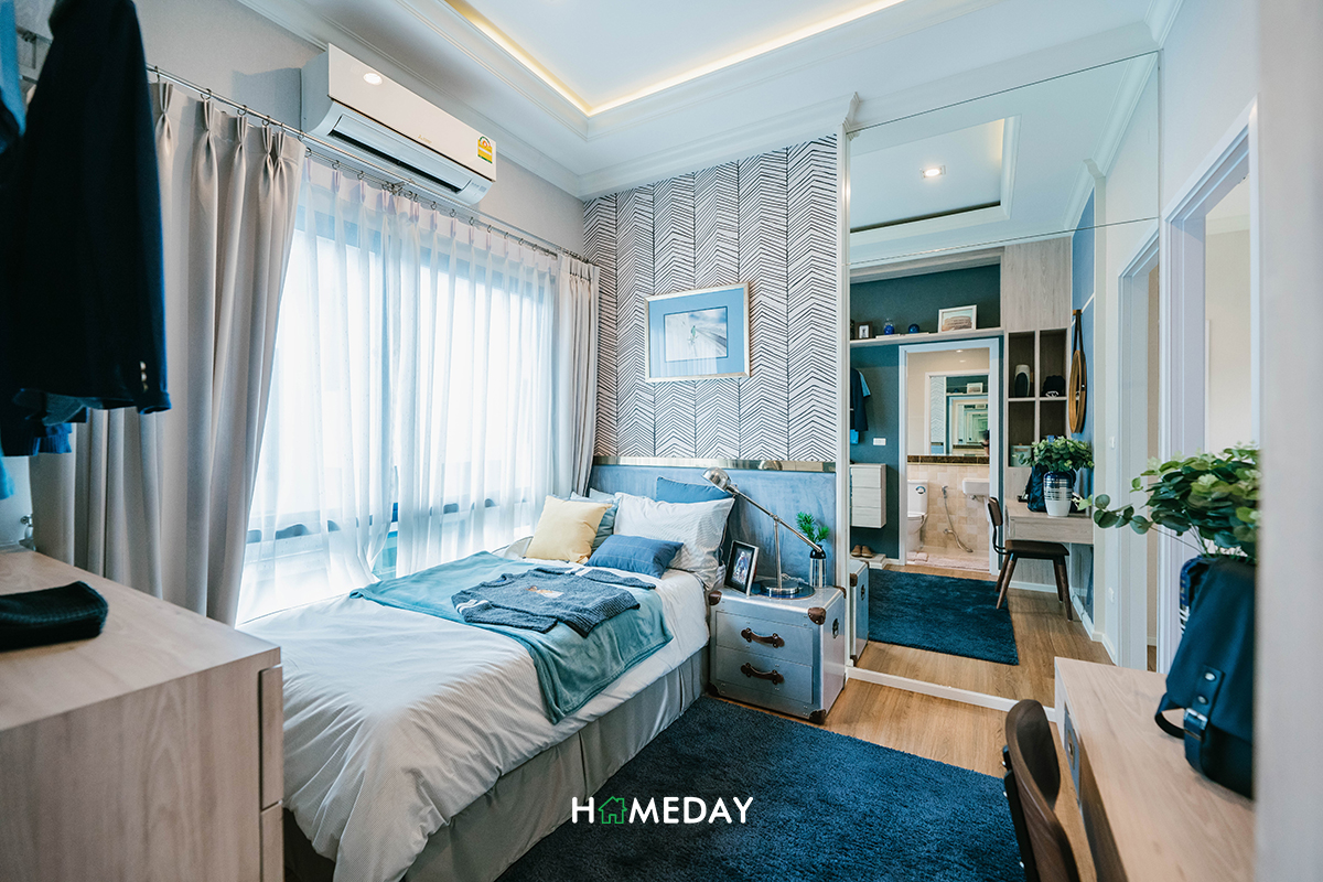 มาต่อที่ Bedroom 2 กันเลย ห้องนี้ถ้าอยากวางเตียงใหญ่ขนาด 5 ฟุต ก็วางได้เลยนะคะ ไม่มีปัญหาเลย เพราะห้องมีพื้นที่มาให้พอสมควร แต่ถ้าอยากได้พื้นที่เก็บของเพิ่มสักหน่อย วางเป็นเตียง 3.5 ฟุต ตามแบบห้องตัวอย่างจะลงตัวกว่าค่ะ