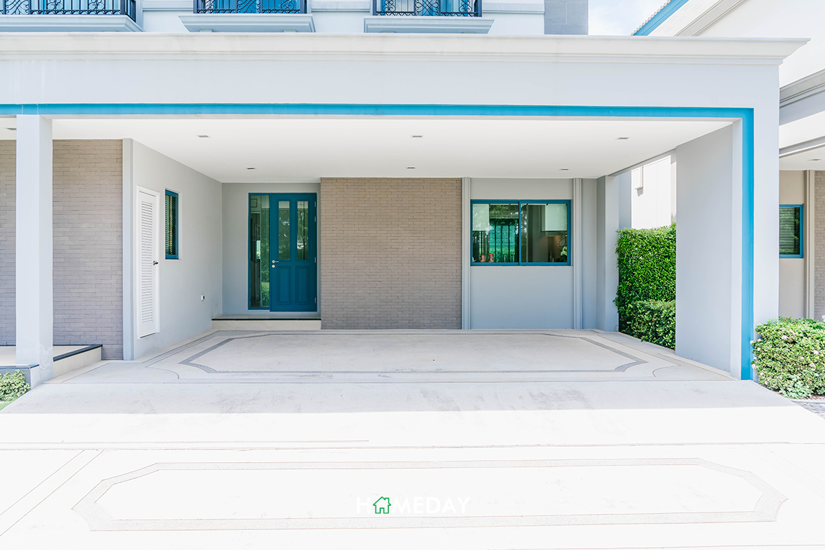 ปิดท้ายกันด้วย Garcia แบบบ้านพื้นที่ใช้สอย 300 ตร.ม. ซึ่งเป็นขนาดที่ใหญ่ที่สุดของทางโครงการกันค่ะ ด้านหน้าบ้าน มีพื้นที่จอดรถให้ 3 คัน มาพร้อมประตูทางเข้าสำรองค่ะ ส่วนประตูบานขาวเล็ก ๆ ด้านซ้ายมือในภาพ จะเป็นในส่วนของห้องเก็บของค่ะ สามารถใช้จัดเก็บอุปกรณ์ทำสวน, อุปกรณ์ล้างรถ หรือข้าวของเครื่องใช้อื่น ๆ ได้พอสมควรค่ะ