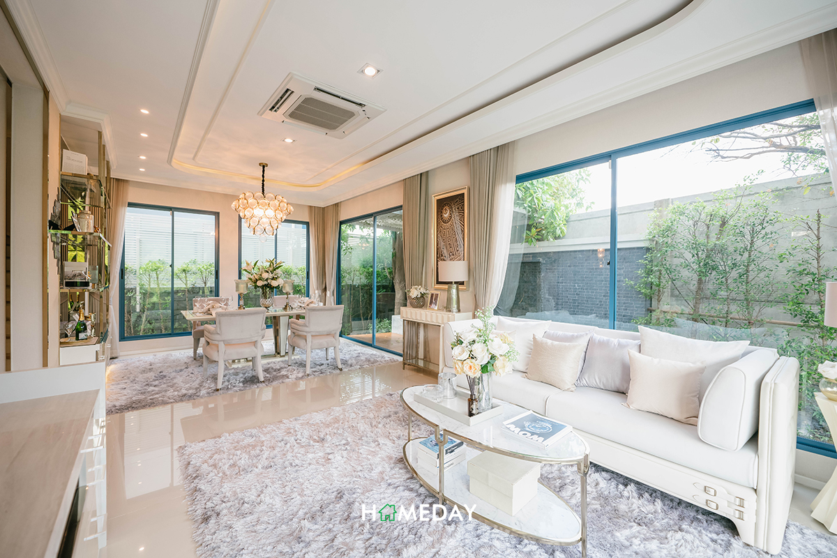 ถัดเข้าไปด้านในจะเป็นพื้นที่วางชุดโต๊ะนั่งรับประทานอาหาร ที่เชื่อมต่อกับพื้นที่ในส่วนของ Living Area ตัวบานกระจกทางโครงการให้มารอบด้านแบบ Open Plan รับแสงธรรมชาติสาดส่องเข้ามาได้แบบเต็ม ๆ ทำให้บ้านยิ่งดูโปร่งและกว้างมากขึ้นไปอีกค่ะ