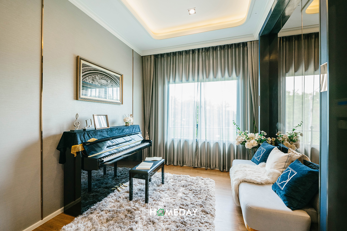 เมื่อเดินขึ้นบันไดมาถึงยังชั้น 2 จะพบกับโถงส่วนกลางและชั้นลอยอเนกประสงค์ค่ะ ส่วนนี้ทางโครงการวางเปียโนพร้อมโซฟาสำหรับนั่งพักผ่อนเอาไว้ให้ดูเป็นแนวทางในการแต่งบ้านค่ะ ส่วนชั้นลอยออกแบบให้ดูเป็นห้องพระสไตล์โมเดิร์น โดยส่วนนี้จะมีบานหน้าต่างเล็ก ๆ ไว้ให้ 2 บาน รับแสงในเวลากลางวันได้เพียงพอสำหรับการใช้งานค่ะ